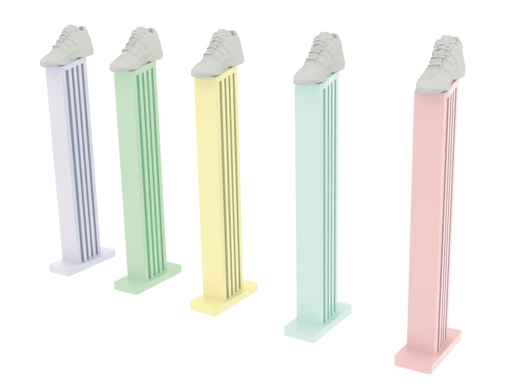 topánkou. Lamely stojanu sú vyrezané do obrysov podrážky topánky tak aby stojan nebral všetku pozornosť ľudského oka naň, ale na topánku samotnú. Sklon stojanu je pod stupňom 22° tak aby bolo topánku dobre vidieť z každého uhlu pohľadu. Primárny materiál stojanu je HPS doska, ktorá je ľahká a dobre opracovateľná, ale keby boli väčšie nároky na vzhľad je možné ho zhotoviť aj z železných plechov.
