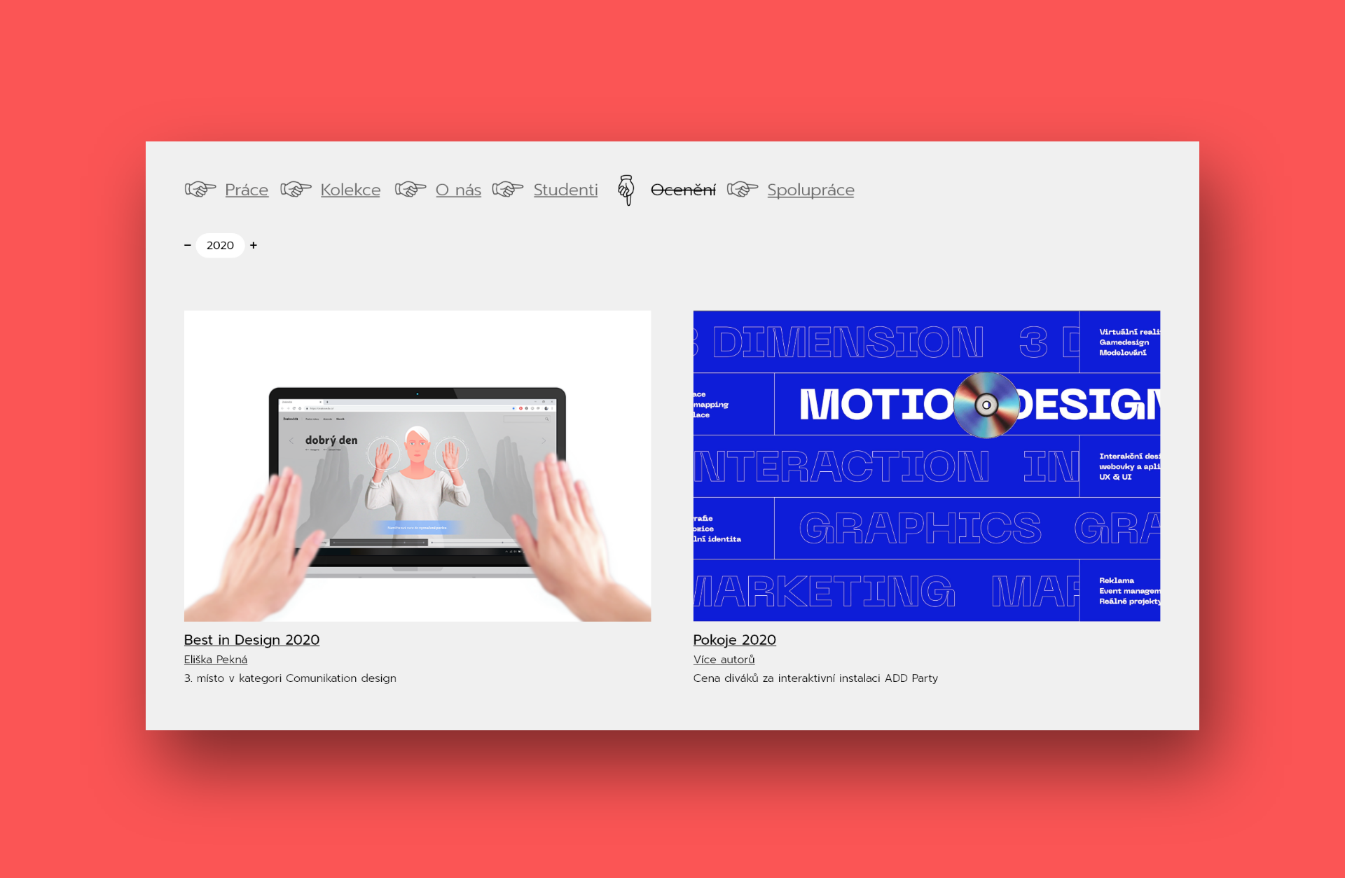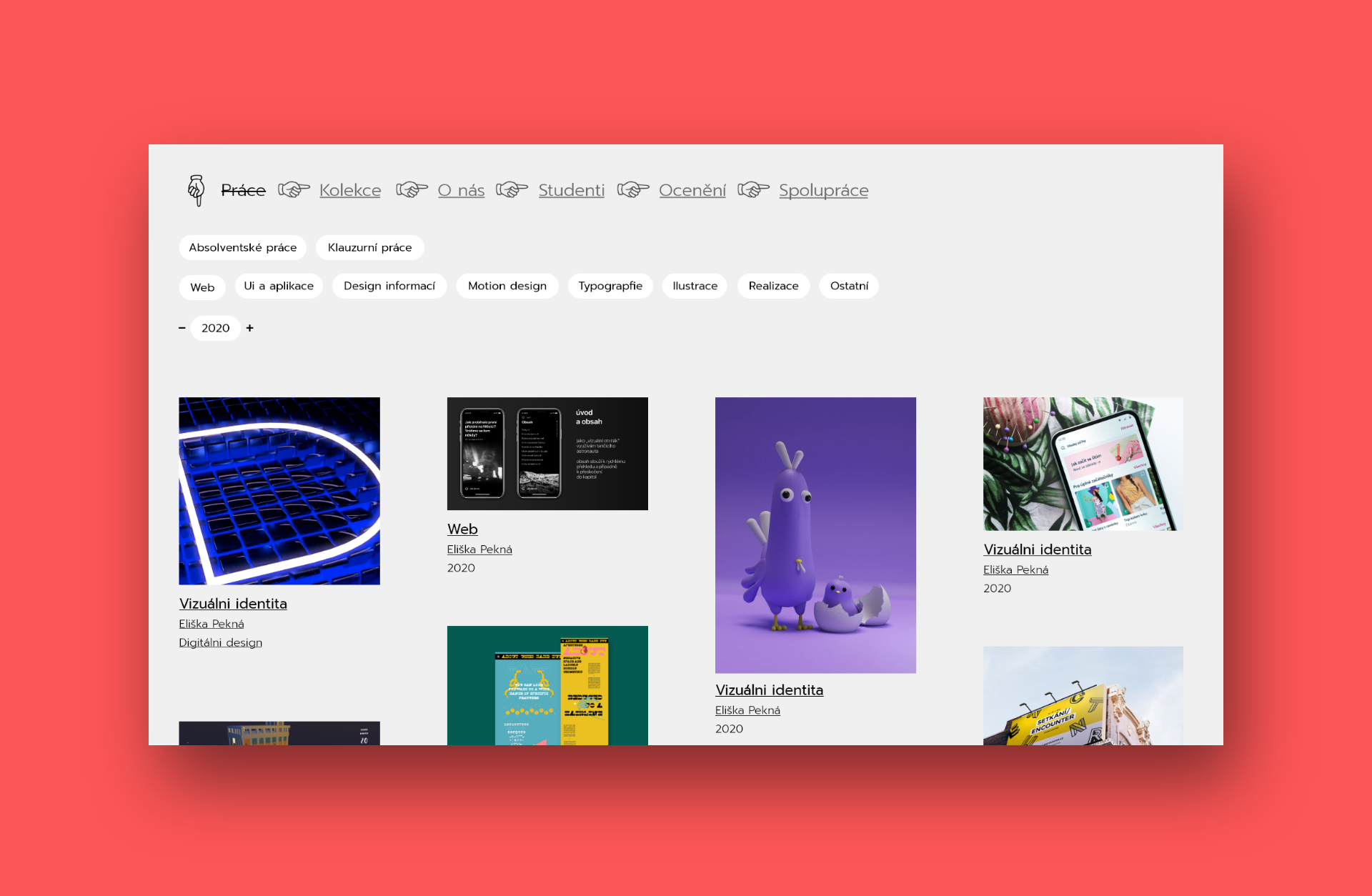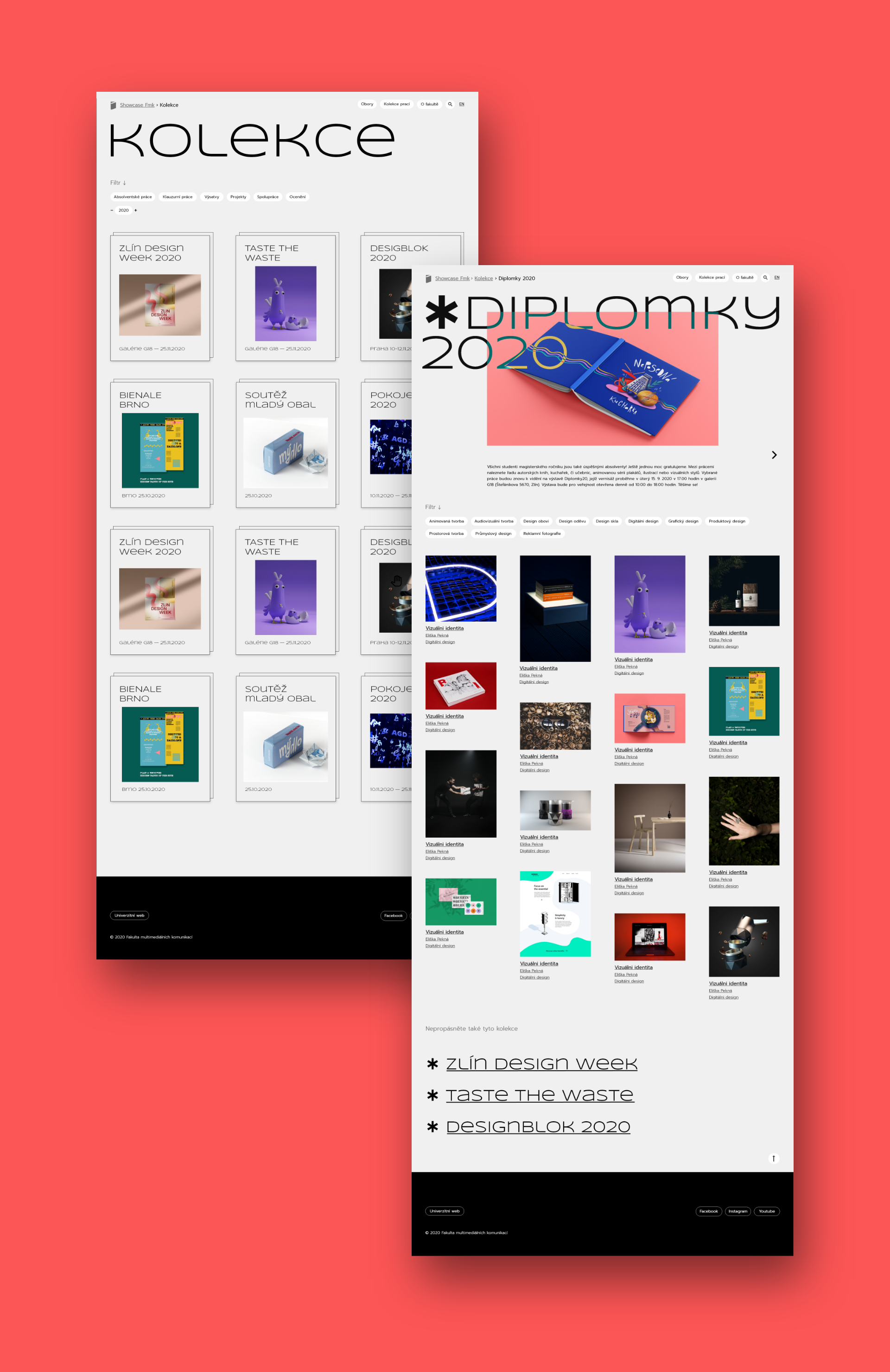 Zadaním bolo vytvoriť showcase prací študentov pre všetky ateliéry a ústavy fakulty multimediálnych komunikácií. V mojom návrhu kladiem dôraz na výraznú typografiu a prácu s typografickými symbolmi a znakmi na jednoduchom pozadí. Základom je práca s rôznymi formátmi obrázkov a filtrami, kde si môžeme navoliť viacero variant. Hlavným pútačom úvodnej stránky je náhľadový obrázok alebo video prác z vybranej kolekcie.