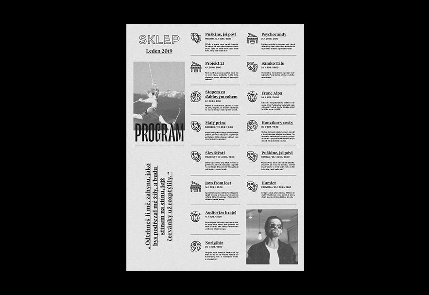 Printový mesačný program Zlínskeho študentského klubu. Celý vizuál pracuje s výraznou typografiou a čiernobielou tlačou na farebných papieroch.