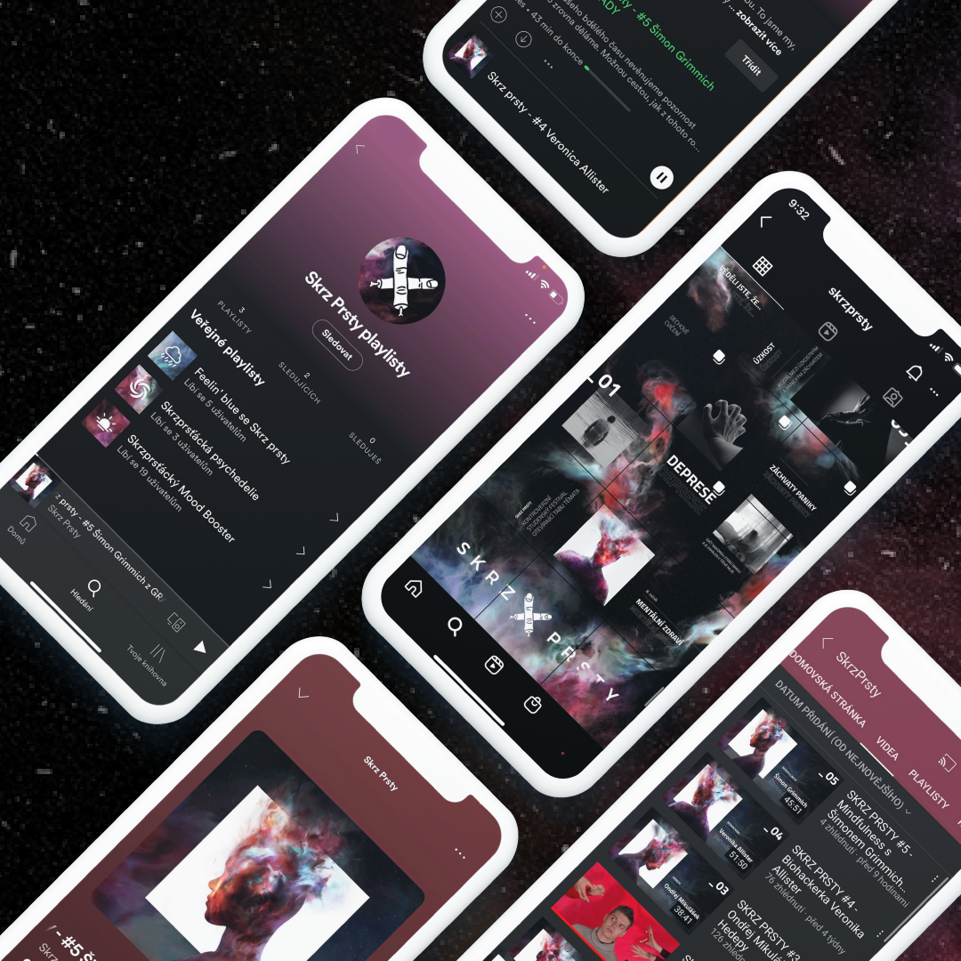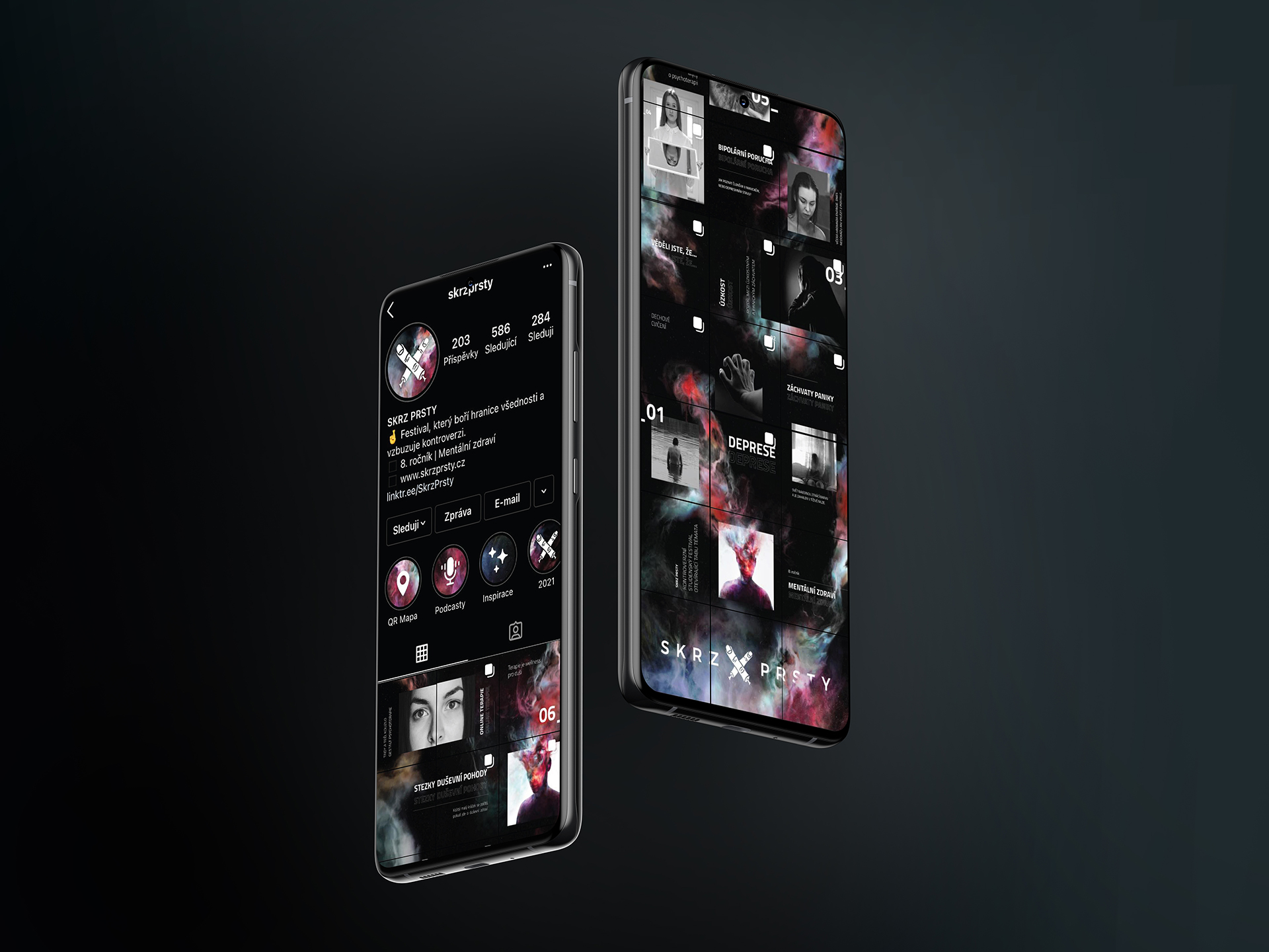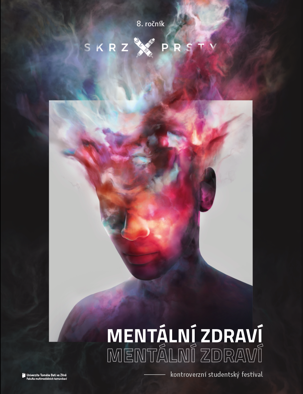 Vytvářeli jsme vizuální identitu pro další ročník studentského festivalu Skrz Prsty, který se zabývá kontroverzníma tématy. Osmý ročník se zabýval tématem mentálního zdraví. Hlavní motiv je 3D hlava neurčitého pohlaví, ve které proudí myšlenky ve formě barevné mlhoviny a následně vychází ven z hlavy do okolí. Mlhovinu dále používáme na sociálních sítích jako metaforu plujících myšlenek. Dále na plakátu používáme bílé čtverce, které symbolizují okno do duše. Celý vzhled je tmavý, protože toto téma je vážné a nemělo by se brát na lehkou váhu. Poslední grafický prvek je rozdvojené písmo, které má odrážet vnitřek a venek člověka.