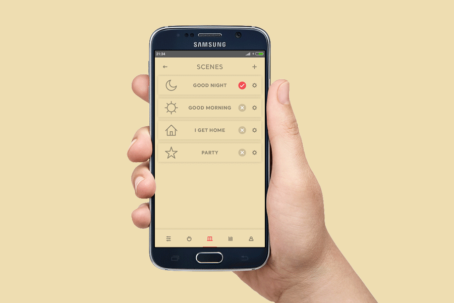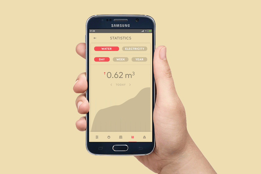 Design mobilní aplikace pro ovládání chytré domácnosti je minimalistický s použitím dvou barev (béžová a červená). Architektura aplikace je omezena na dvě úrovně. Menu má 6 položek: rooms, devices, scenes, statistics, users a notifications. Aplikace umožňuje jednoduché ovládání spotřebičů v rámci celého domu, ale i ovládání zařízení v konkrétní místnosti. Součástí řešení je sada více než třiceti ikonek.