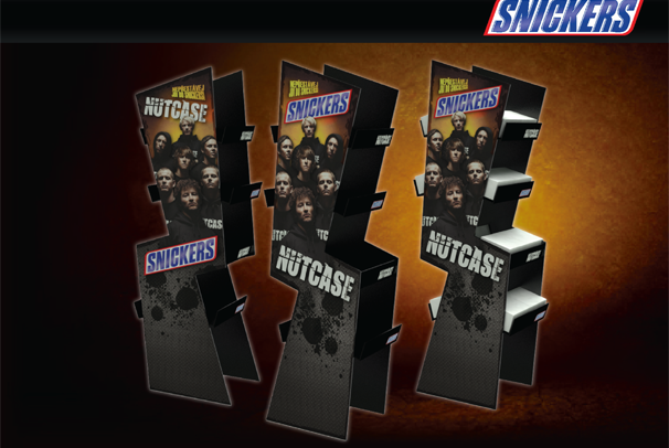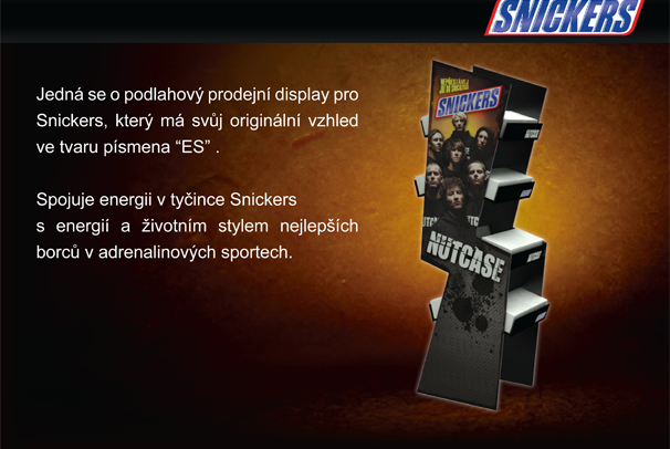 Jedná se o podlahový prodejní display pro Snickers, který má svůj originální vzhled ve tvaru písmena “S” . Můj návrh navazuje na reklamní kampaň Snickers NUTCASE, která je agresivní, dynamická, ostrá a specificky cílená. Spojuje energii v tyčince Snickers s energií a životním stylem nejlepších borců v adrenalinových sportech. Je tedy určená pro mladé spotřebitele, kteří potřebují doplnit energii.