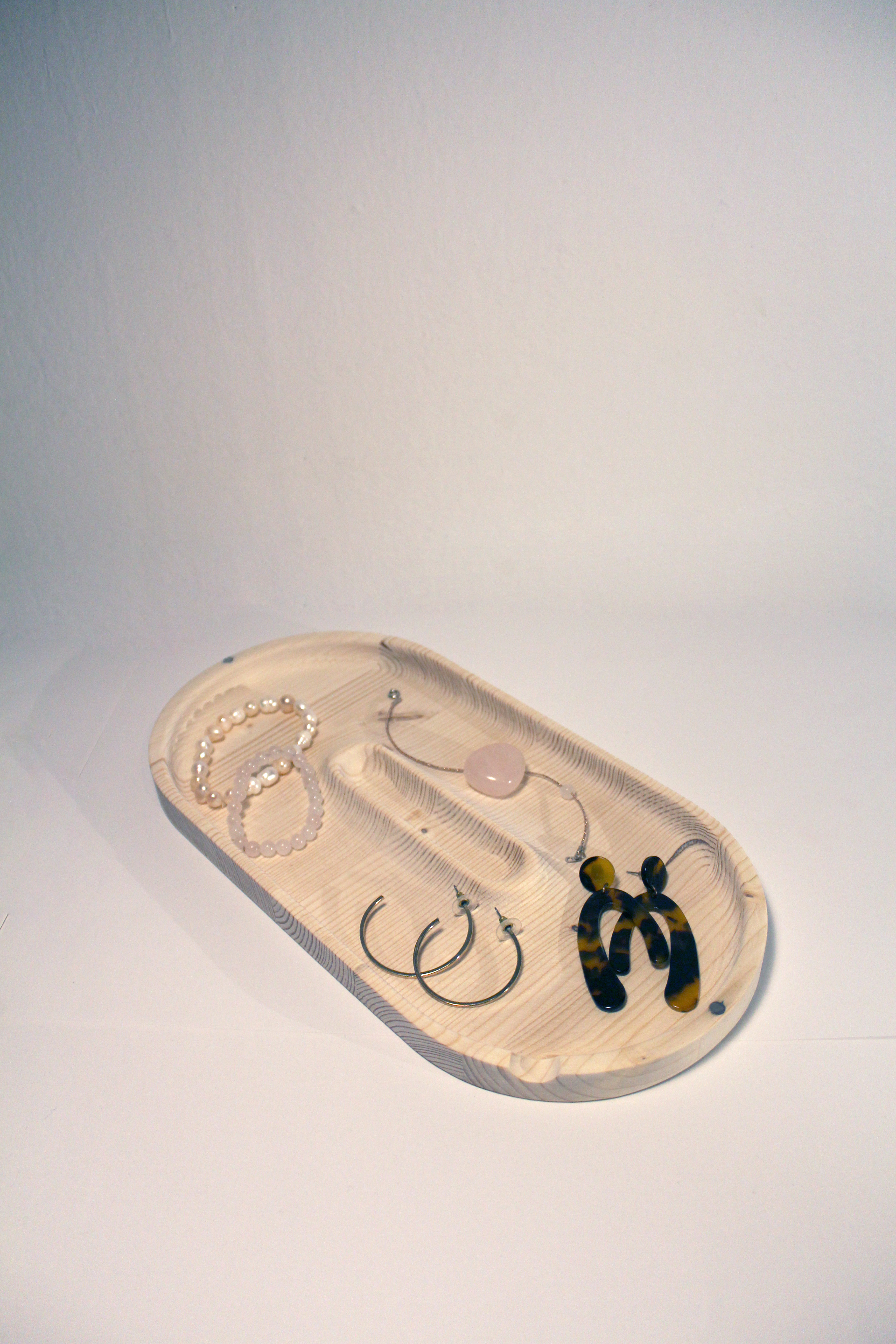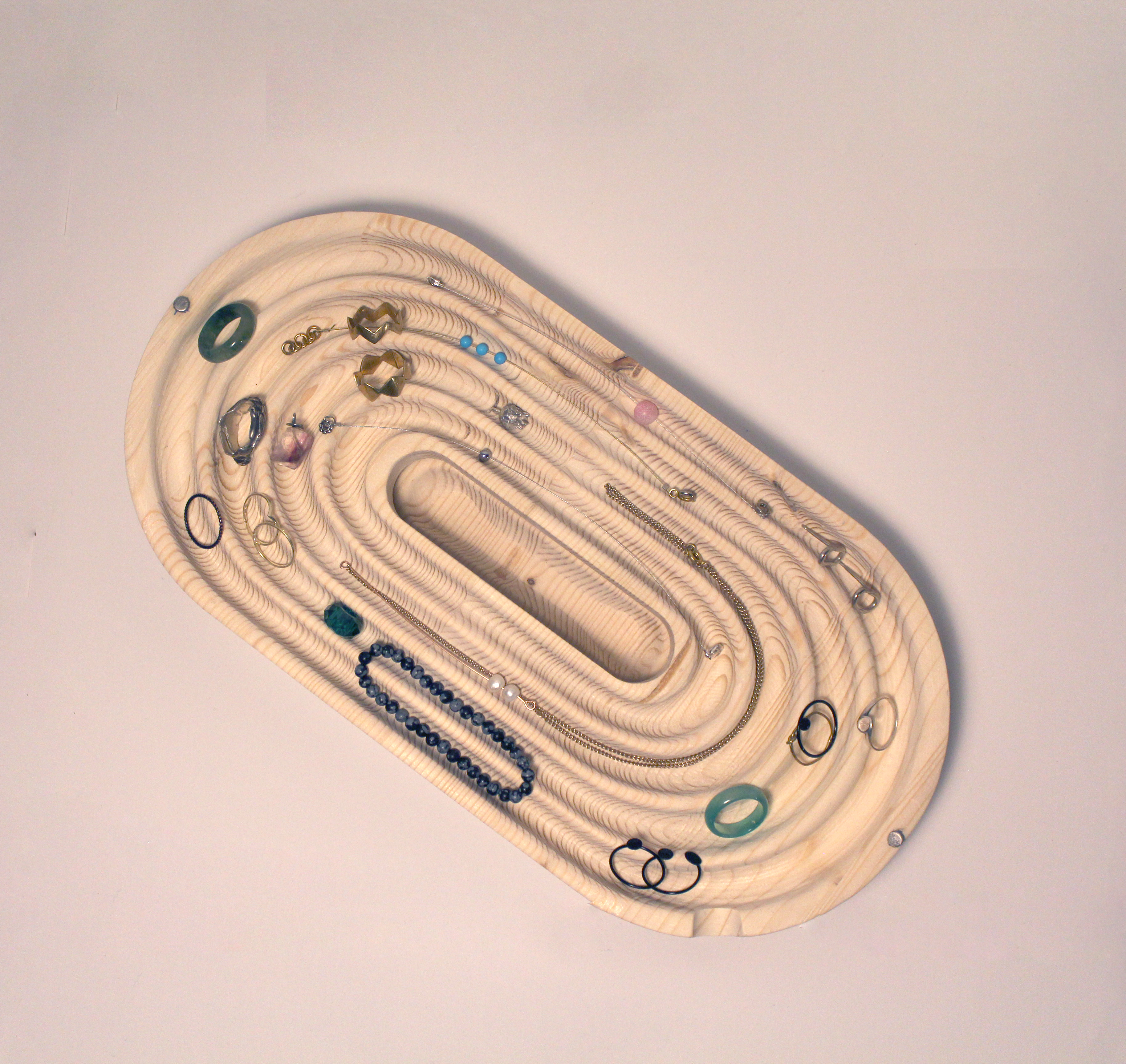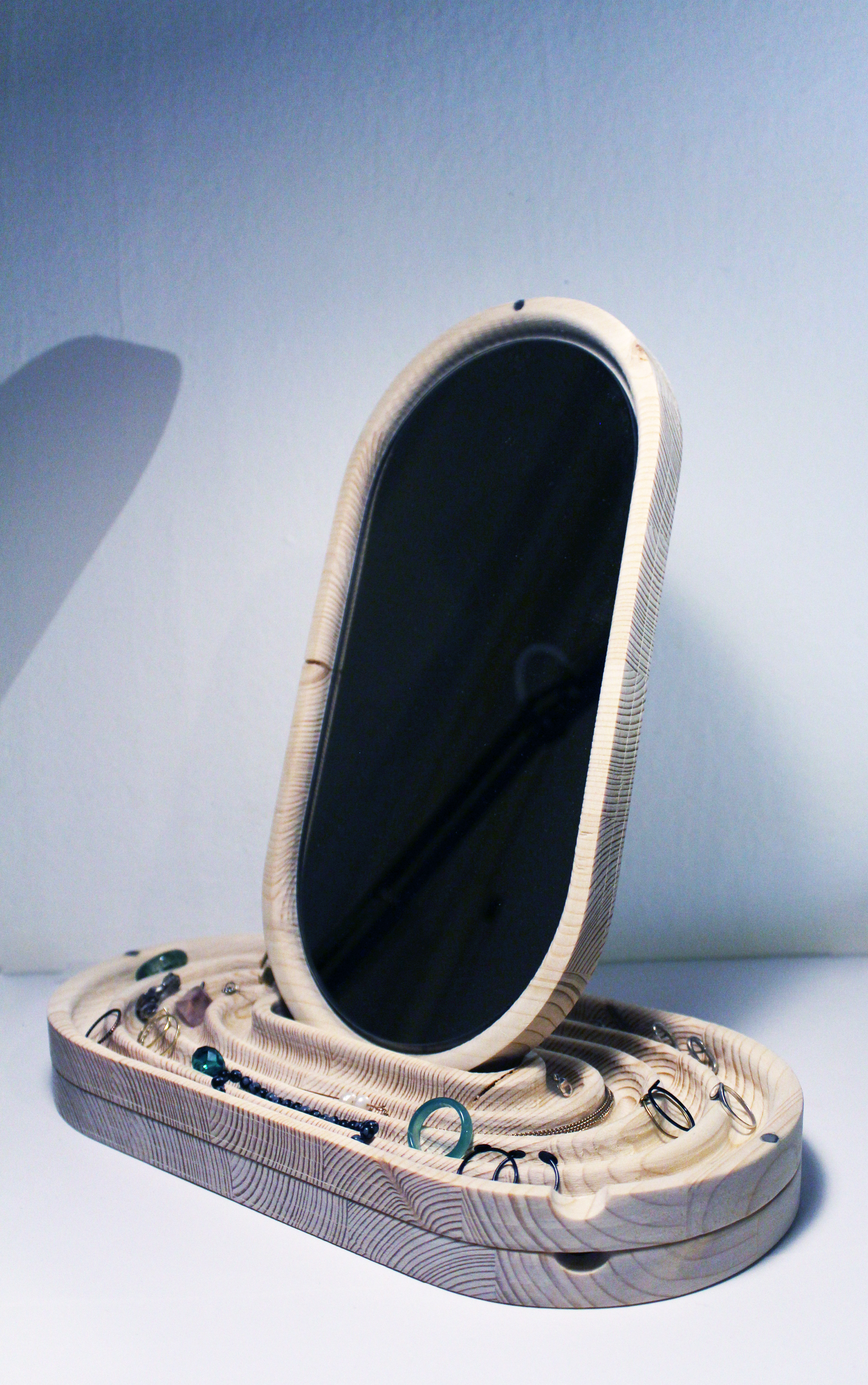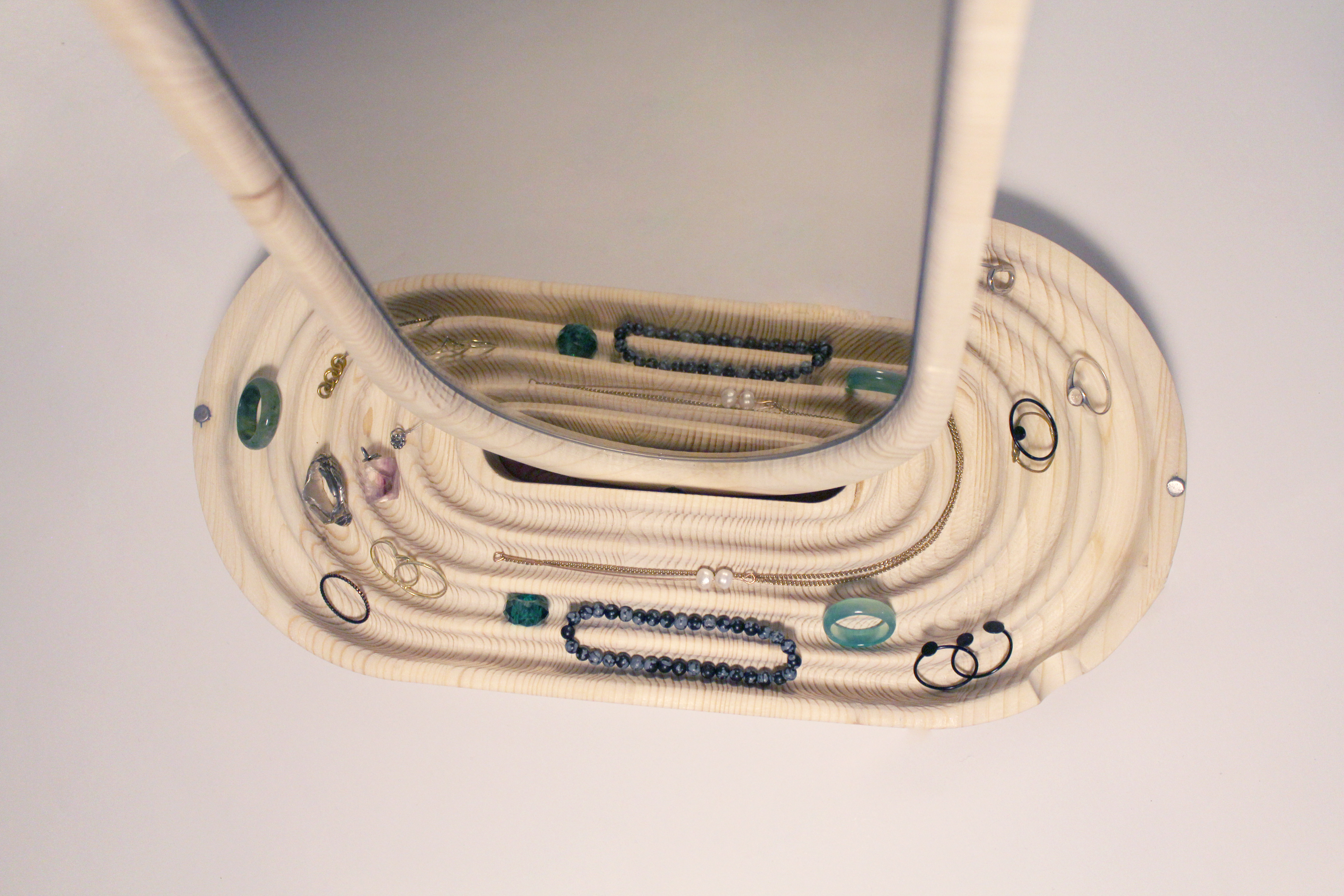 Vylepšenie prvej varianty šperkovnice, pridanie spodnej časti na odkladanie väcších šperkov. Vďaka tomu lepšia stabilita vrchnaka so zrkadlom - ukotvenie v spodnej casti. Pridanie výrezov po stranách šperkovnice, Lepší uchop. V strednej časti zníženie, vybrúsene vlnky pre lepšie uchopenie a odobratie šperkov, hlavne náhrdelníkov.