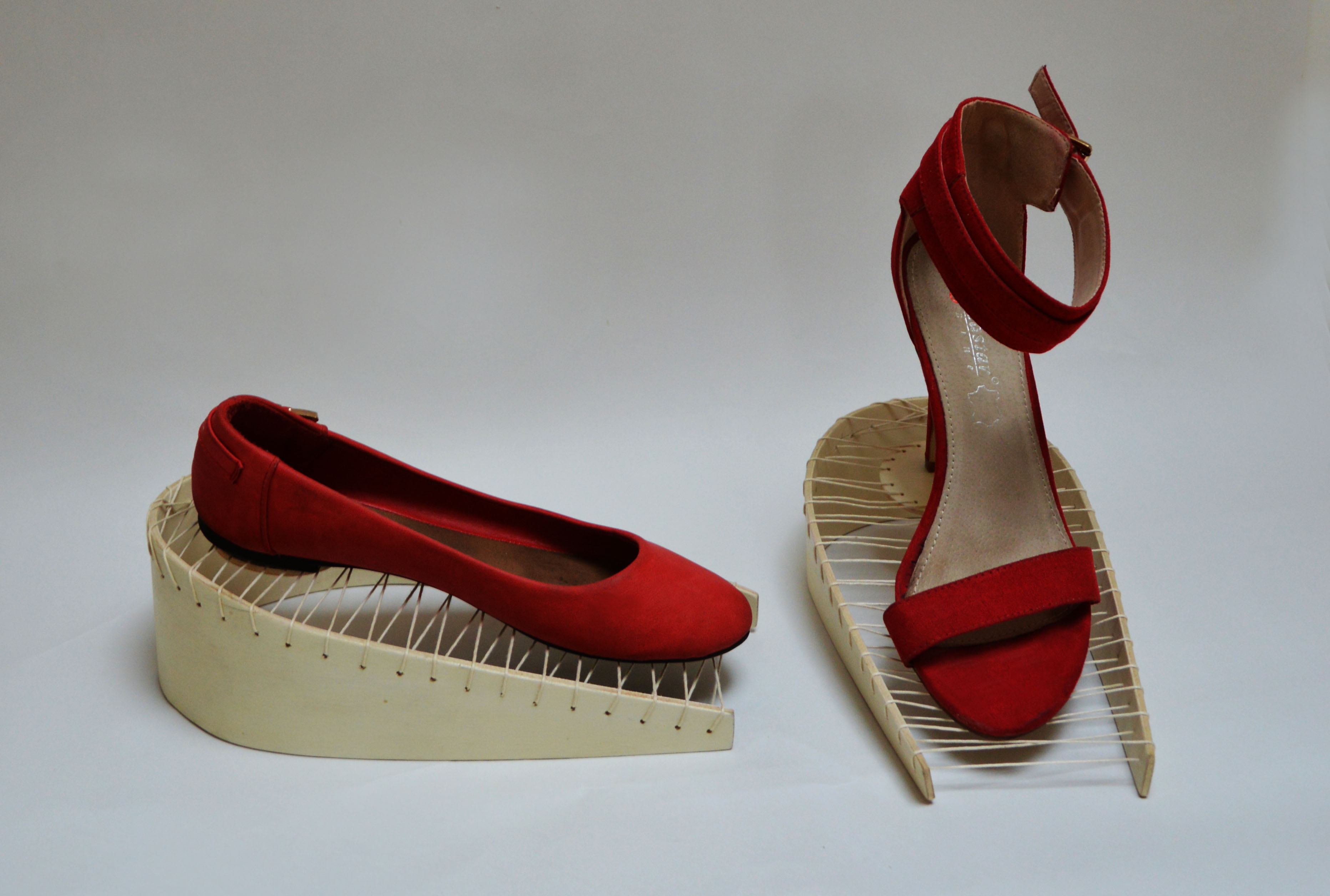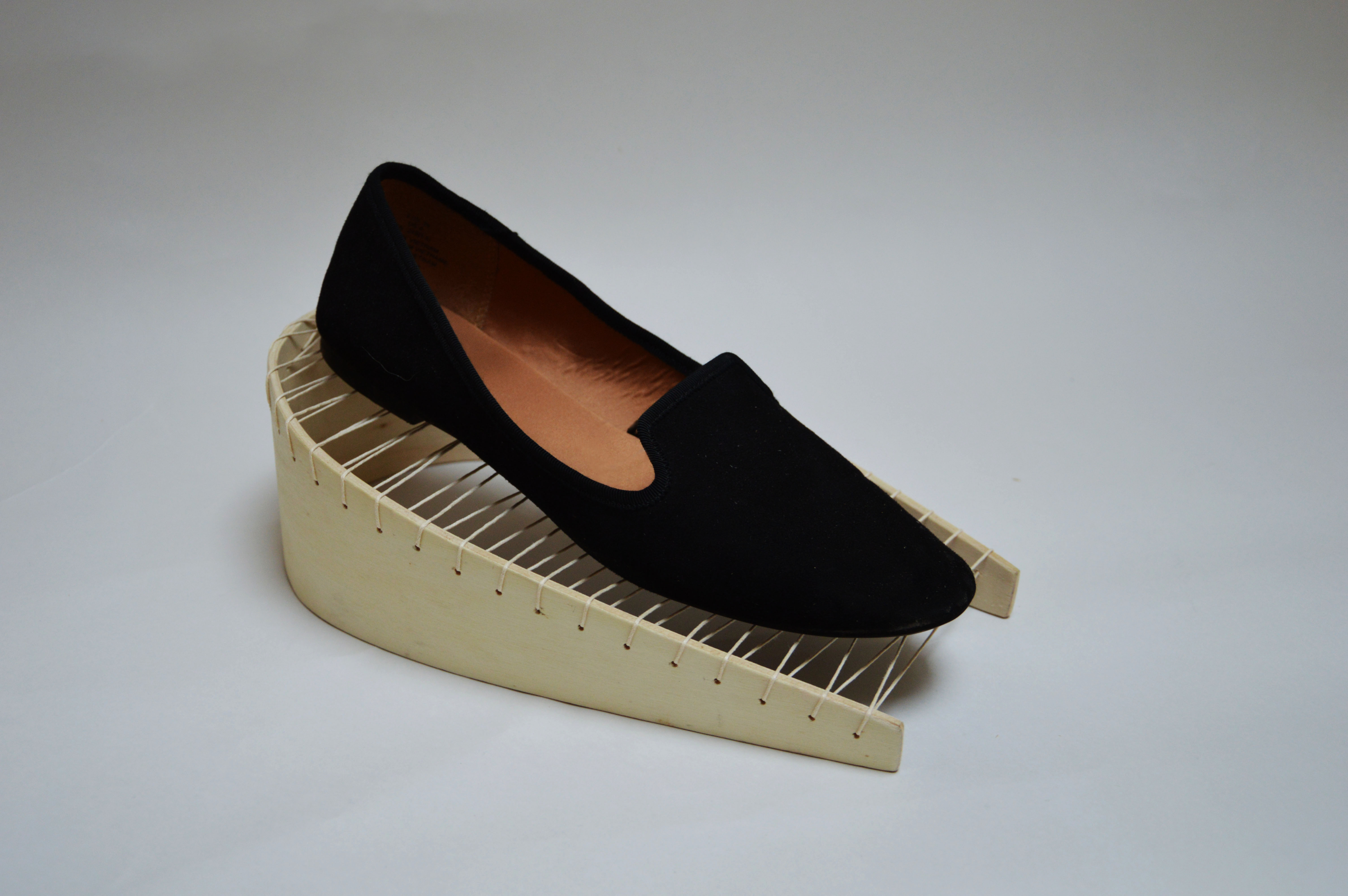 Stojan na topánky je inšpirovaný šitím a ručnou výrobou topánok. Je vyrobený z ohýbanej preglejky a šnúrky. Šnúrka drží zaoblený tvar a slúži ako protišmyková plocha, na ktorú pokladáme topánku. Na Stojan môžme umiestniť rôzne druhy topánok, čo nám umožňuje vypletený drevený kruh.