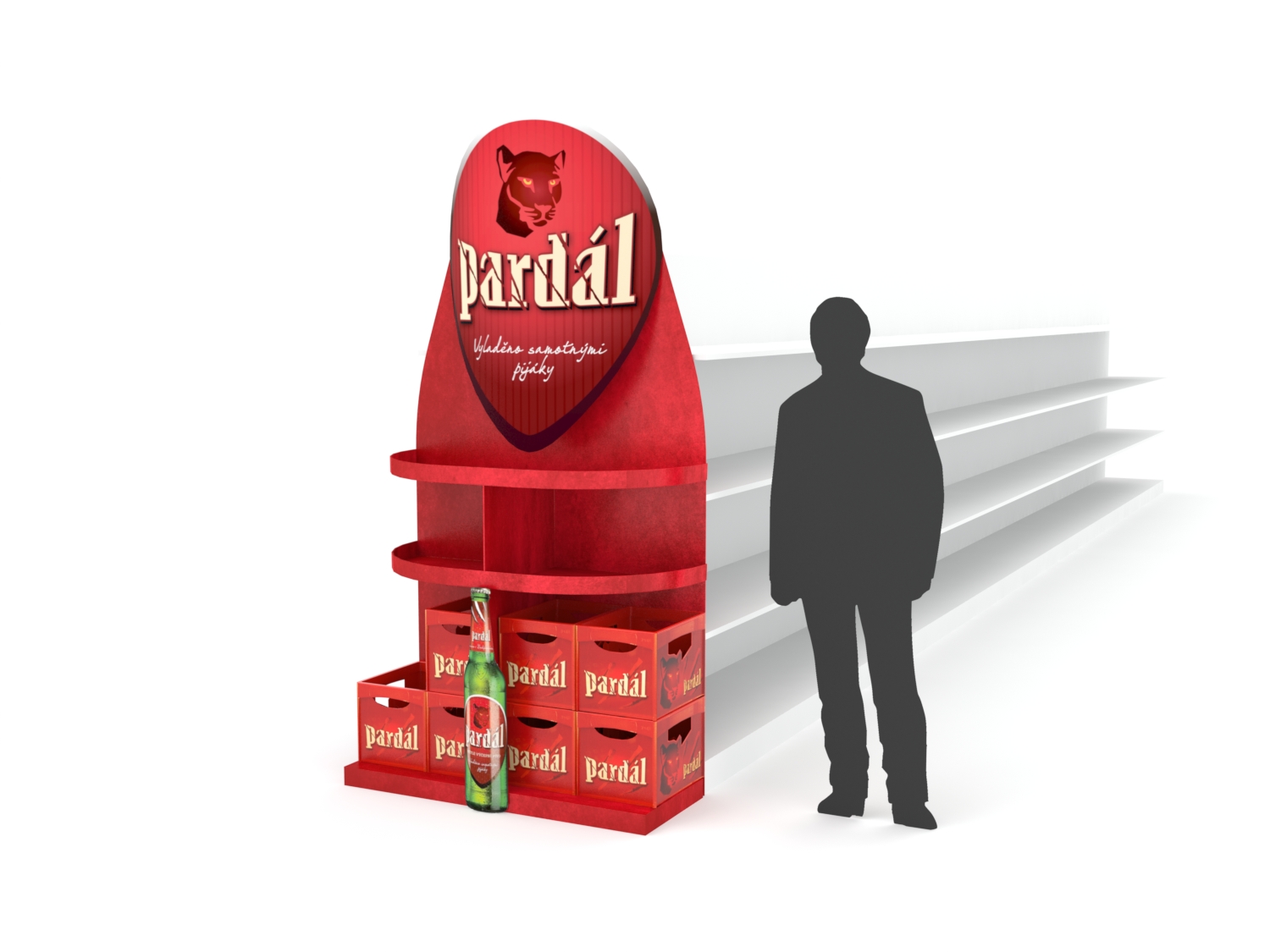 Řešení regálového čela, podlahového stojanu a parazitního stojanu pro značku Pardál.
