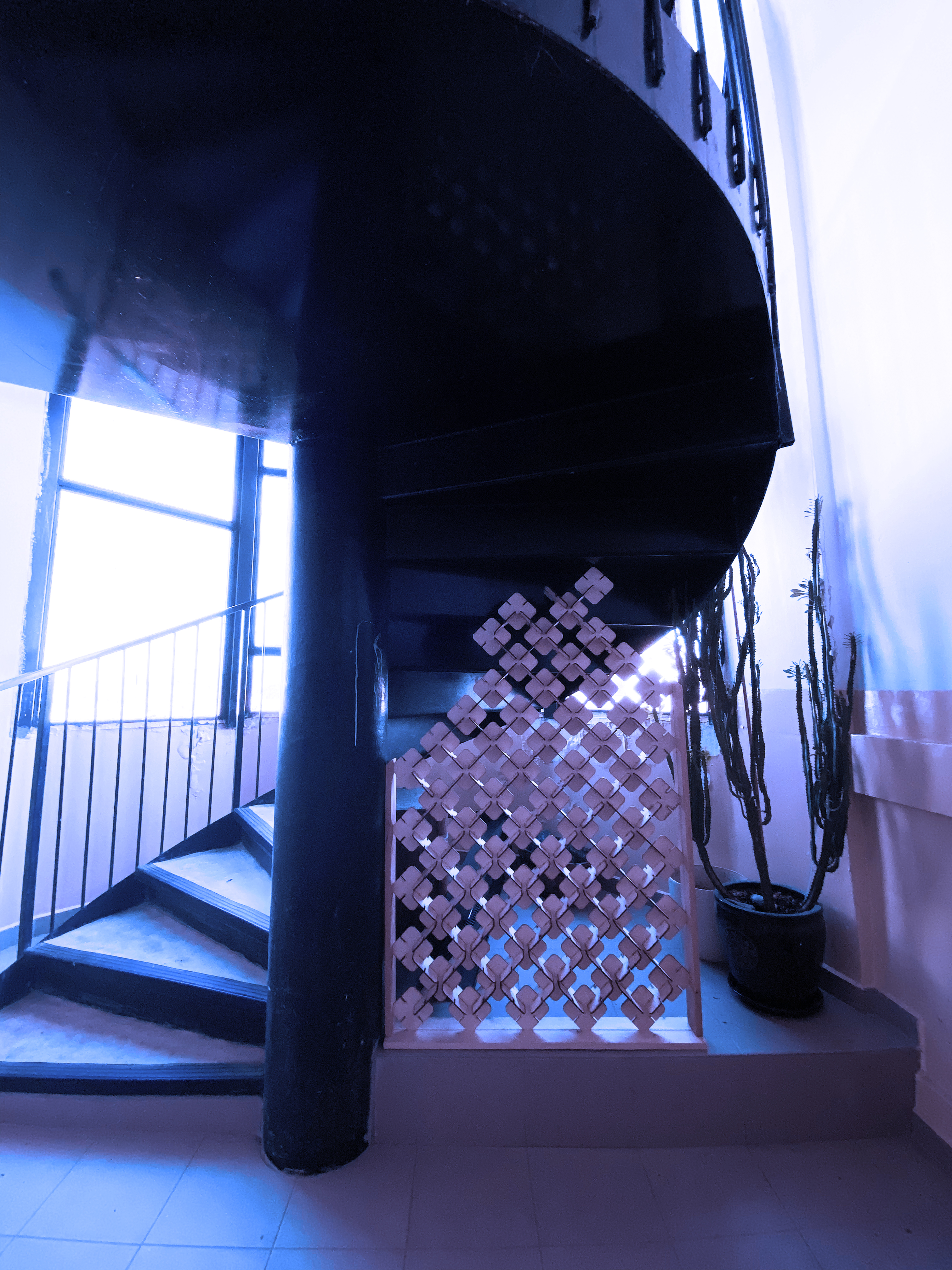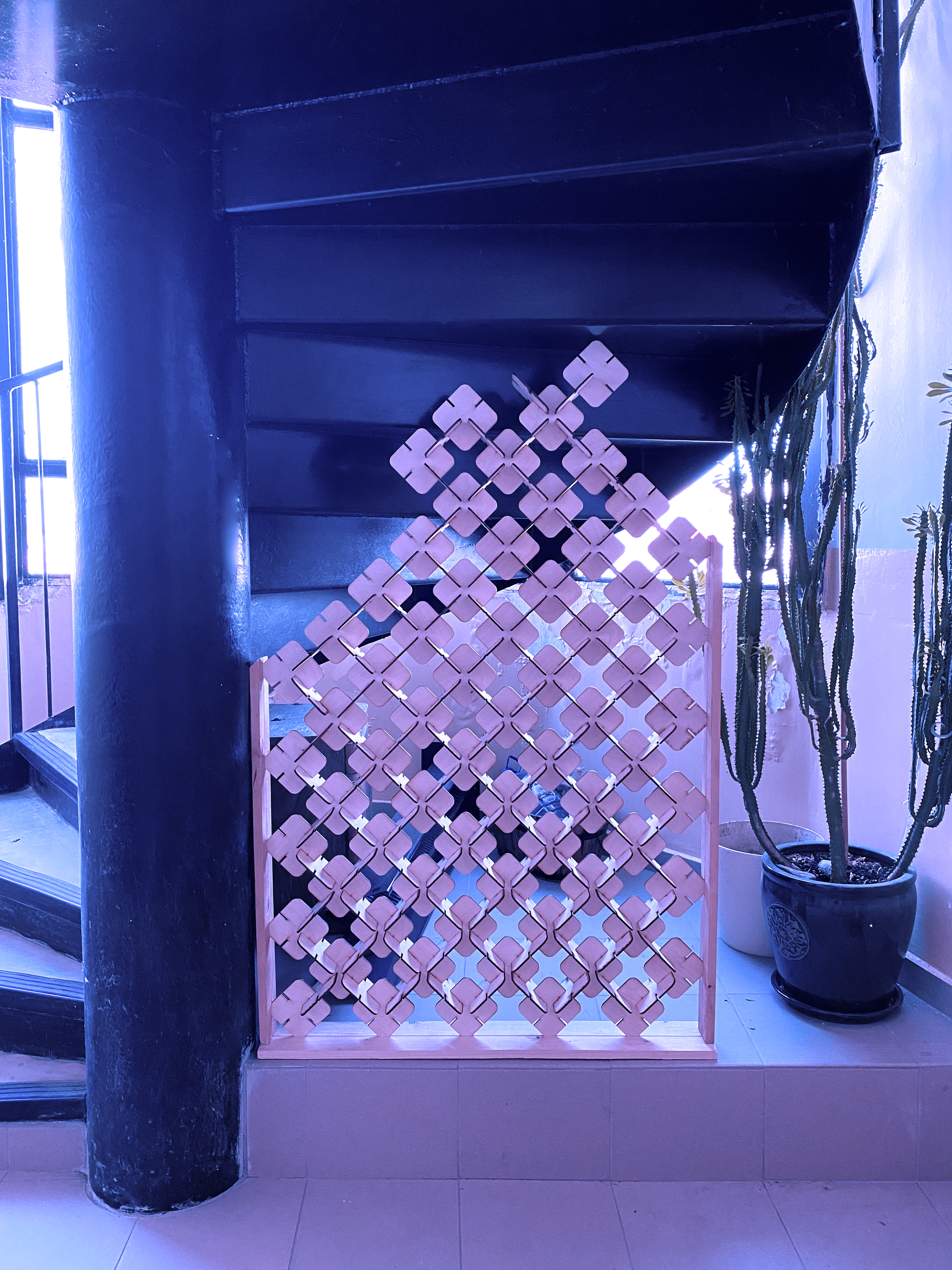 Paraván sa skladá z jednotlivých častí štvorcového tvaru s rozmermi 10x10 cm. Na každom zo štvorcov sú po stranách vyrezané ryhy, pomocou ktorých do seba jednotlivé časti zapadajú a vytvárajú zaujímavú štruktúru. Realizovaný model je vsadený do konštrukcie pre pevnejšie státie a ľahšiu manipuláciu s objektom. Napojením, respektíve odpojením ďalších častí, je možné paraván zväčšovať alebo zmenšovať. Objekt je určený na rozdelenie akéhokoľvek priestoru na pracovisku, v domácnosti alebo vytvorenie intímnejšieho prostredia v kaviarni alebo reštaurácii.