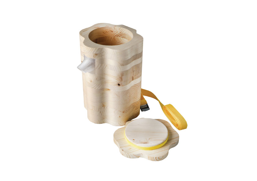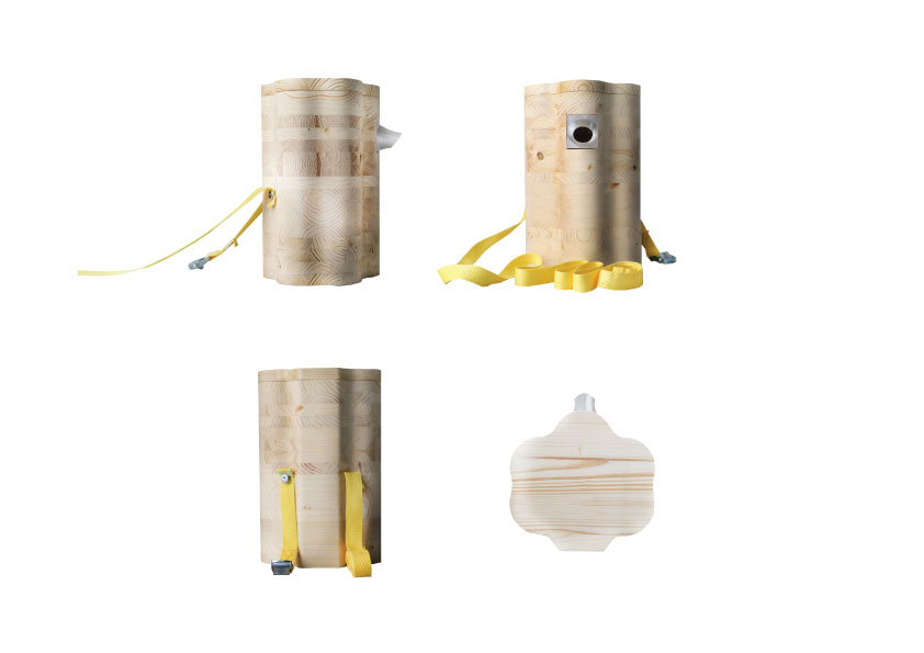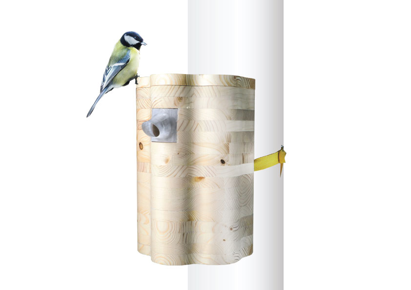 Tvar inšpirovaný pňom zo stromu. Ideou bolo preniesť dynamické a náhodné tvary prírody do konštrukcie vtáčej búdky, tak aby búdka nepripomínala človekom vytvorený objekt.