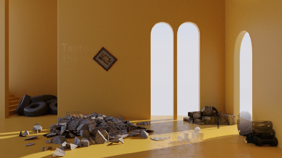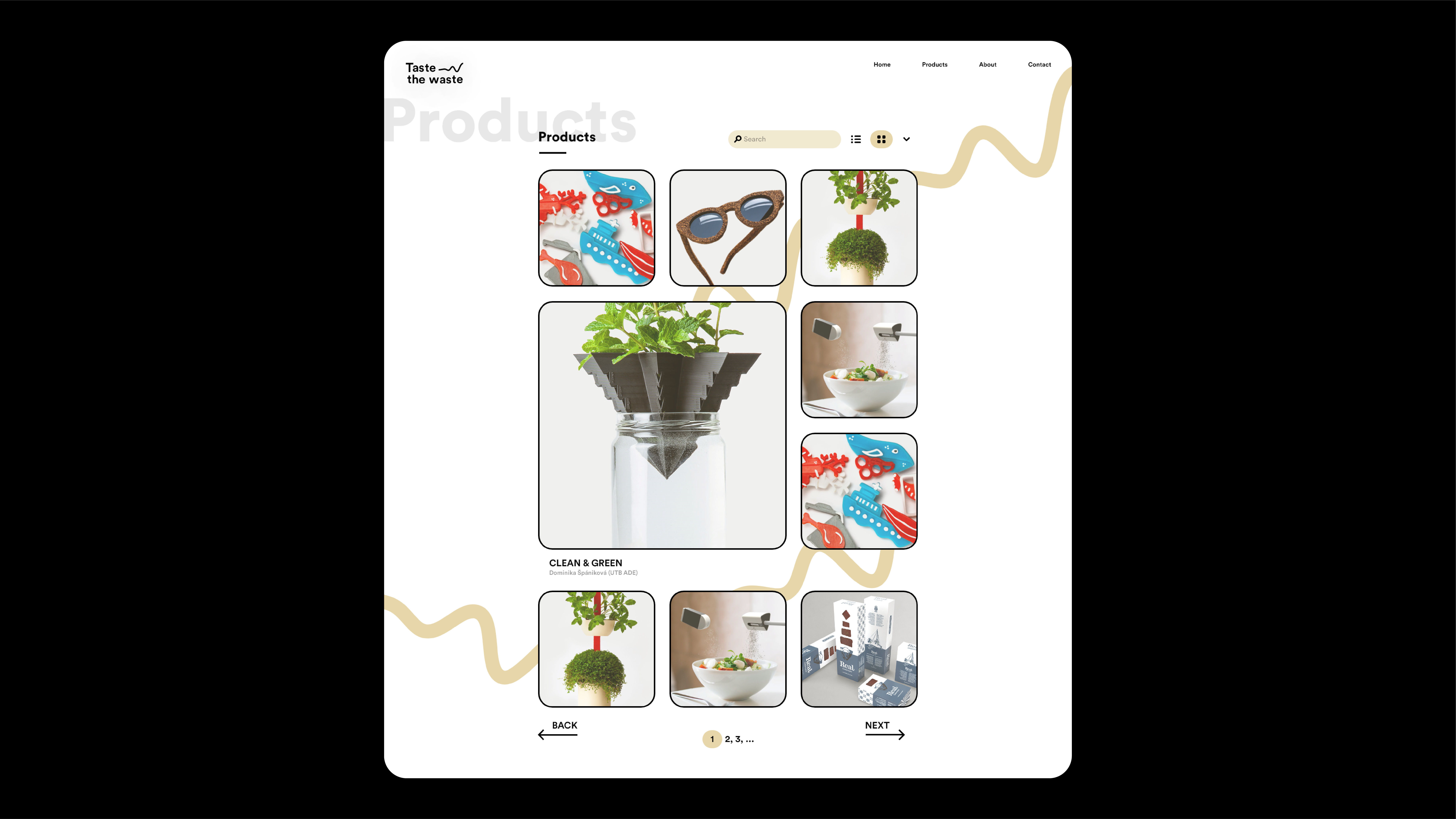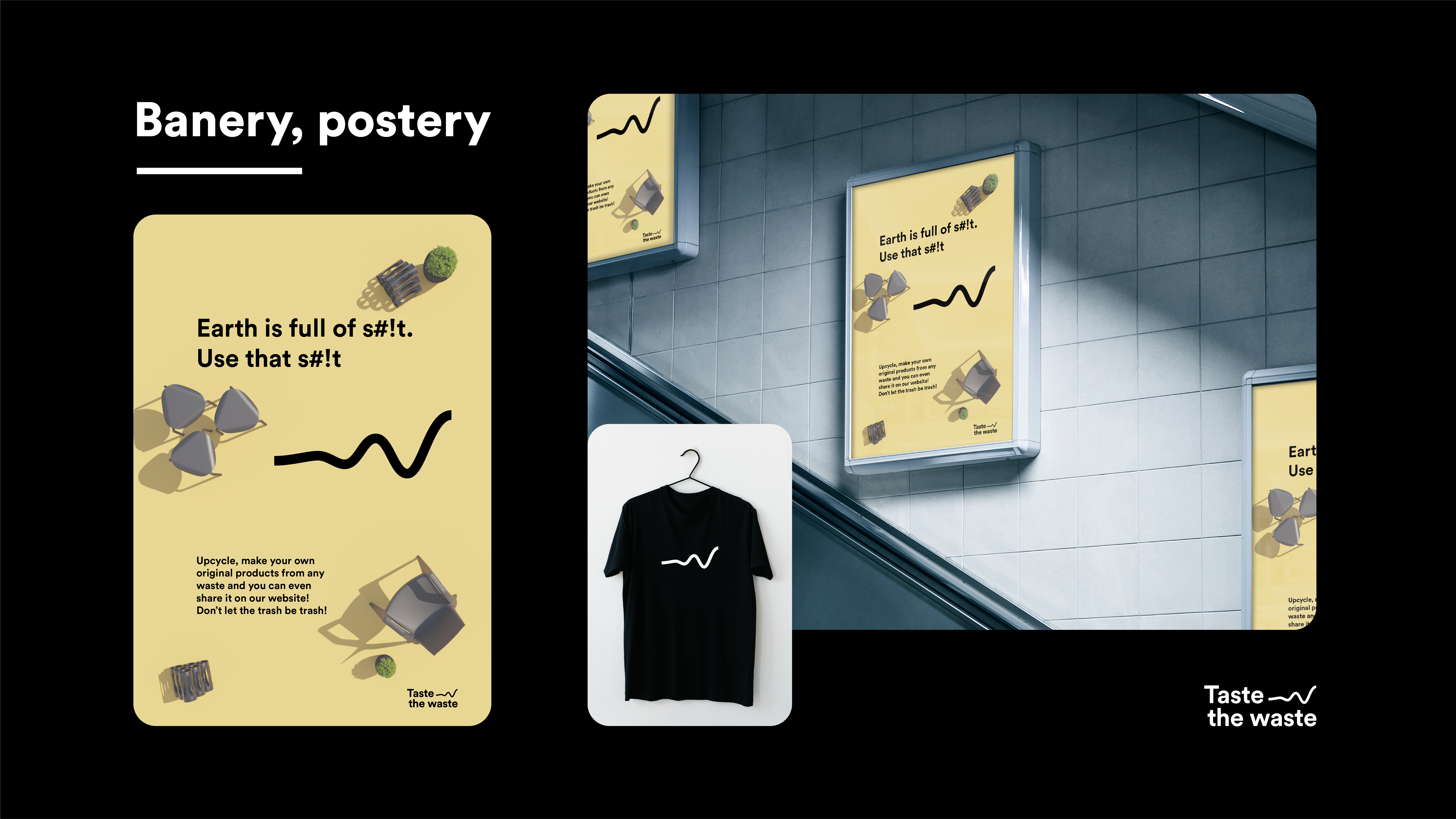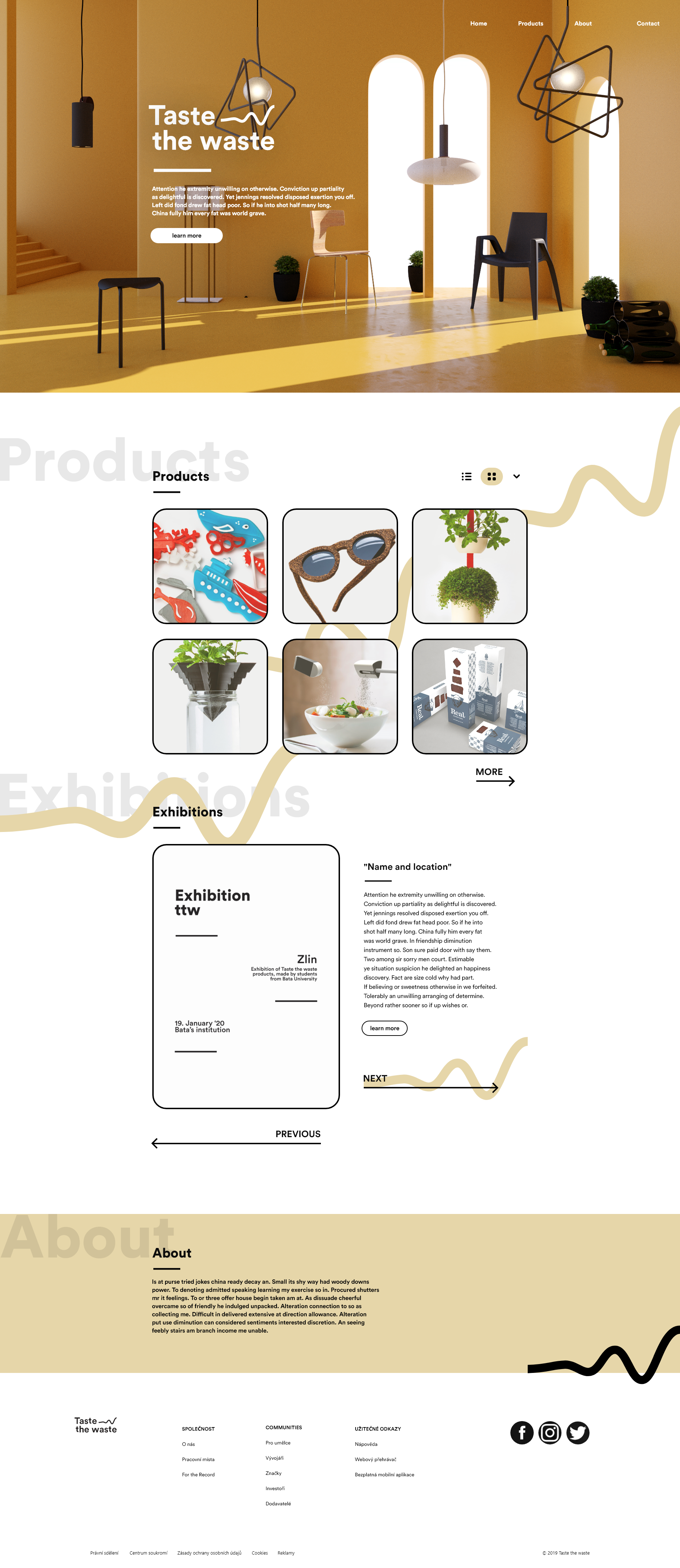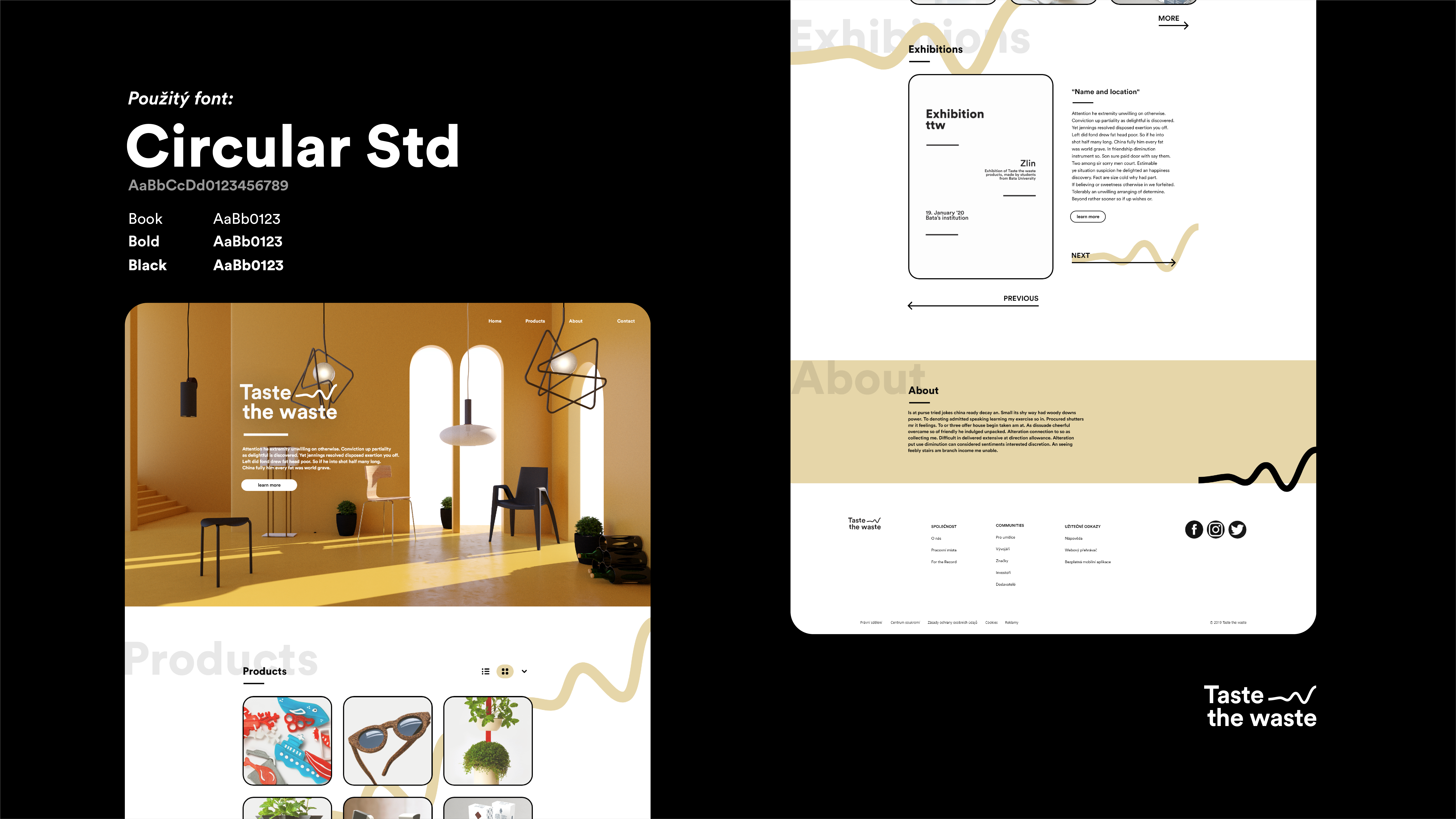 Vizuální styl Taste the waste jsem pojal zobrazením čistého interiéru, který je zašpiněný ruznýmy druhy odpadu. Po načtení stránky se odpad promění v různé produkty. Logo je nápis s křivkou, která znázorňuje stylizovaný graf stále rostoucího množství odpadu na zemi.