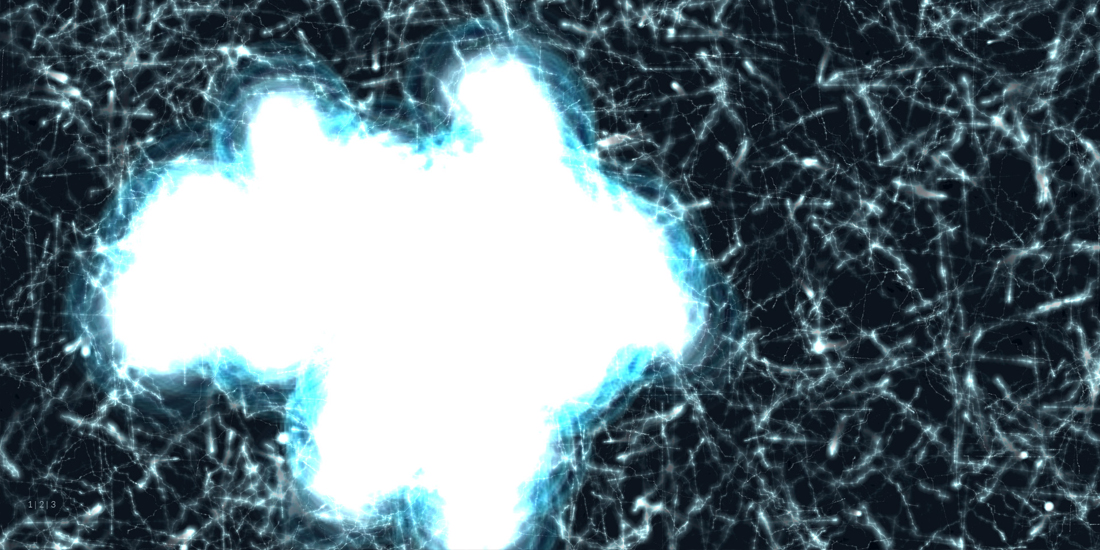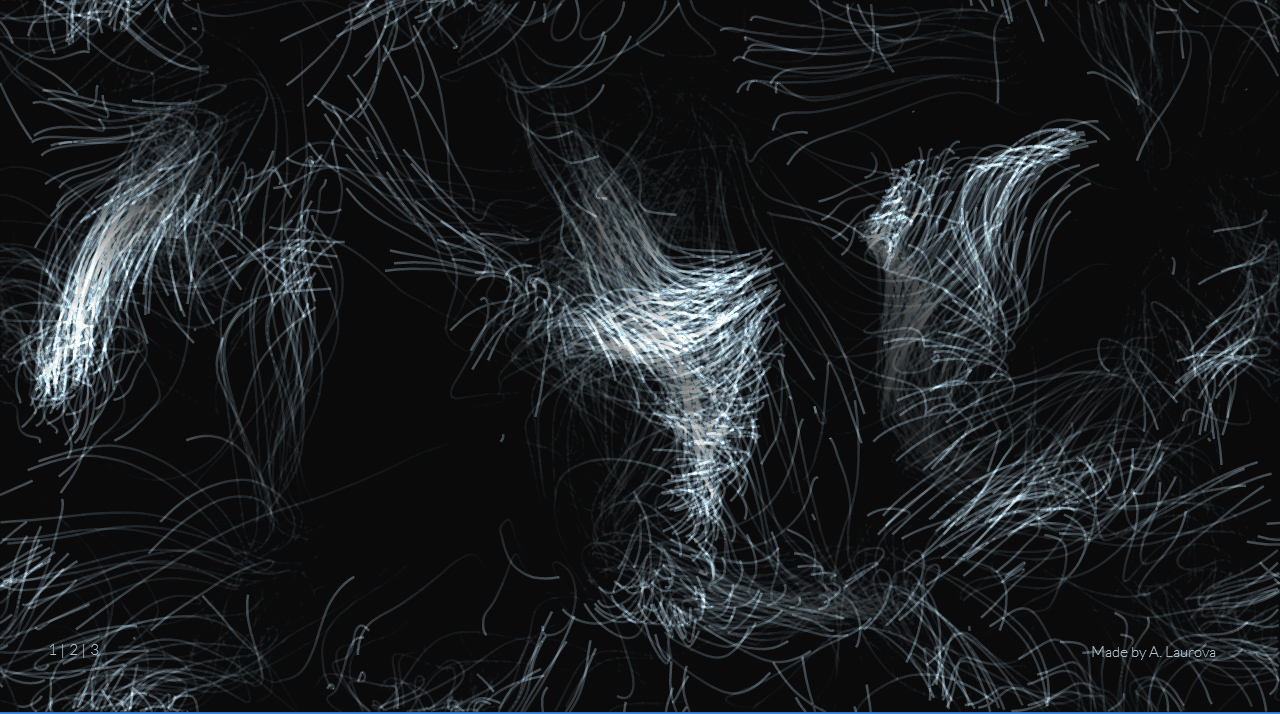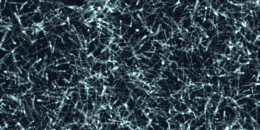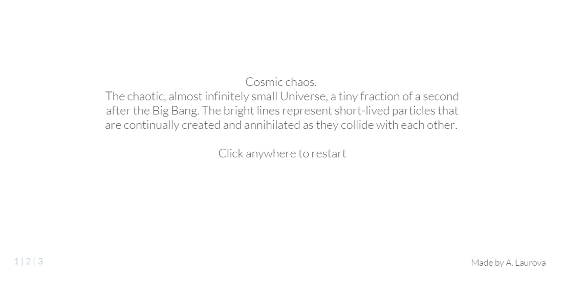 Dynamic JavaScript web site is illustrating the particle chaos in a tiny fraction of a second after the Big Bang. The bright lines represent short-lived particles that are continually created and annihilated as they colide with each other.