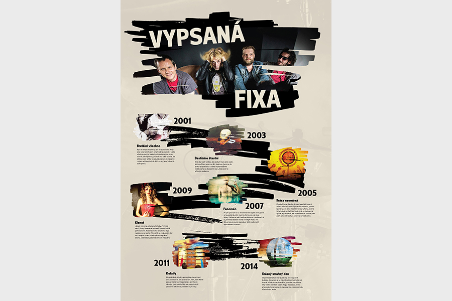 Poster s úryvky z blogů frontmana kapely vztažené k datům vydání skupinových alb.