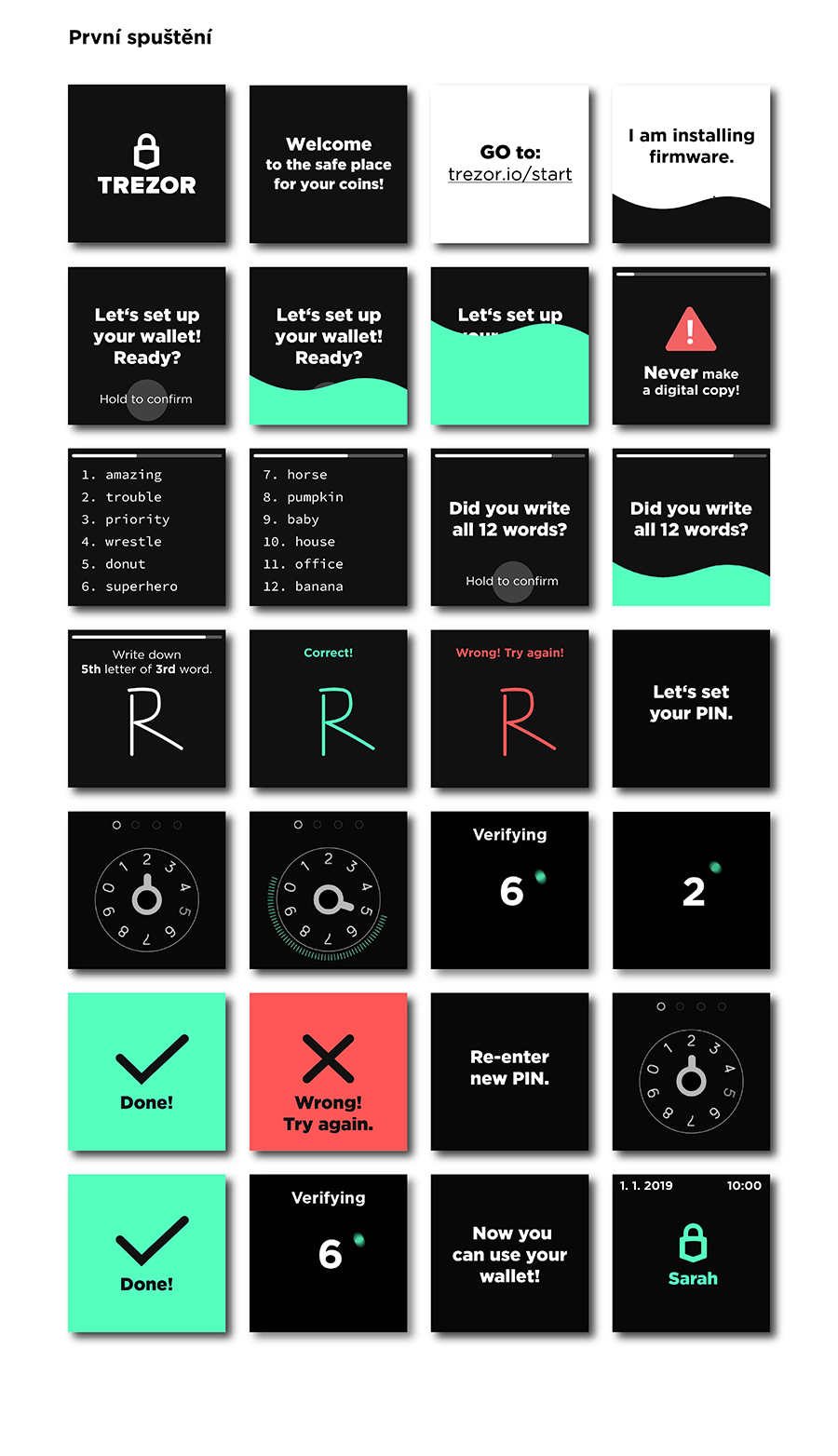 Návrh UI pro kryptoměnovou pěněženku Trezor. V původním UI byly nalezeny mezery především ve srozumitelnosti a satisfakci uživatele. Nový design je proto založen na potvrzování pomocí dlouhého stisknutí ,,long touch'' a na barvách, které symbolizují děje v aplikaci. Jednotlivé akce jsou podpořeny animací prvků, která dělá peněženku uživatelsky přívětivější.