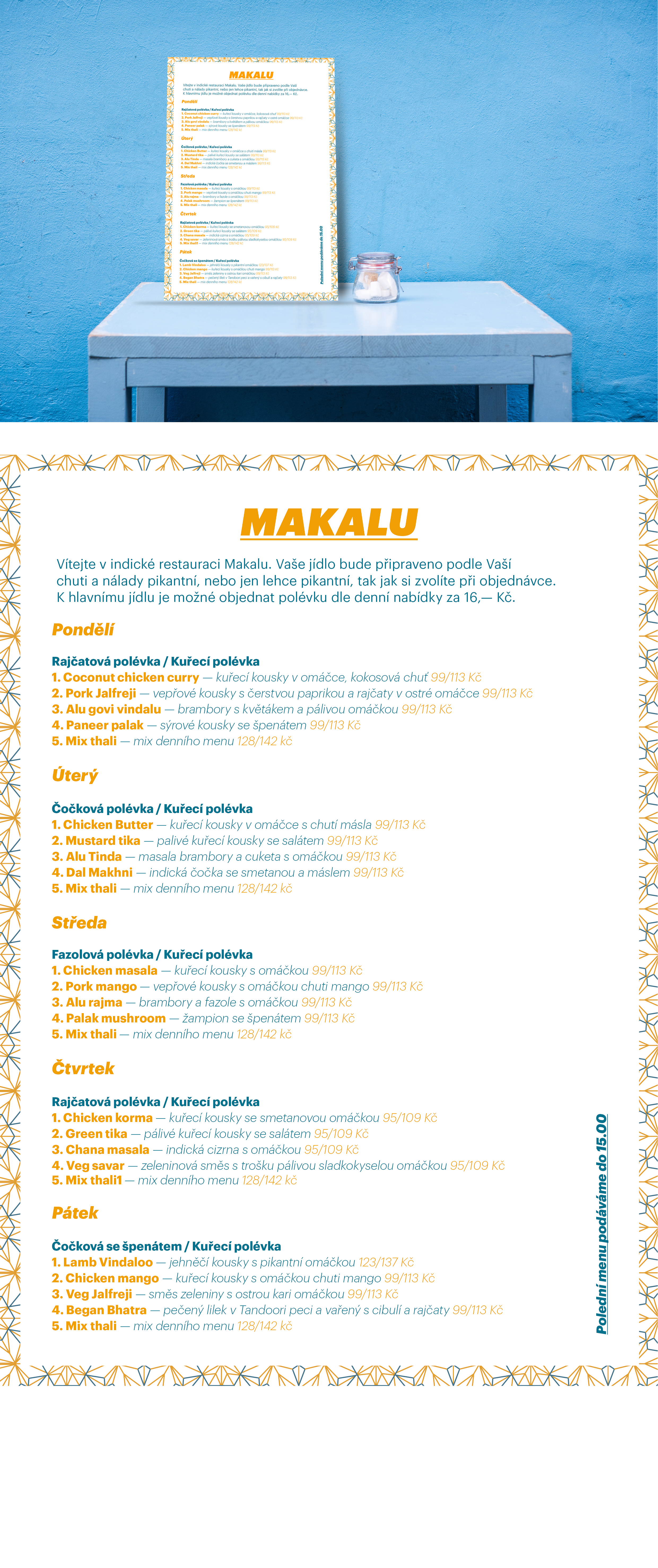Týdenní menu pro restauraci Makalu. Okraje týdenního menu zdobí mandaly laděné do nejčastějších barev indického koření podpořeného kontrastní barvou petroleje.