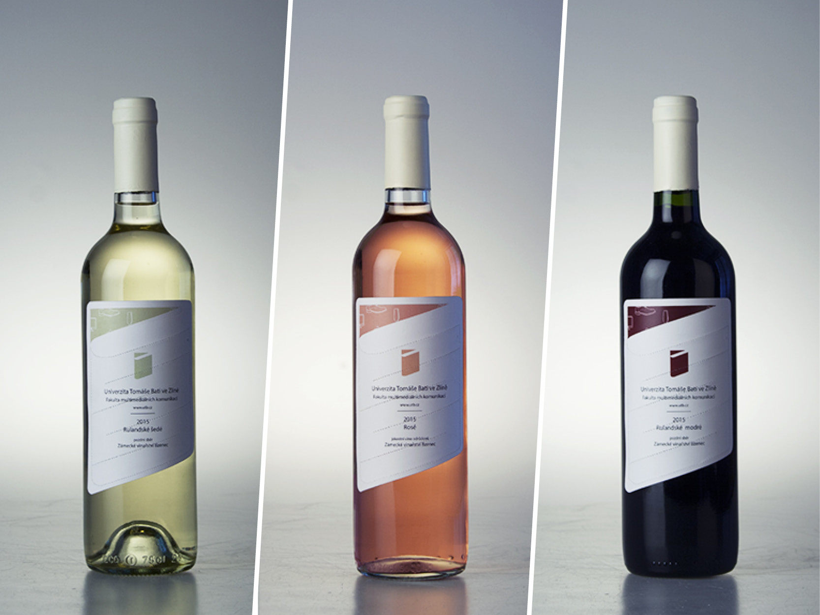 Návrh etikety na víno pro fakultu multimediálních komunikací. Etiketa vychází z tvaru samotného loga UTB. Vykukuje ilustrace piktogramů specifických pro všechny obory na FMK, bílá část s typografií lze odtrhnout a tím se objeví univerzitní logo s ilustrací.