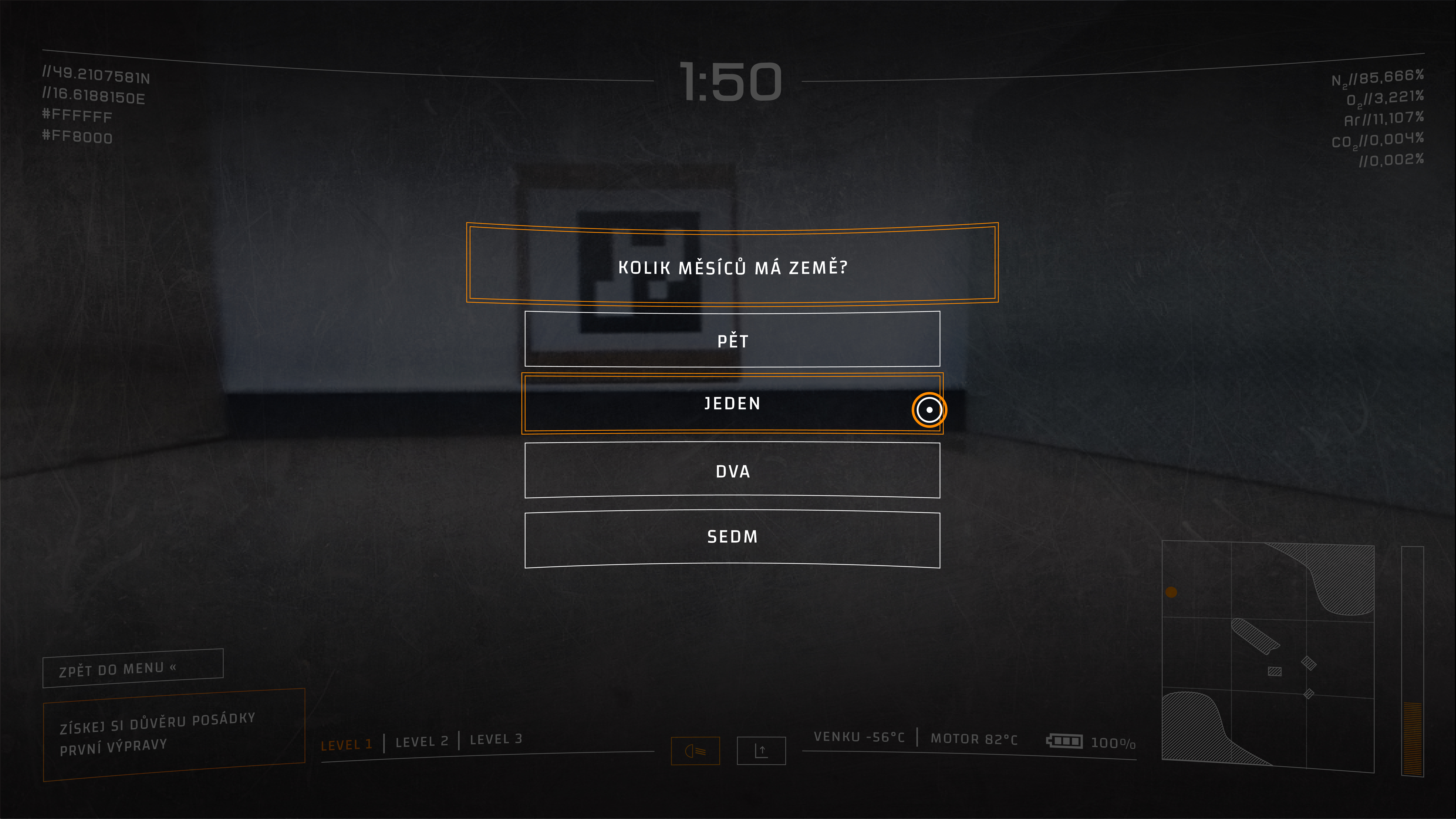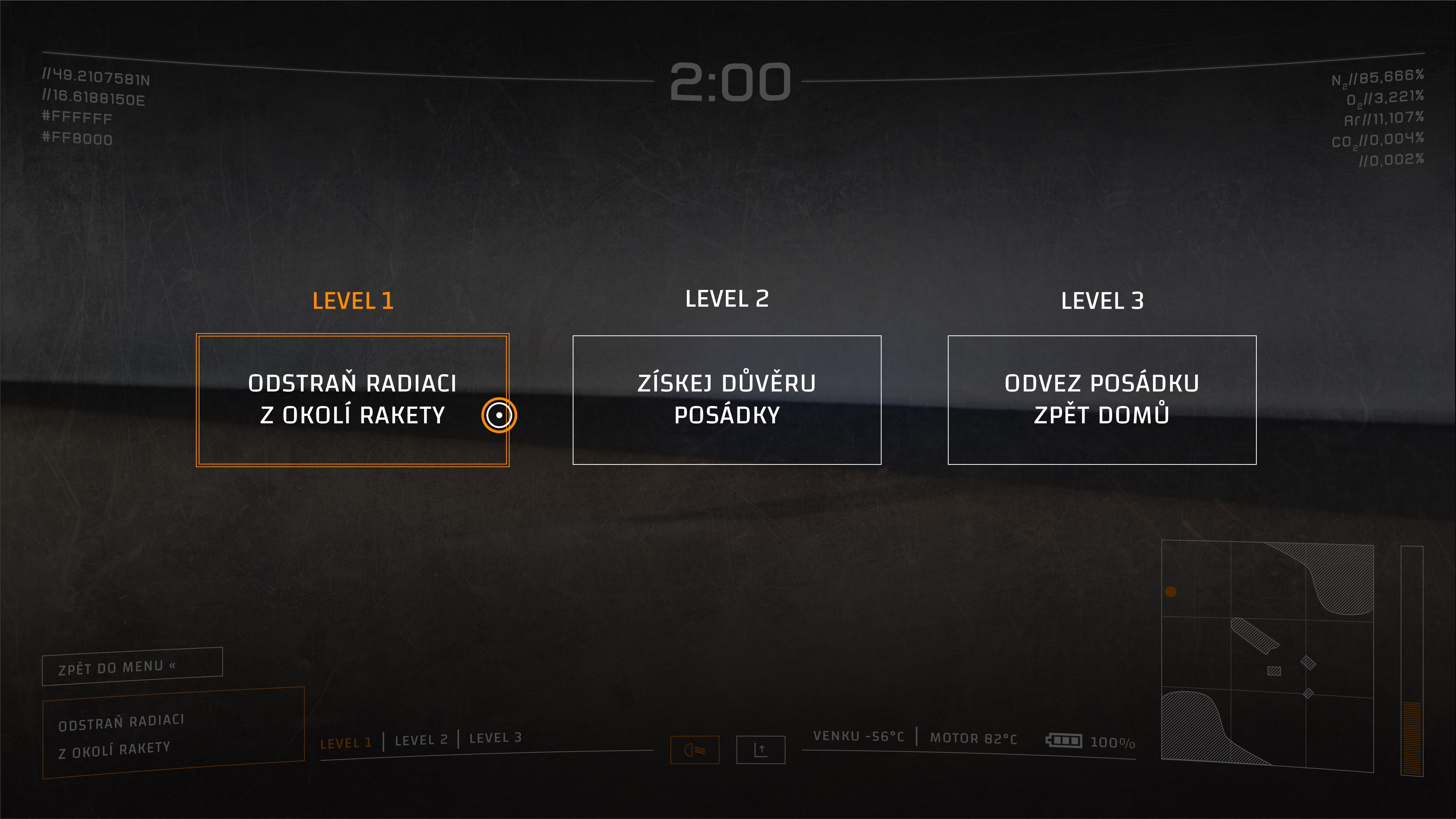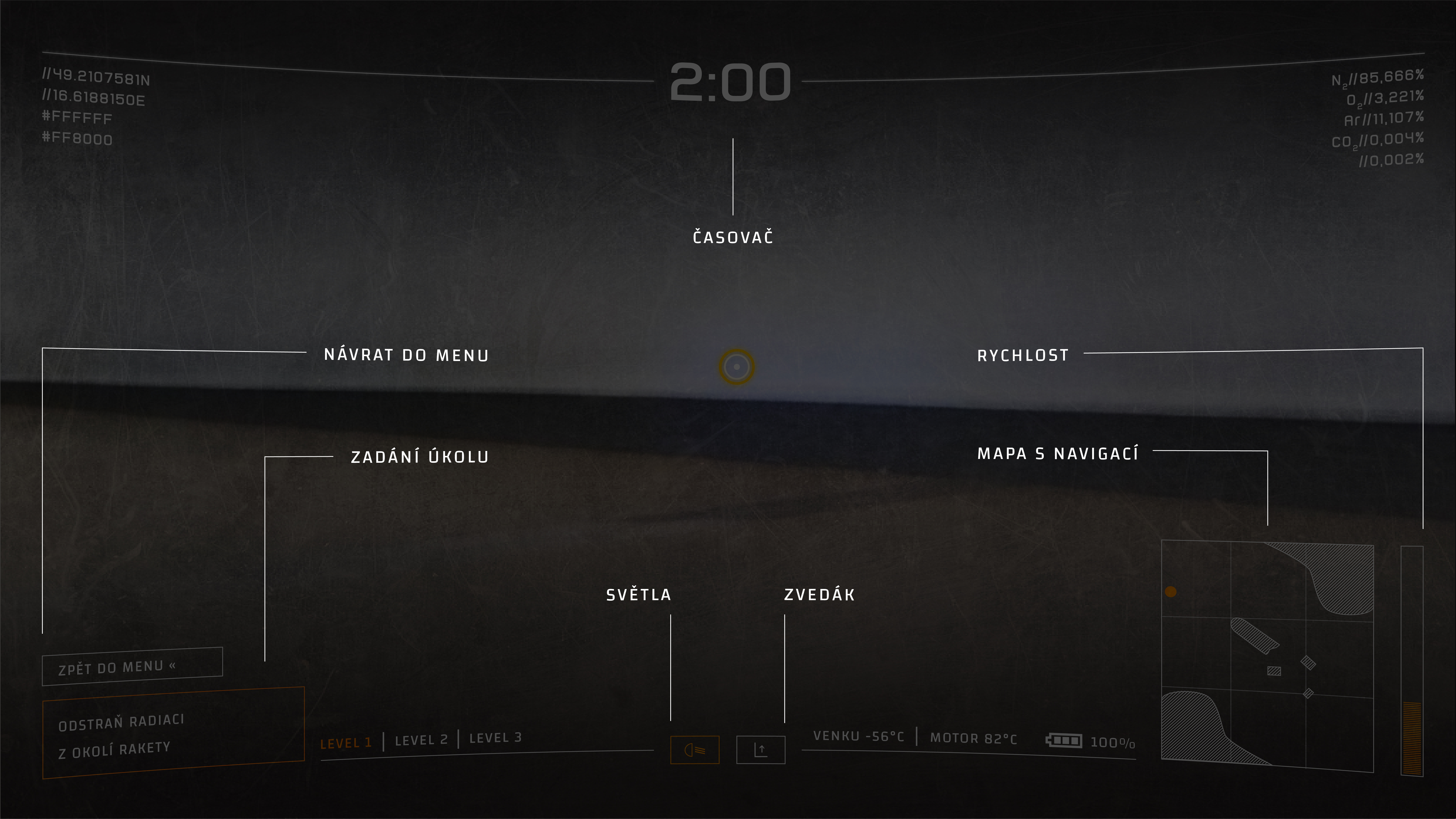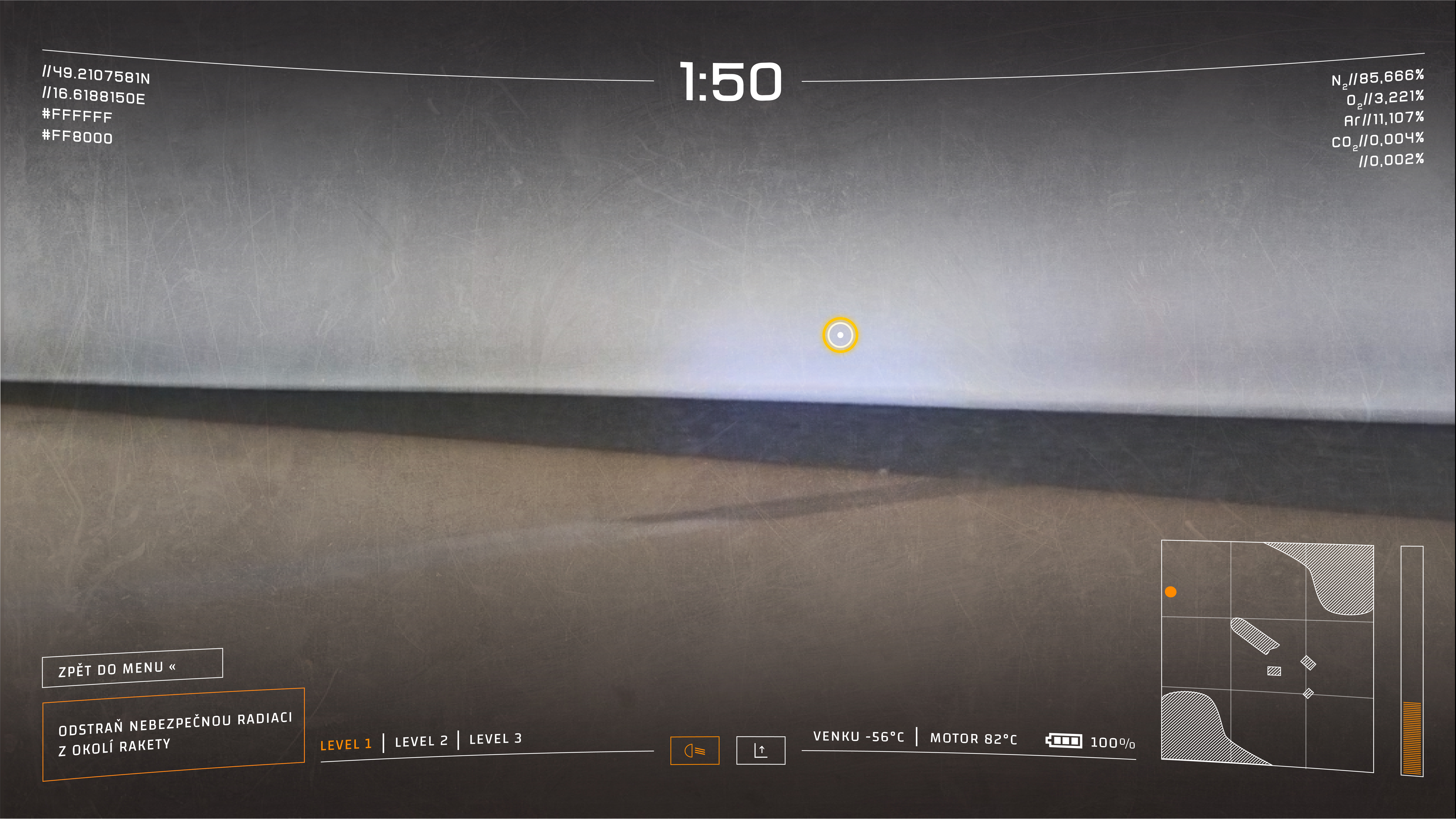 Uživatelské prostředí robota jsem pojal formou spíše křehkých čar, které napodobují iluzi prostoru, což divákovi pomáhá se dostat více do hry. Pro podpoření atmosféry hry jsem pracoval se stíny v horní a dolní části, které zlepšují čitelnost a přehlednost, společně s jemnou texturou přes obraz. V samotné hře jsem počítal s úvodem diváka do hry, instrukcemi, výběrem misí a hry obecně, prostředím při "běžném" projíždění, otázkami astronautů první posádky, hlášením o vybití akumulátoru, a o úspěchu či neúspěchu mise.