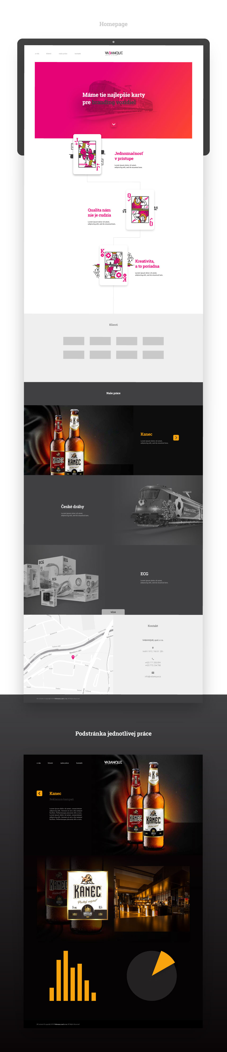 Re-design webu Vabanque bol zameraný na zatraktívnenie prezentácie tejto reklamnej agentúry tak, aby v potenciálnom klientovi vzbudila záujem a previedla ho všetkým, čo agentúra ponúka. To som sa snažil dosiahnuť nadviazaním na tematiku kariet, ktorú som využil na prezentovanie jednotlivých výhod, ktoré sa užívateľovi postupne odhaľujú. K tomu som vybral najsilnejšie karty z balíka žolíkových kariet, ktorých motív som menil do humornej podoby typickej pre svet reklamných agentúr a dopĺňal trefným copywritingom.