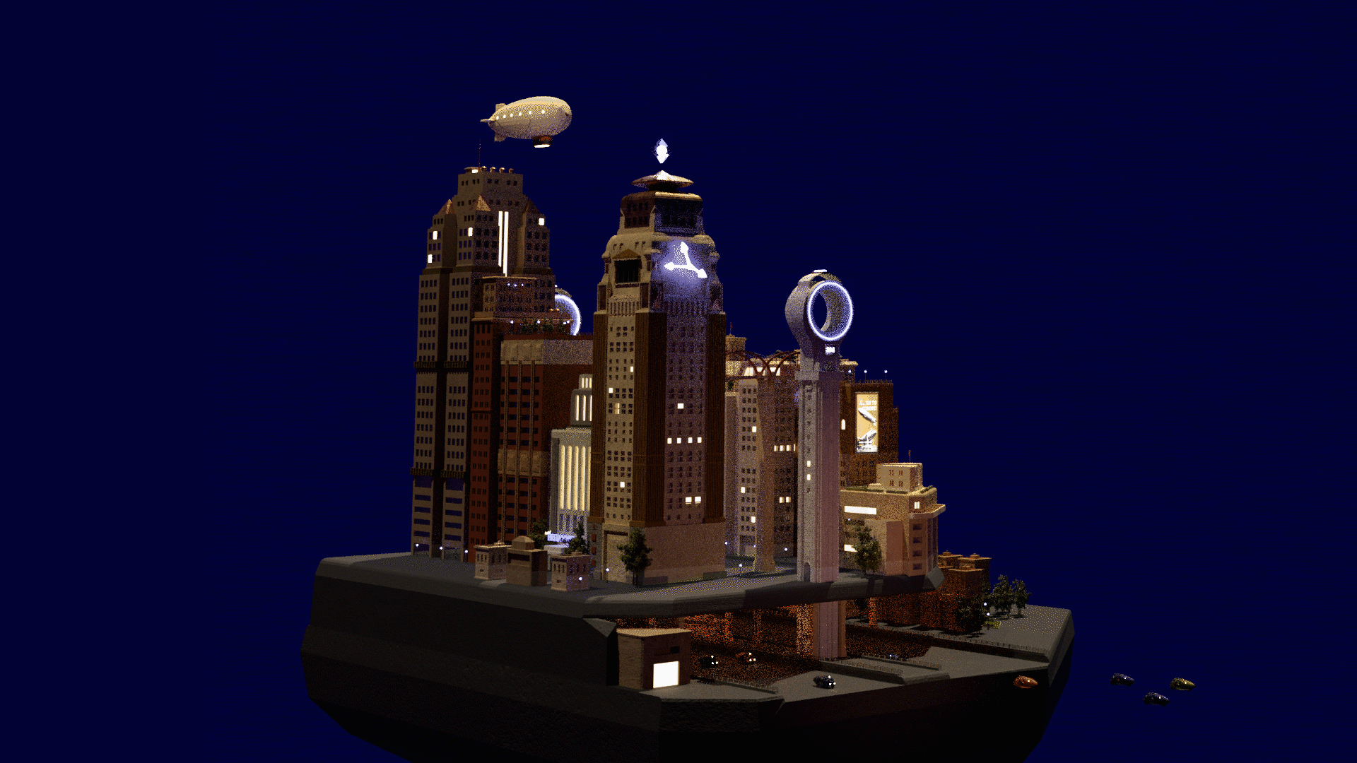 Jako klauzurní práci jsem se rozhodla zpracovat téma retrofuturismus v podobě animovaného 3D dioramatu. Projekt Včerejší zítřky vizualizuje, jak si lidé ve 30. letech 20. století představovali budoucnost – hromadná doprava na bázi elektromagnetických polí, víceúrovňové ulice a vzdušný dopravní ruch jsou zasazeny do meziválečné městské estetiky mrakodrapů a cihel. Všechny objekty jsou ručně modelované, jediný add-on jsem použila pro základní vrstvu materiálů.