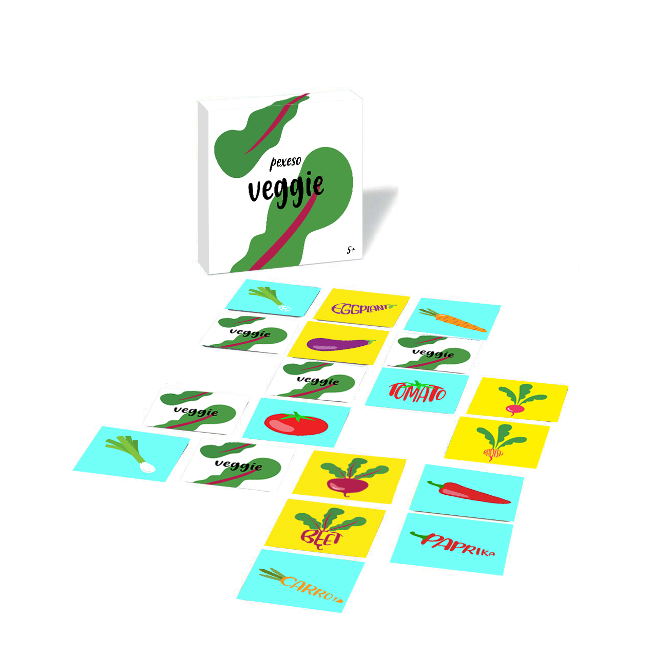 Veggie je typograficko ilustračné pexeso. Pár zobrazuje druh zeleniny buď čisto ilustračnou formou alebo je názov zakomponovaný v samotnej ilustrácii.