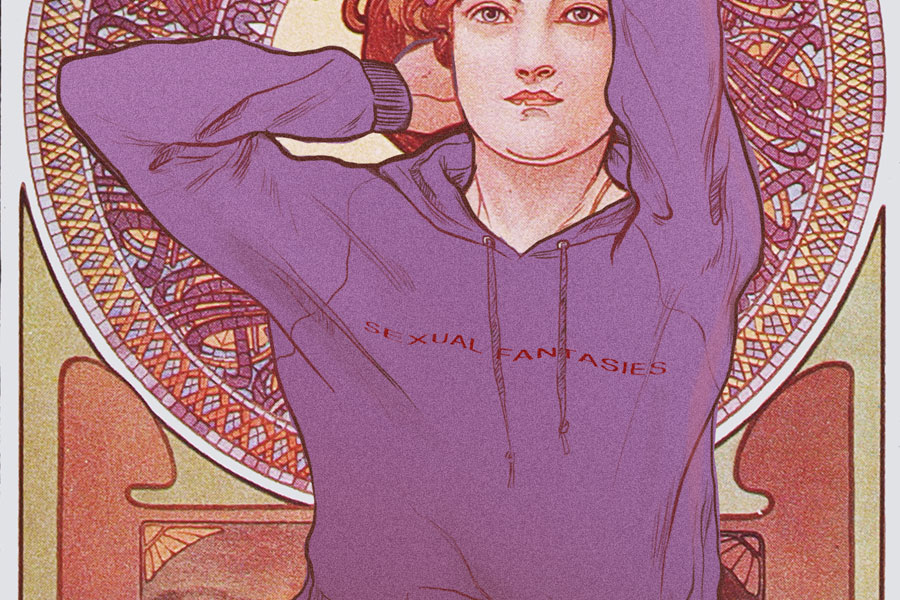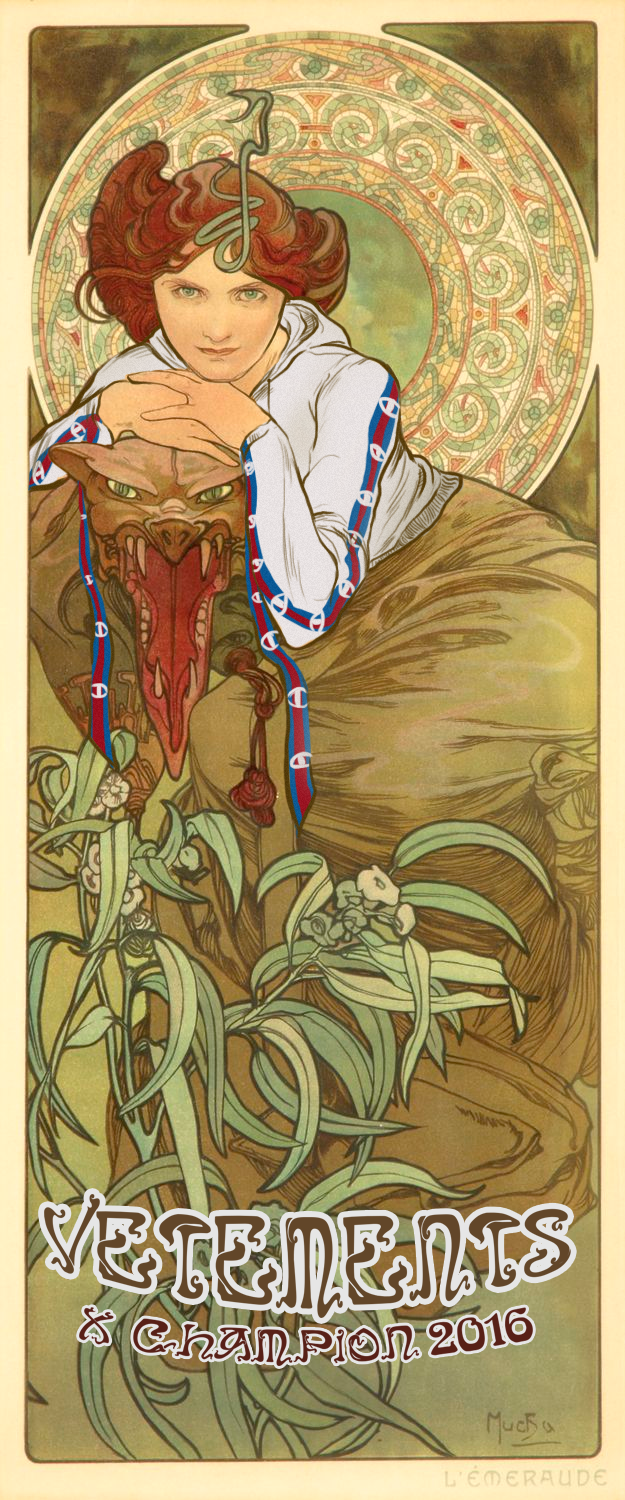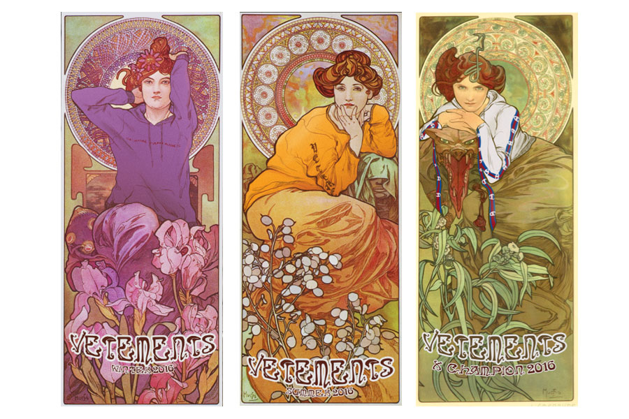Digitálna reprezentácia umeleckého smeru Art Nouveau. Reklamné plagáty pre značku Vetements. Digitálna ilustrácia oblečenia je umiestnená na dielach Alfonsa Muchu - Amethyst, Topaz a Emerald.