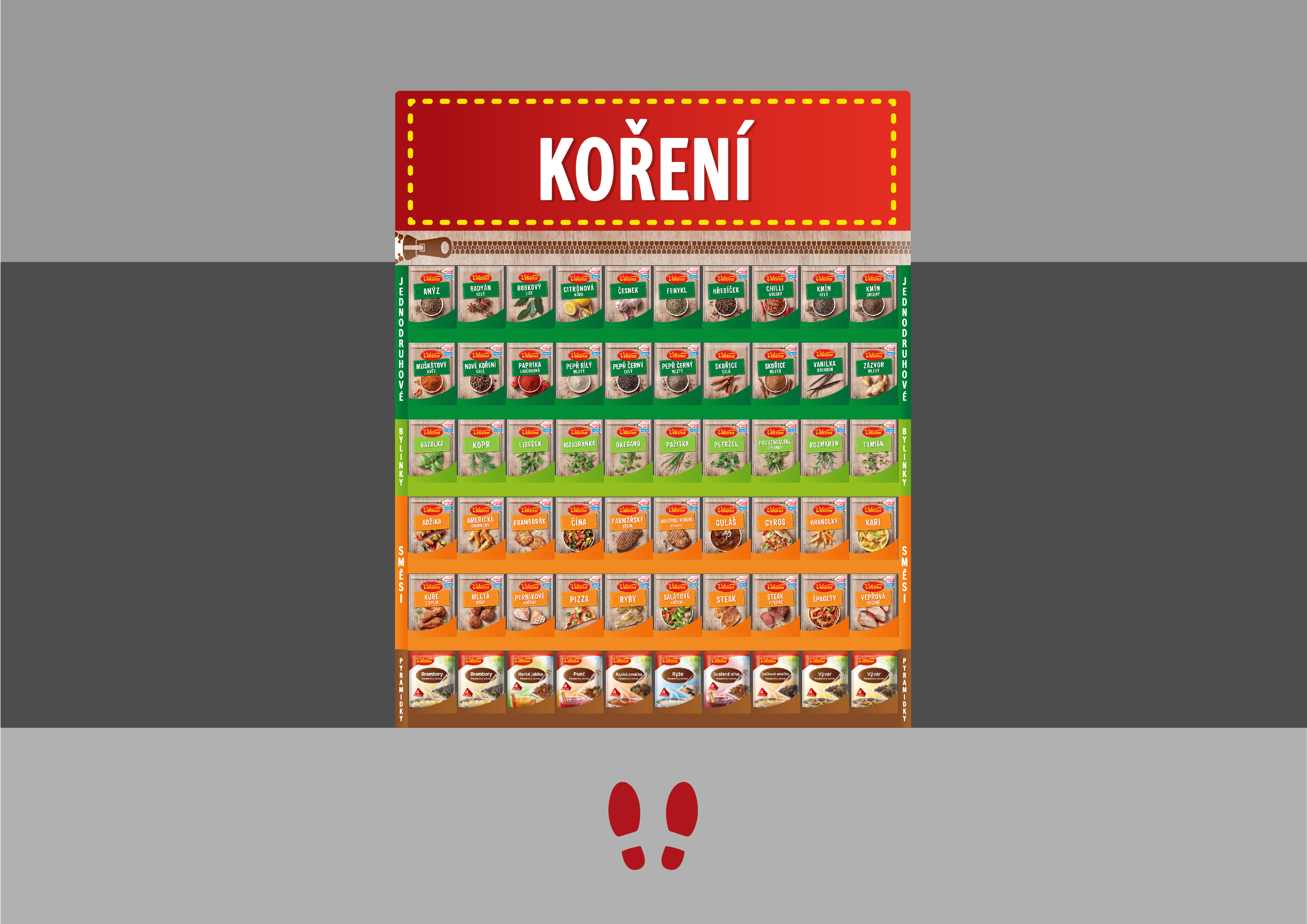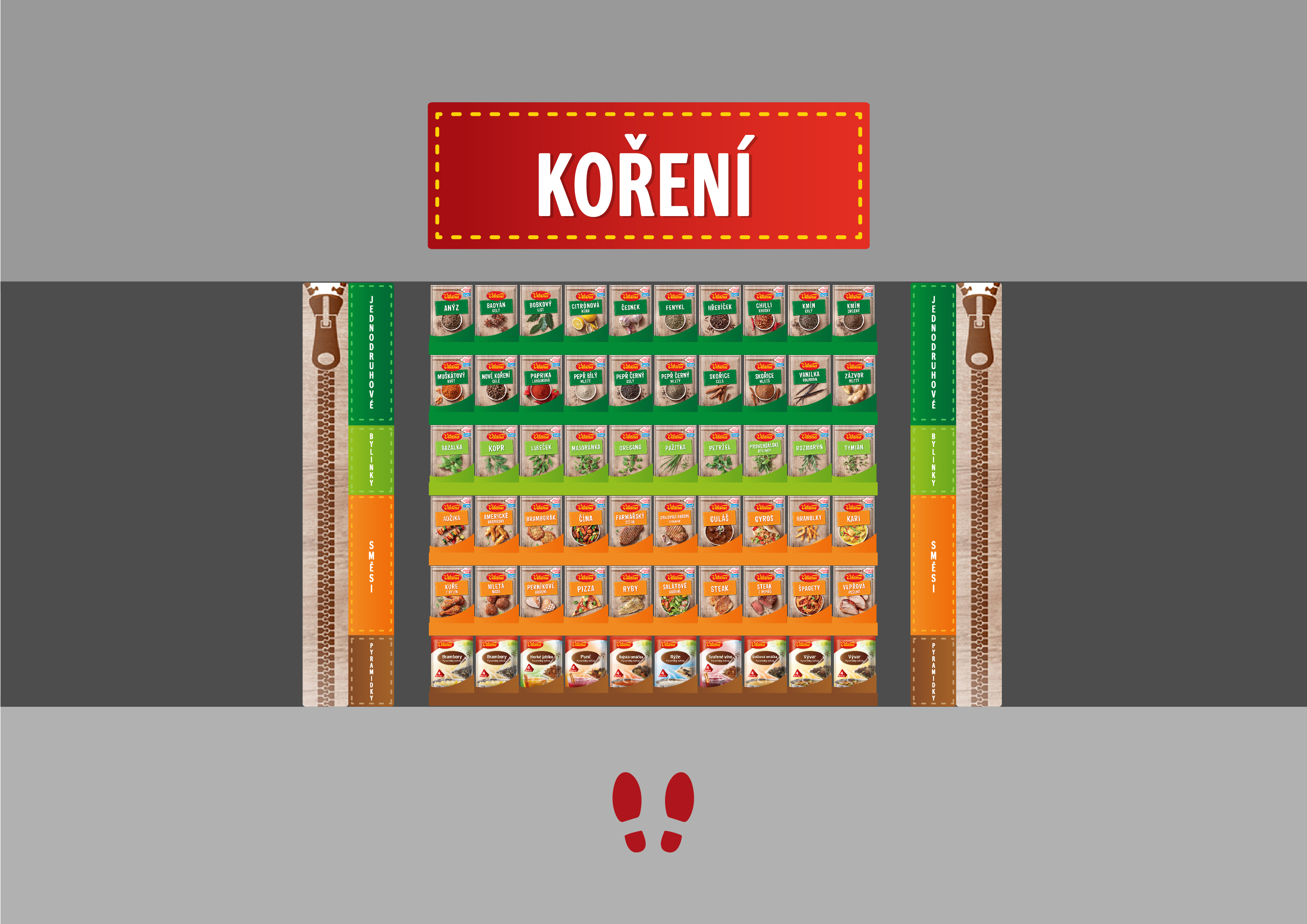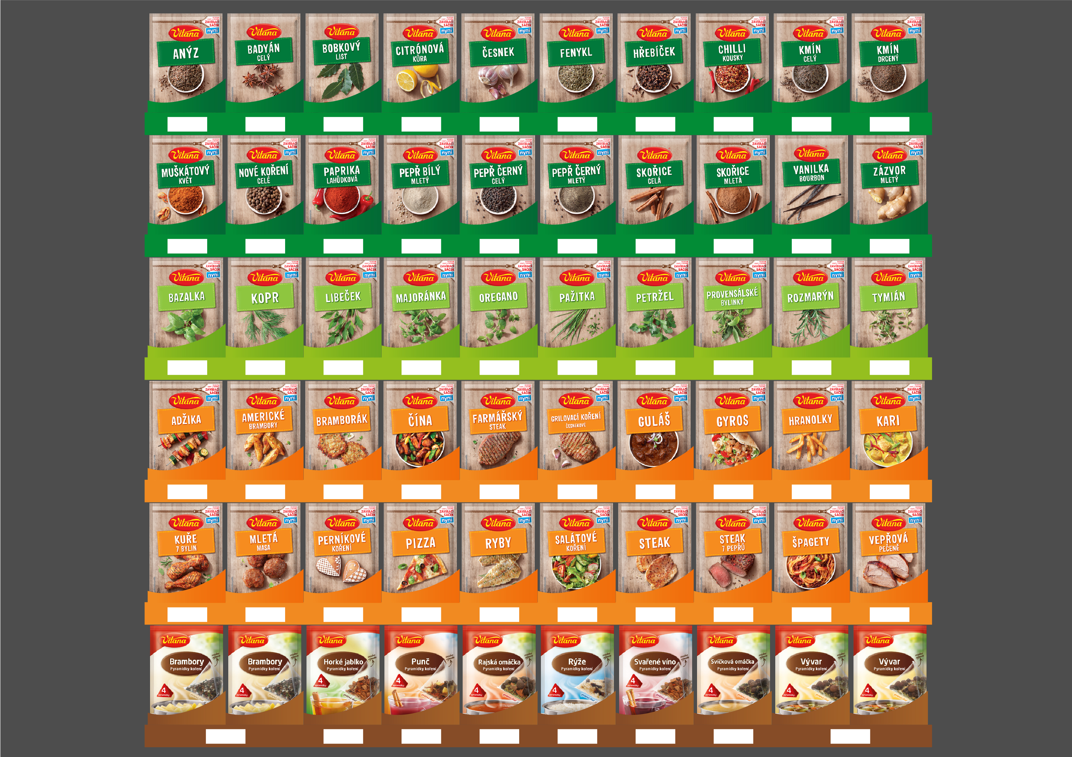 Design regálu značky Vitana pro zlepšení orientace v obchodních řetězcích Tesco a Albert.