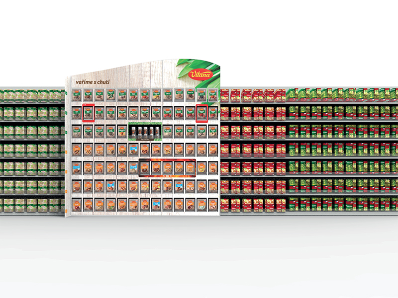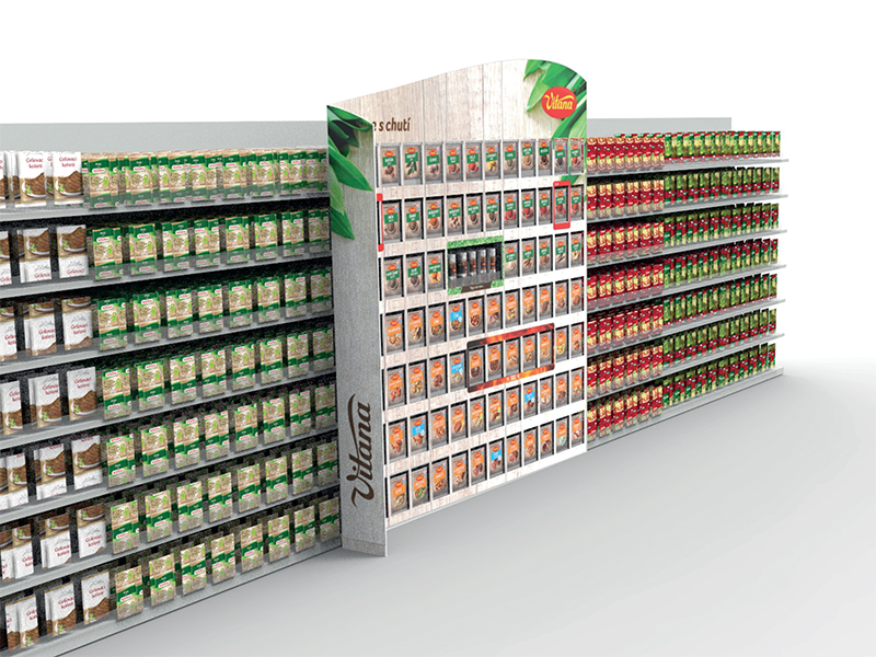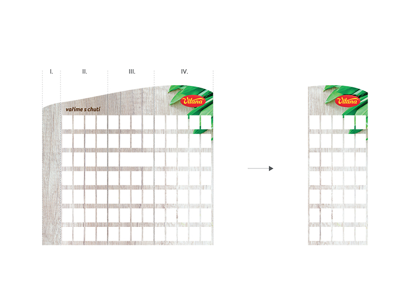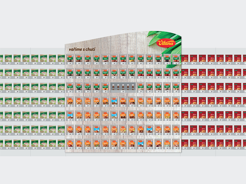 Jako první jsem řešil jak zvýraznit koření od Vitany tak, aby bylo jasně viditelné již z dálky, a také z rohu uličky v supermarketu (pro viditelnost z dálky přesahuje horní okraj přes regál / pro viditelnost z uličky vytáhnutý okraj do strany). Matrice je navrhnutá tak, aby ji šlo používat celý rok - nehledě na roční období (sezónní nabídky koření) + zvýraznění sezónního koření pomocí rámečků, které lze měnit dle potřeby (ná rámečku je výsek, na desce pouze výřez pro zastrčení. Ostatní koření řazeno dále podle abecedy. Rámečky lze použít také například pro koření ve slevě. Na bočním panelu abeceda pro lepší orientaci v regálu. Grafika panelu vychází z aktuálního vzhledu sáčků od vitany - světlé dřevo doplněné o logo vitany. Horní okraj desky je oříznutý podle křivky v logu. Celou desku lze složit na díl cca 45cm široký, tak aby její transport nezpůsoboval komplikace. Materiál zvolit podle délky používání - karton (levný, rychlejší opotřebení) na 1-2 roky, pokud déle tak už volit PVC (nevýhoda - vyšší váha, vyšší náklady, obtížnejší instalace). Upevnění k regálů pomocí závěsných háčků nebo pomocí pěnové oboustranné 3M pásky.