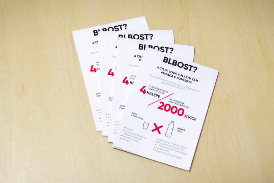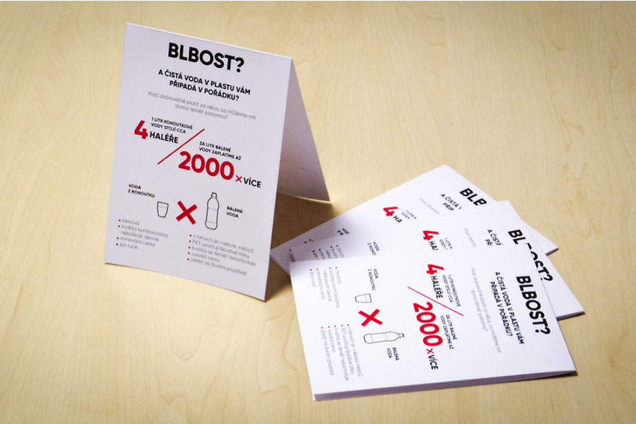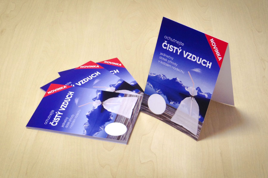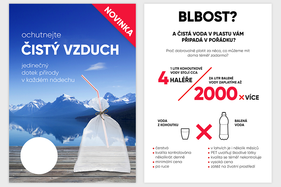 Úkol jsem zpracovala jako reklamu na balenou vodu ve formě stojánku na stůl. Abych upozornila na zbytečnost kupování vody, použila jsem místo lahve sáček s čistým vzduchem.
