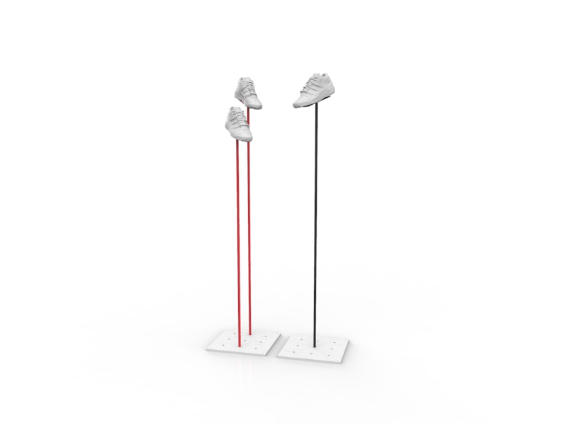 Stojan je určený na boty bez podpatku. Možnost využít na půlpár, pár a případně na další produkty. Stojan tvoří kovová tyč s destičkou, na které je umístěna protiskluzová podložka a je vysoký 120cm. Podstavu tvoří dvě vrstvy plexiskla 30x30cm.