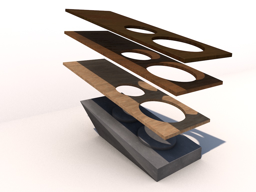 Betonové tělo s variabilní dřevěnou dýhou. Umožňuje přizpůsobit podstavec typu obuvi barvou dřeva či gravírovanou texturou.