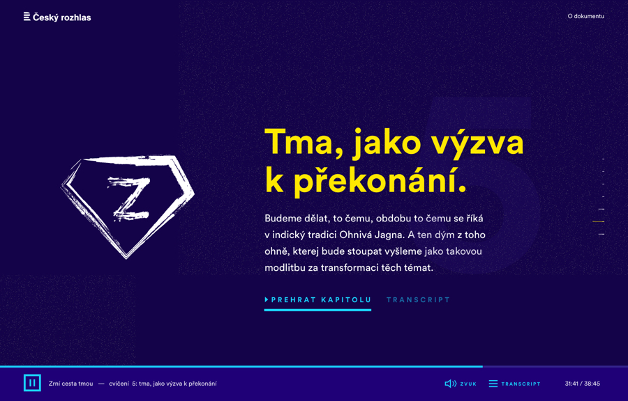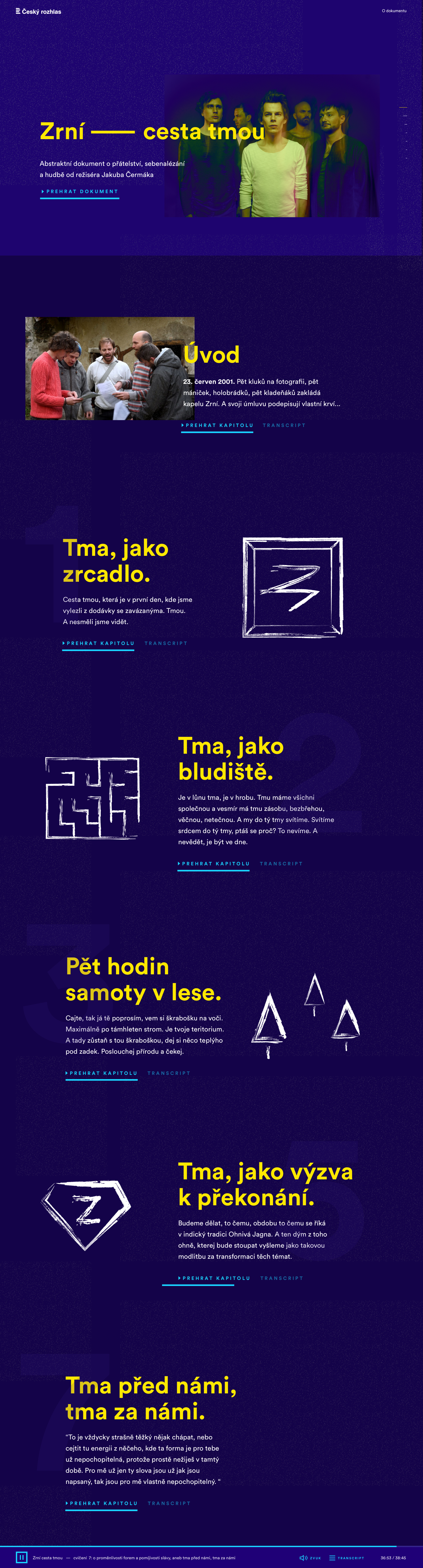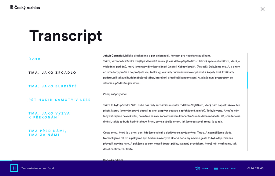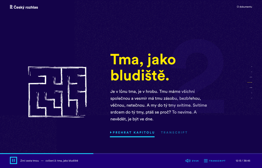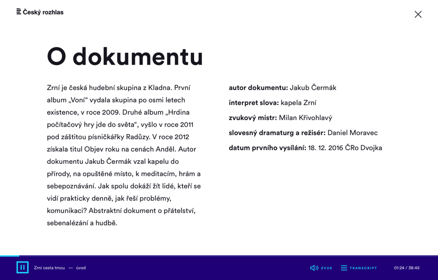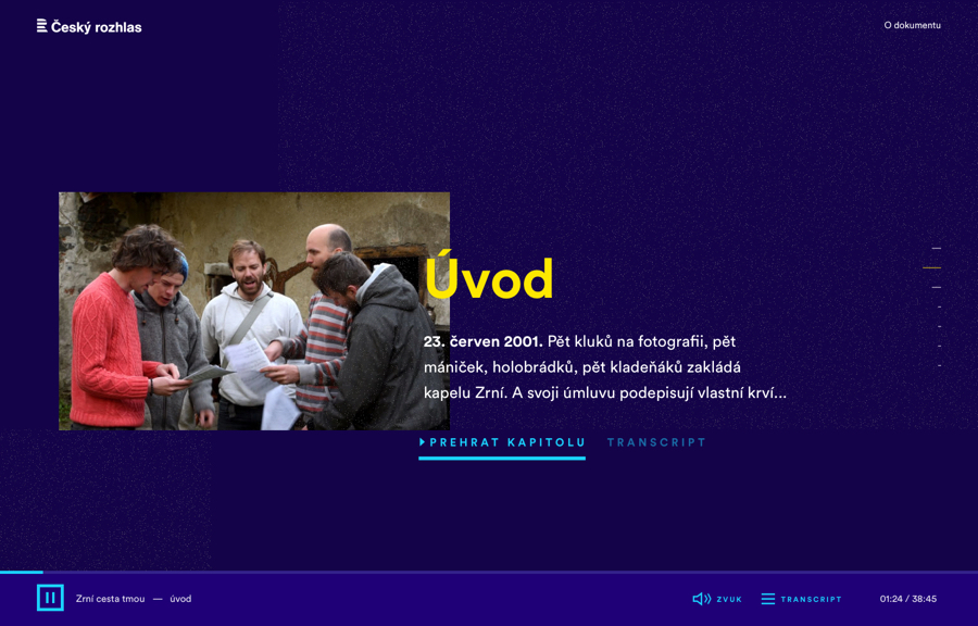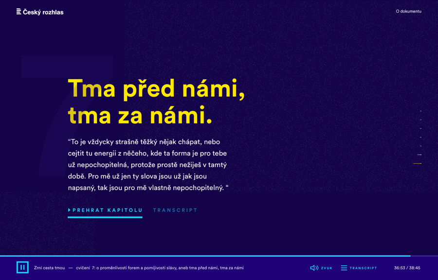 V klauzúrnej práci bolo mojim cielom vytvoriť interaktívnu prezentáciu audio dokumentu. Zvolim som teda formu webovej stránky, ktorá slúži ako webový prehrávač, umožňuje tiež zobrazovať prepis textu a samozrejme info o audiodokumente. Taktiež bolo mojim cielom zlepšiť svoje znalosti v After Effect, čo sa mi myslim podarilo. Vytvoril som motion video, ktoré zobrazuje interakciu a animácie na webe.