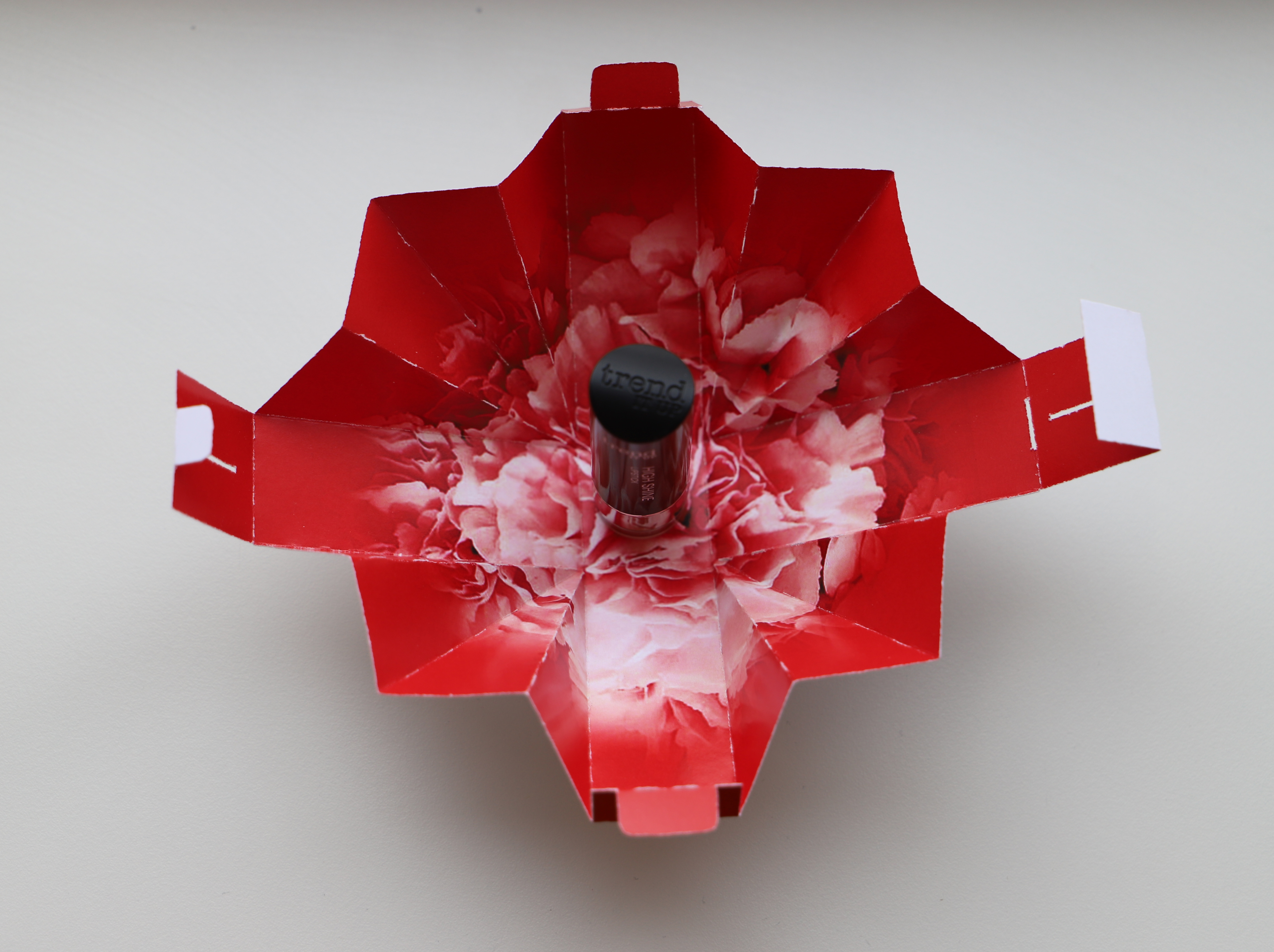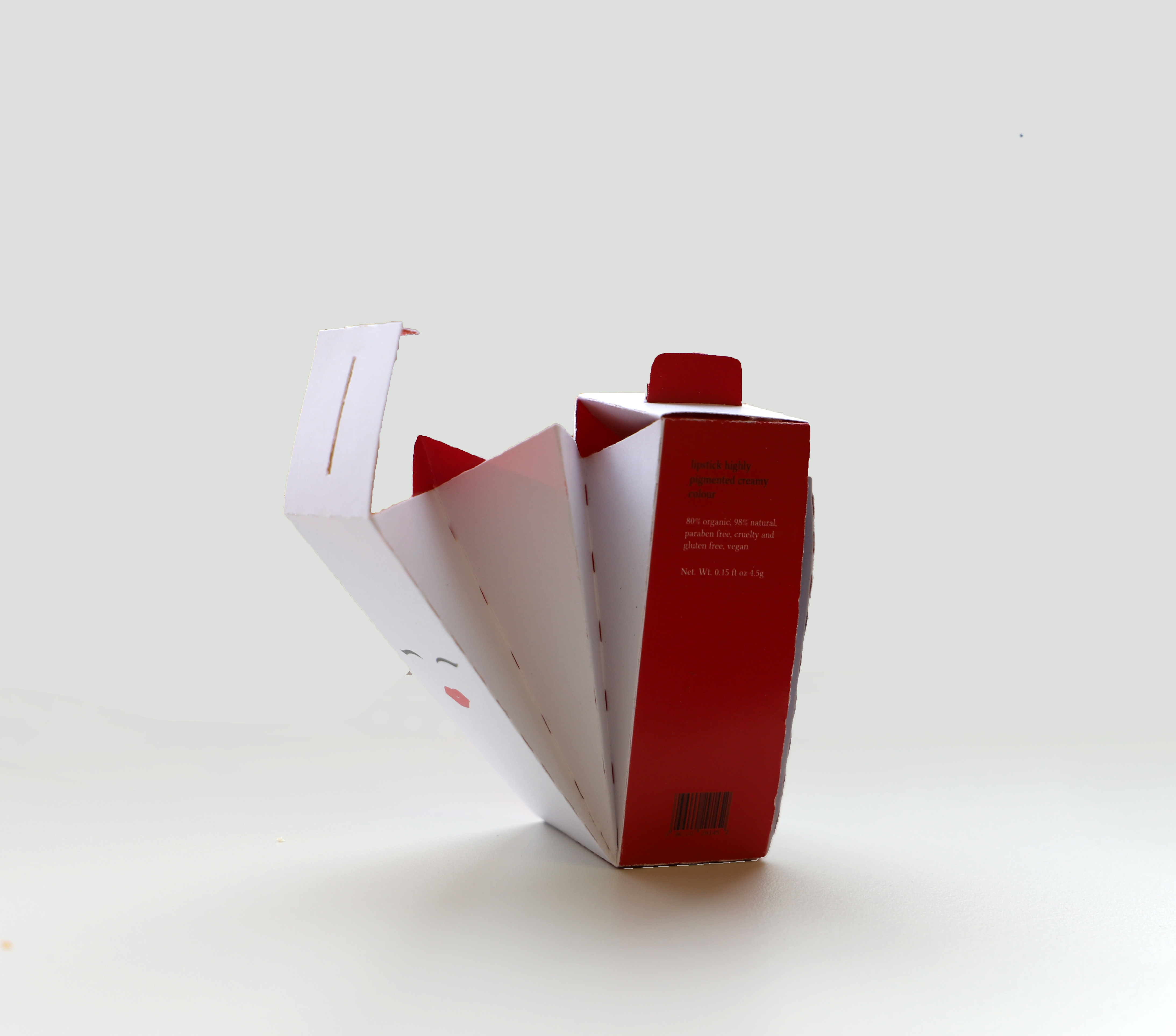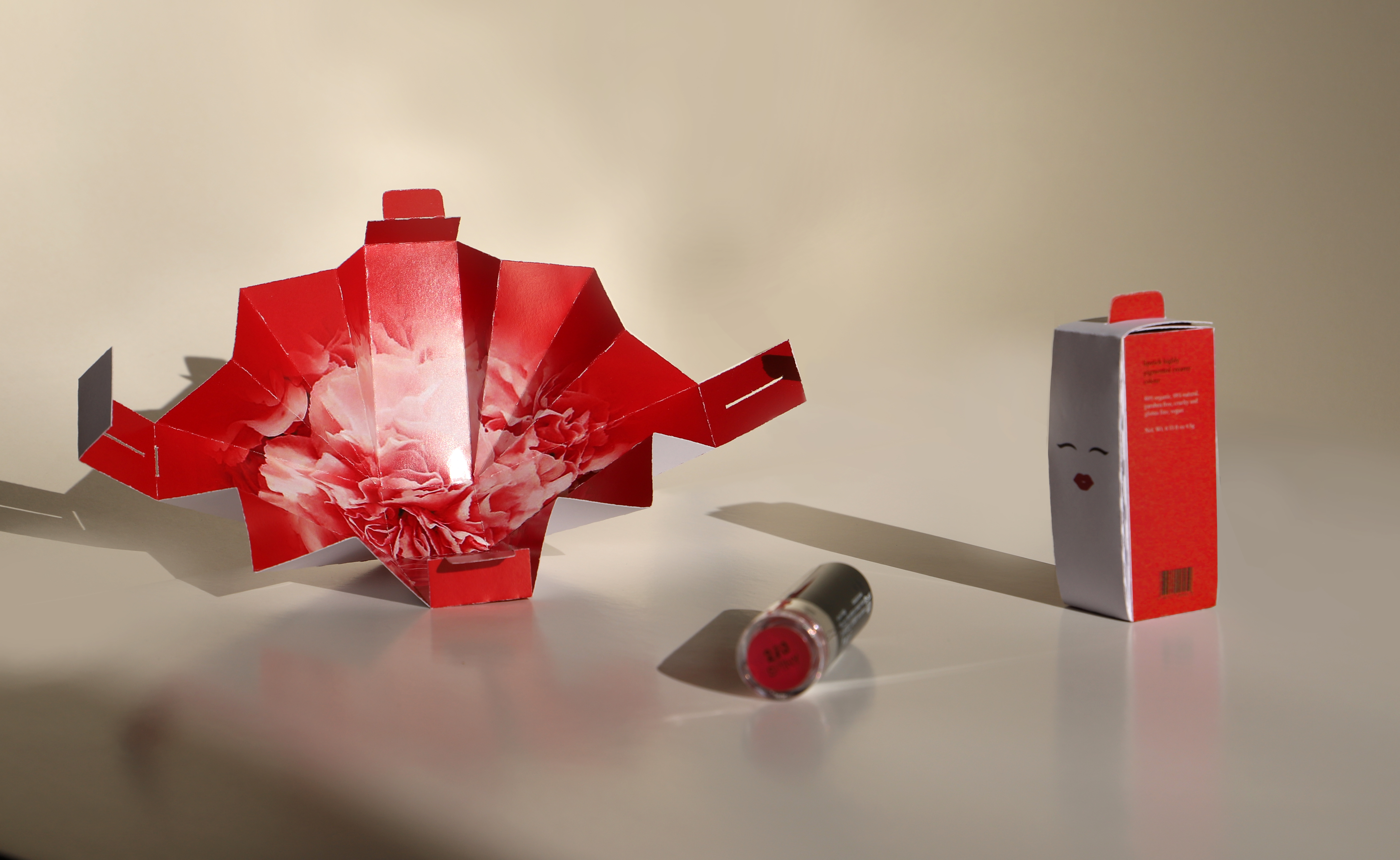 Návrh obalu rtěnky, která se má při rozbalování rozkvétat na rukou.