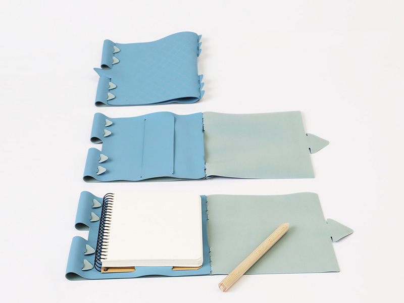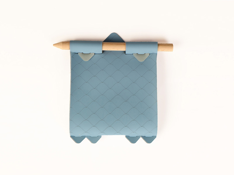 Princípom diplomovej práce je využitie nerecyklovateľného plošného odpadu na produkciu malých obalov alebo iných priestorových predmetov dennej potreby. Vysekávaním materiálu a jeho následným spájaním pomocou suchých zámkov je docielená minimálna energetická náročnosť. Výsledkom sú dva obaly na zápisník a pero, ktoré pri nich slúži ako poistka zámku. Oba nadväzujú na už existujúci peračník a obal na slúchadlá vyrobených rovnako z ofsetovej gumy.