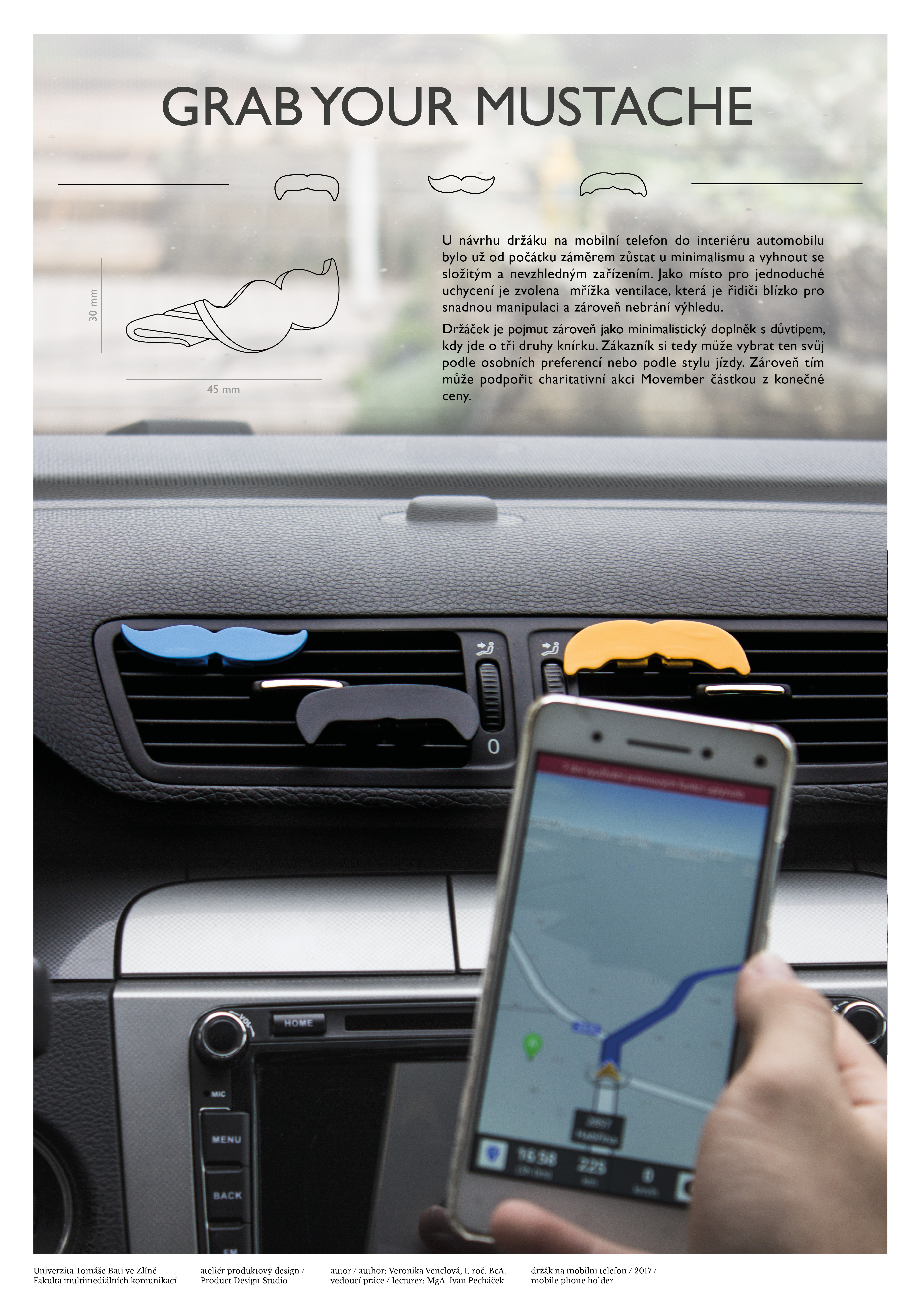 Magnetický držák na mobilní telefon do mřížky ventilace automobilu je pojmut jako minimalistický doplněk s důvtipem. Na výběr je ze tří druhů knírku ať už podle osobní preference nebo stylu jízdy. Zároveň tím zákazník může podpořit charitativní akci Movember částkou z celkové ceny.