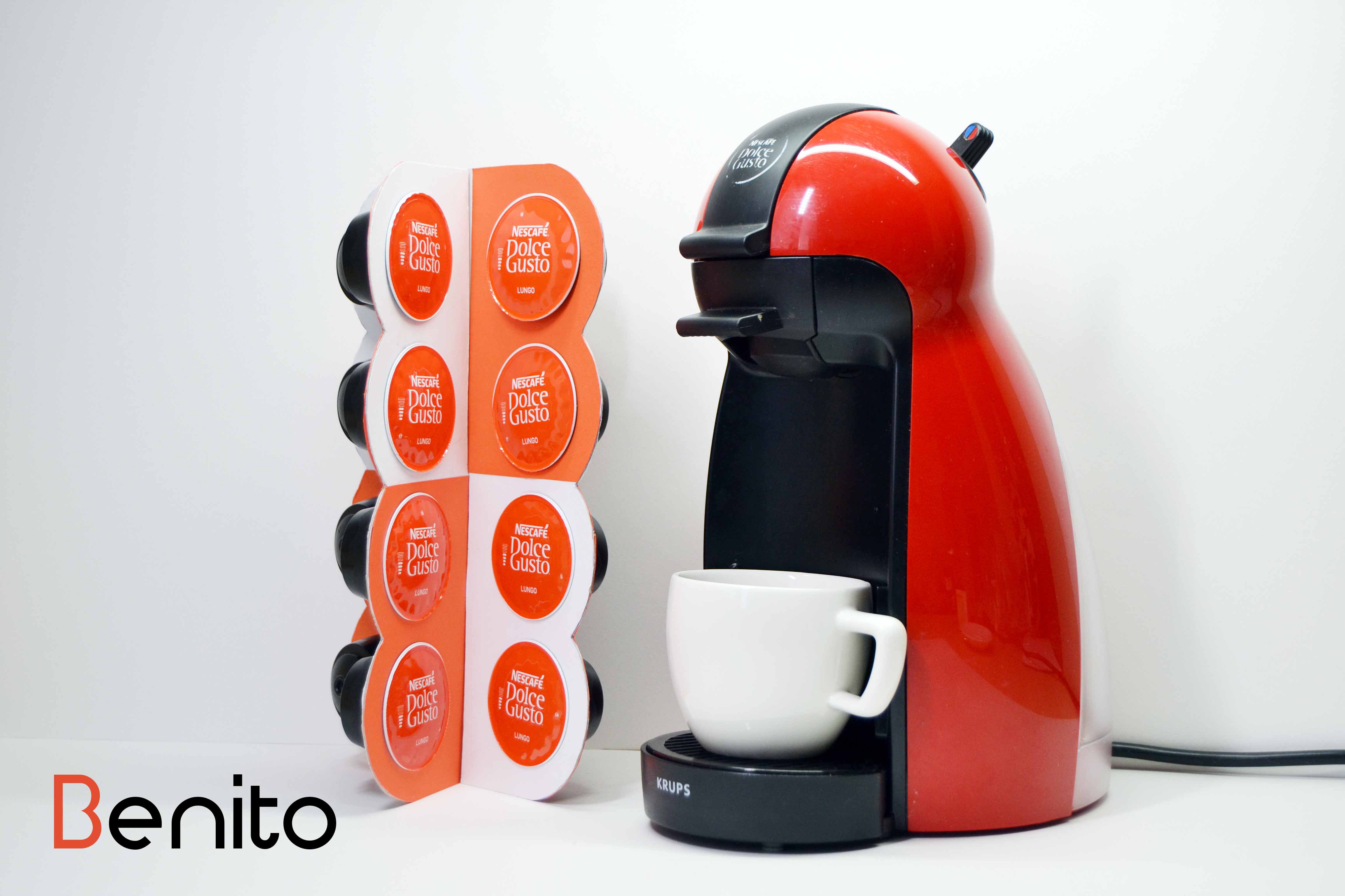 Benito je jednoduchý obal na kapsule Dolce Gusto, ktorý sa po otvorení zmení na stojan. Farebná grafika slúži aj pre ľahšiu orientáciu medzi kapsulami. Stojan je jednorázový produkt s možnosťou recyklácie.