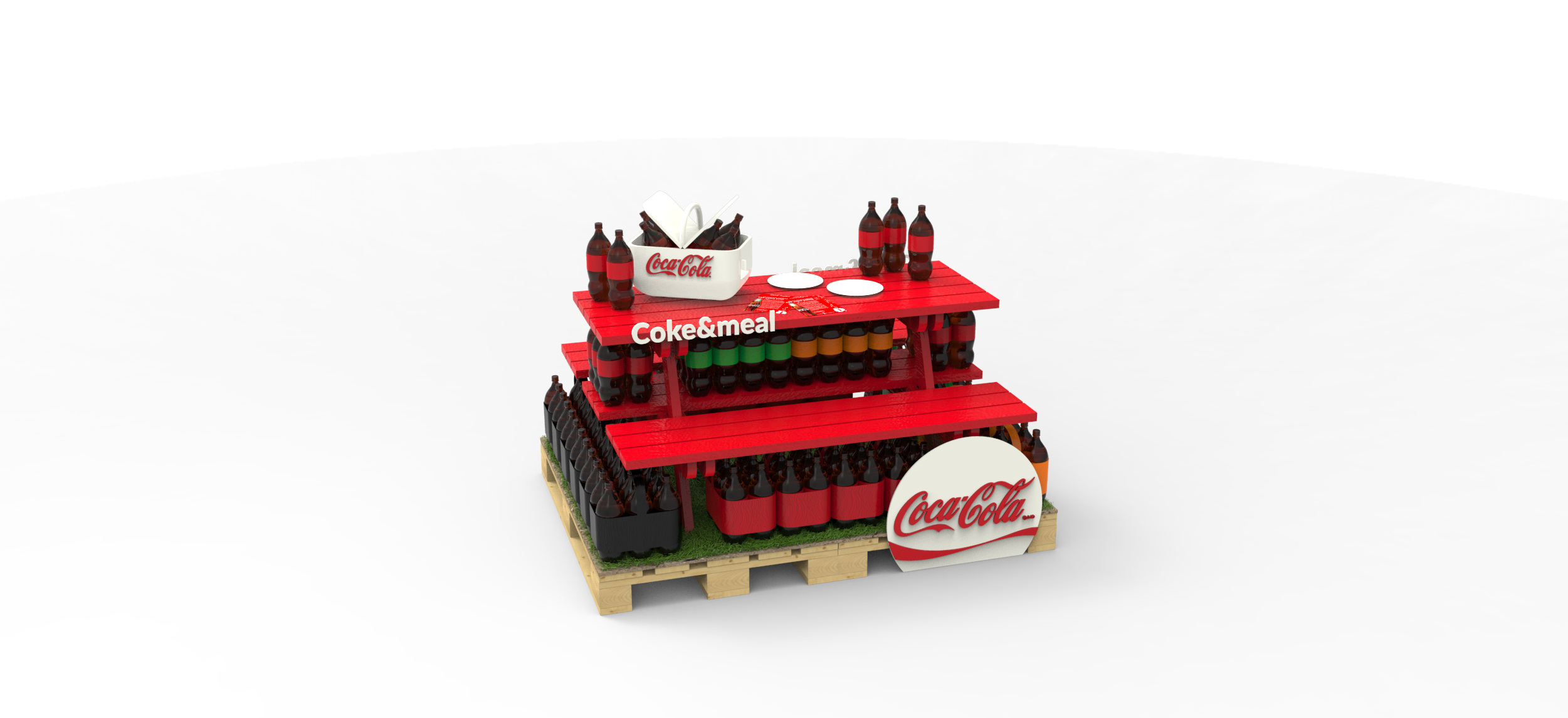 Hlavní inspirací prodejního stojanu mi byla kampaň Coke&Meal, jejíž cílem je evokovat ve zvyklostech spotřebitelů spojení nápoje a jídla jako neodmyslitelnou součást při jeho konzumaci.