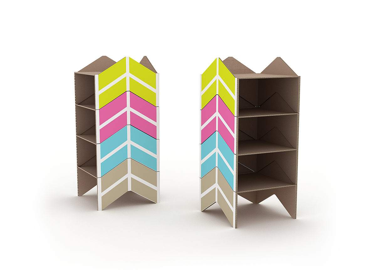 Nábytek pro děti složený ze čtyř stejných prvků, které do sebe zapadají. Otáčením a skládáním vznikají různé kombinace - lavice, úložný regál nebo stůl se stoličkou.