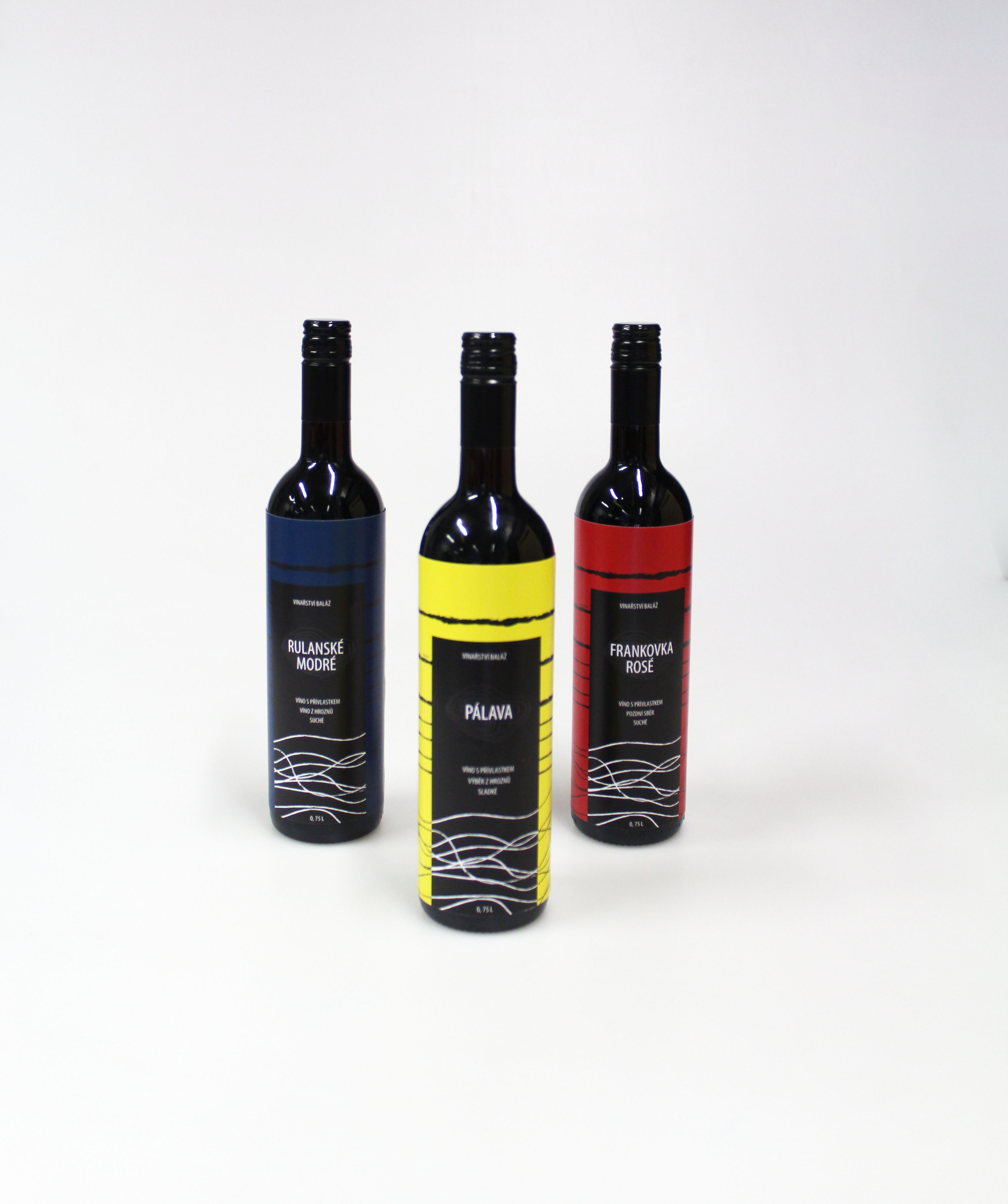 Sada etiket na víno bílé, červené a růžové pro vinařství Baláž. Vytvořila jsem etikety pro dva typy lahví průhledné a černé. Na každé z etiket se nachází skrytý vtip. Linie na ní značí stav člověka při vypití vína. Začátek je klidný, proto jsou linie vodorovné a postupně se začínají vlnit.