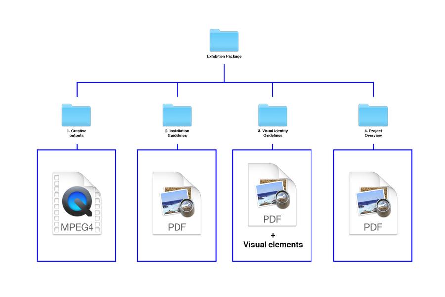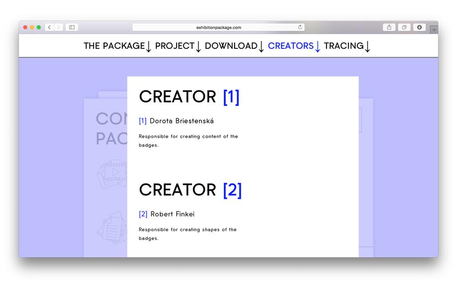 An exhibition is prepared and all its components can be found in a virtual package. The content of the package are creative outputs, all curatorial texts, instructions for installation and guidelines for applying visual identity. The package can be found and downloaded only from exhibitionpackage.com website.