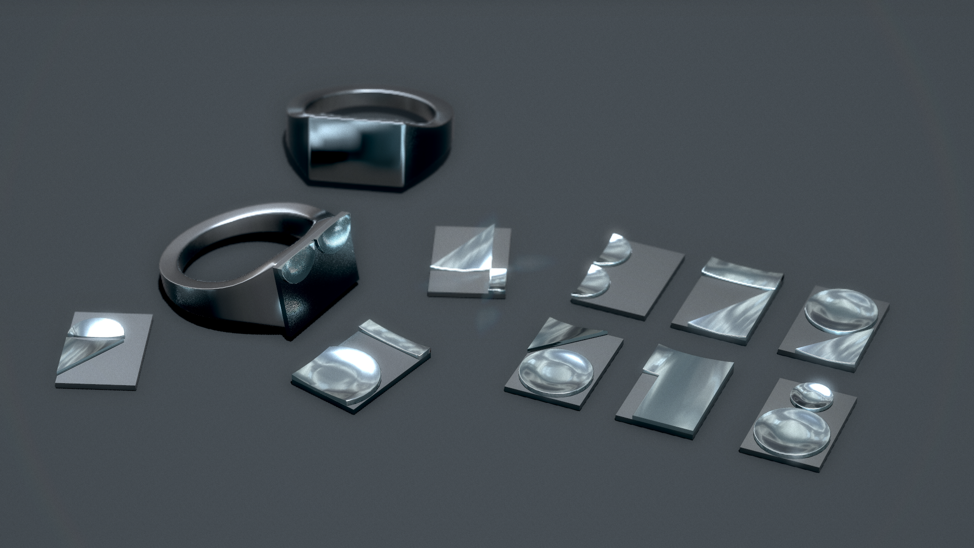 Šperk inšpirovaný matematikou.Sada deviatich brošní a prsteňov, ktorých dizajn je vytvorený štylizovaním čísel do geometrických tvarov.