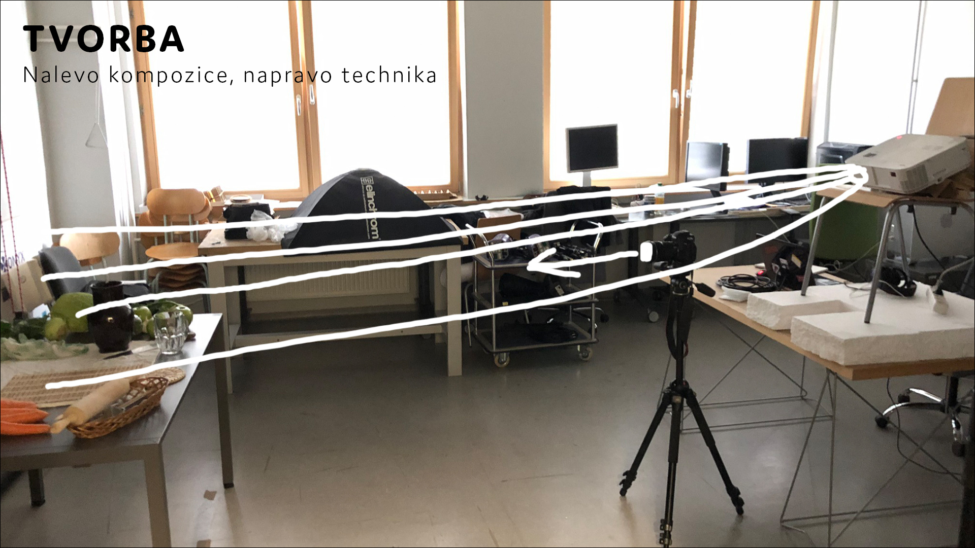 Jídlo jako inspirace - vizuální experiment. Pro tento úkol jsem se rozhodl vytvořit mapping na jídlo. Jelikož se jídlo rychle kazí a tvorba mappingu je zdlouhavá, tak mým úkolem bylo vytvořit mapping, který se dá rychle přetvořit pomocí masky na jakoukoli kompozici. Chtěl jsem si vyzkoušet zda je to vůbec možné mapovat na jídlo.