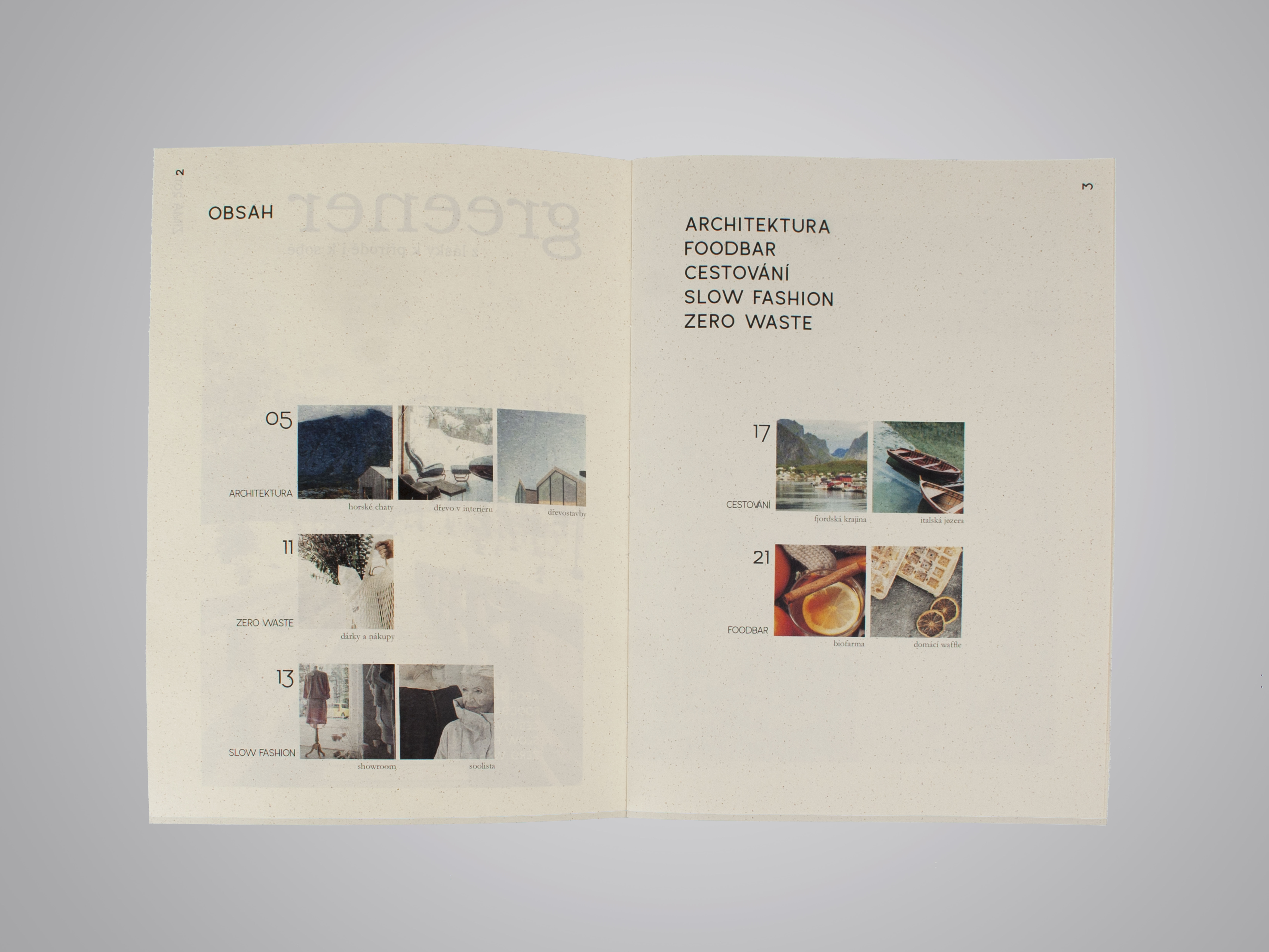 GREENER je název mého lifestylového čtvrtletního časopisu o zdravém jídle, inovativních a ekologických stavbách, slow fashion, cestování a ekologickém způsobu života. Tématicky je zvolen i papír pro časopis s využitím pivního odpadu. Tištěná i digitální podoba, rozměr A4.