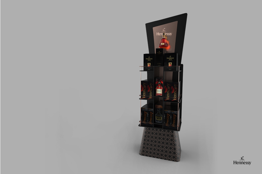 Návrh Off-trade stojanu pre značku Hennessy. Geometria, využitie korporátnych farbieb, odolnosť, prémiovosť sú charakteristickými črtami riešenia. Objem je 40 fliaš - 3 poschodia, 3 rôzne druhy (X.O., VSOP, Very Special). Prezentačná maketa fľaše X.O. je uchytená do konštrukcie a vymeniteľná.