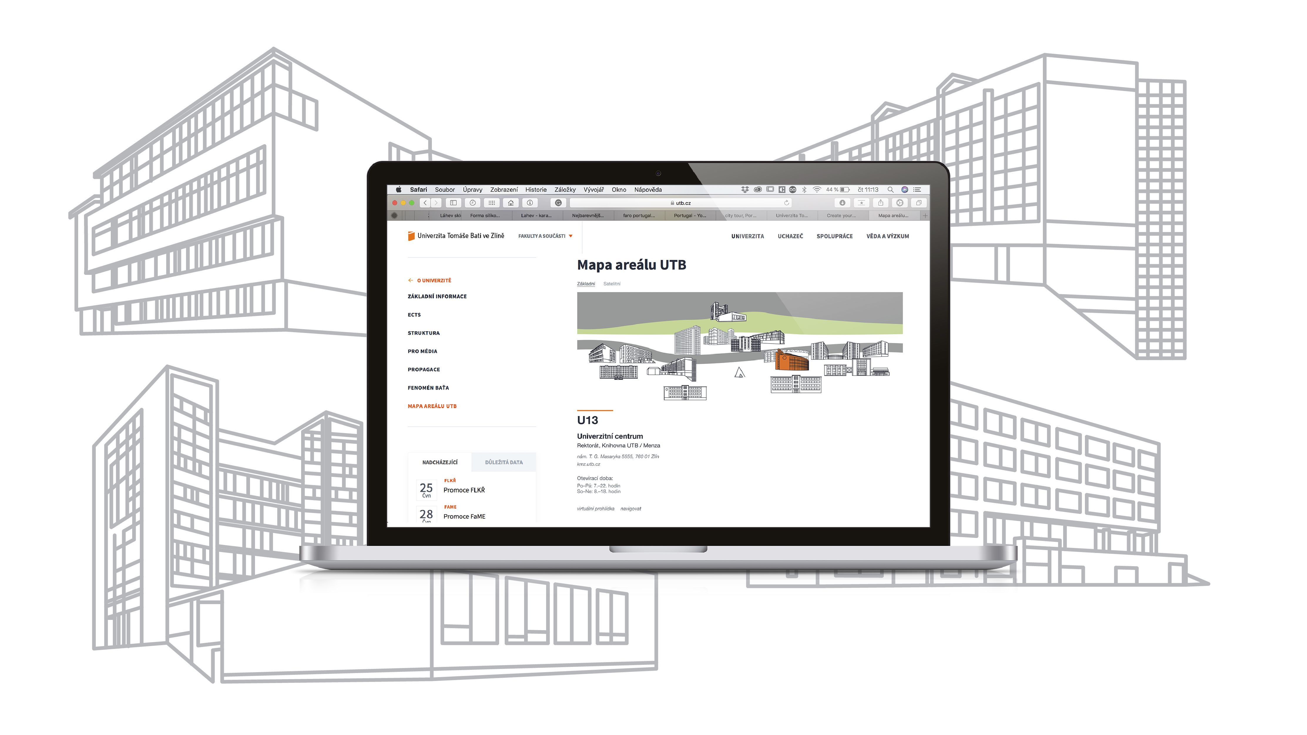 Hlavním cílem této práce bylo vytvořit interaktivní mapu pro web UTB, která by fungovala jak v digitální formě na webové stránce, tak v tištěném médiu. Ve svém konceptu jsem použil lineární vektorovou kresbu v křivkách, která vyobrazuje jednotlivé budovy kampusu univerzity. Grafika je plochá a výborněfunguje jak v digitální, tak v tištěné podobě.