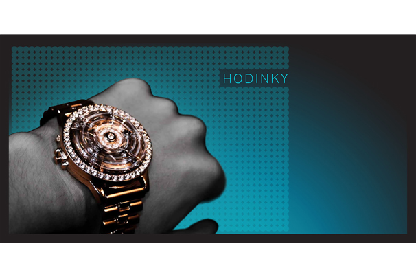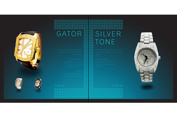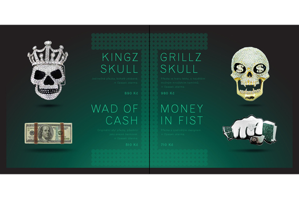 Grafický návrh katalogu prezentující "gansterské" šperky.