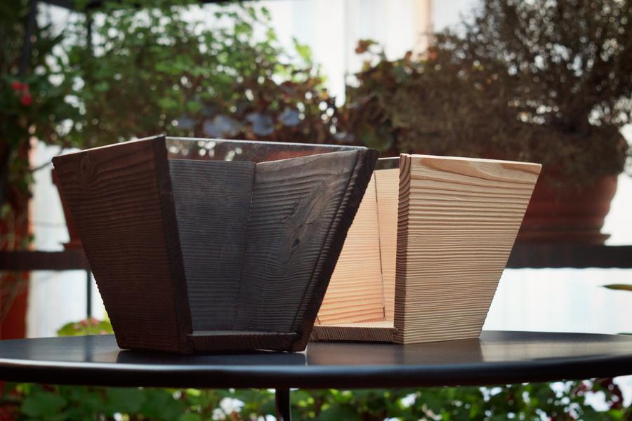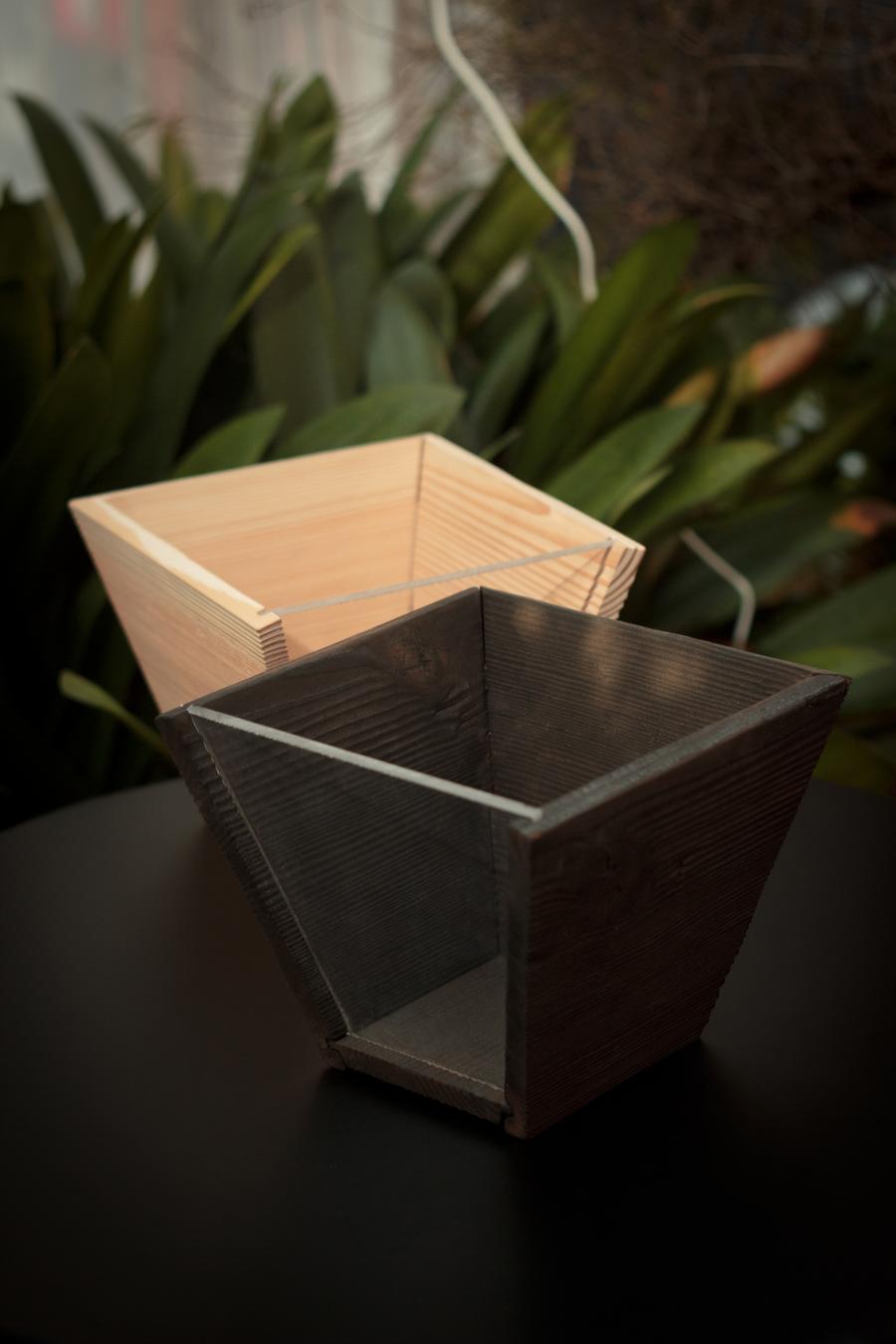 Květináč je vyroben ze dřeva a jedna strana je tvořena plexisklem, díky němuž máme možnost pozorovat více do hloubky přírodu - hlínu, ve které je květina zasazena. Květináč se řadí mezi typ uzavřeného květináče, proto je vhodné do spodní části nasypat drenáž. Ta zadržuje vodu, která nemá kam odtékat.