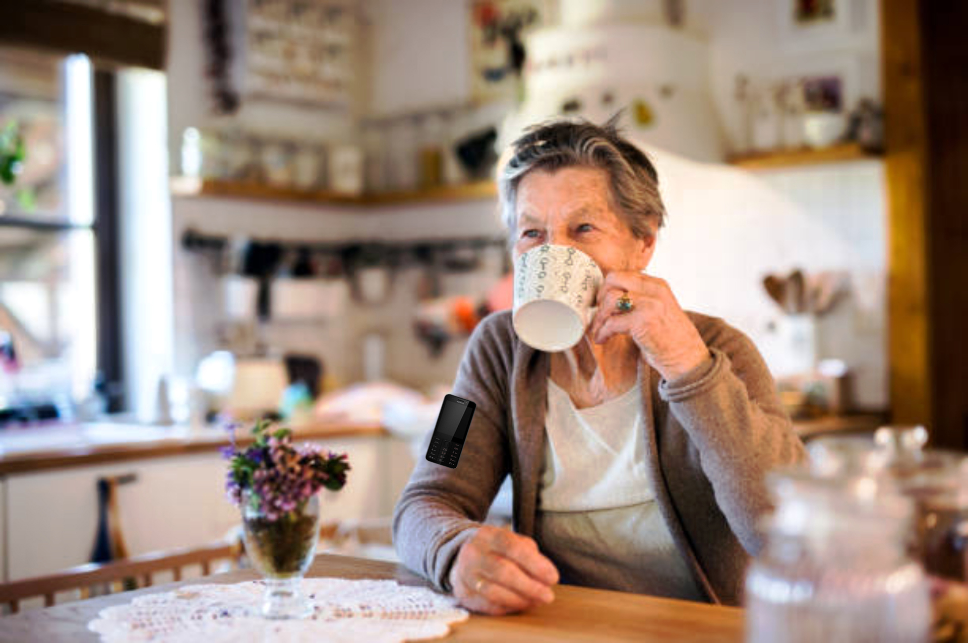 Praktický držák na mobilní telefon určen pro důchodce primárně do domácího prostředí.