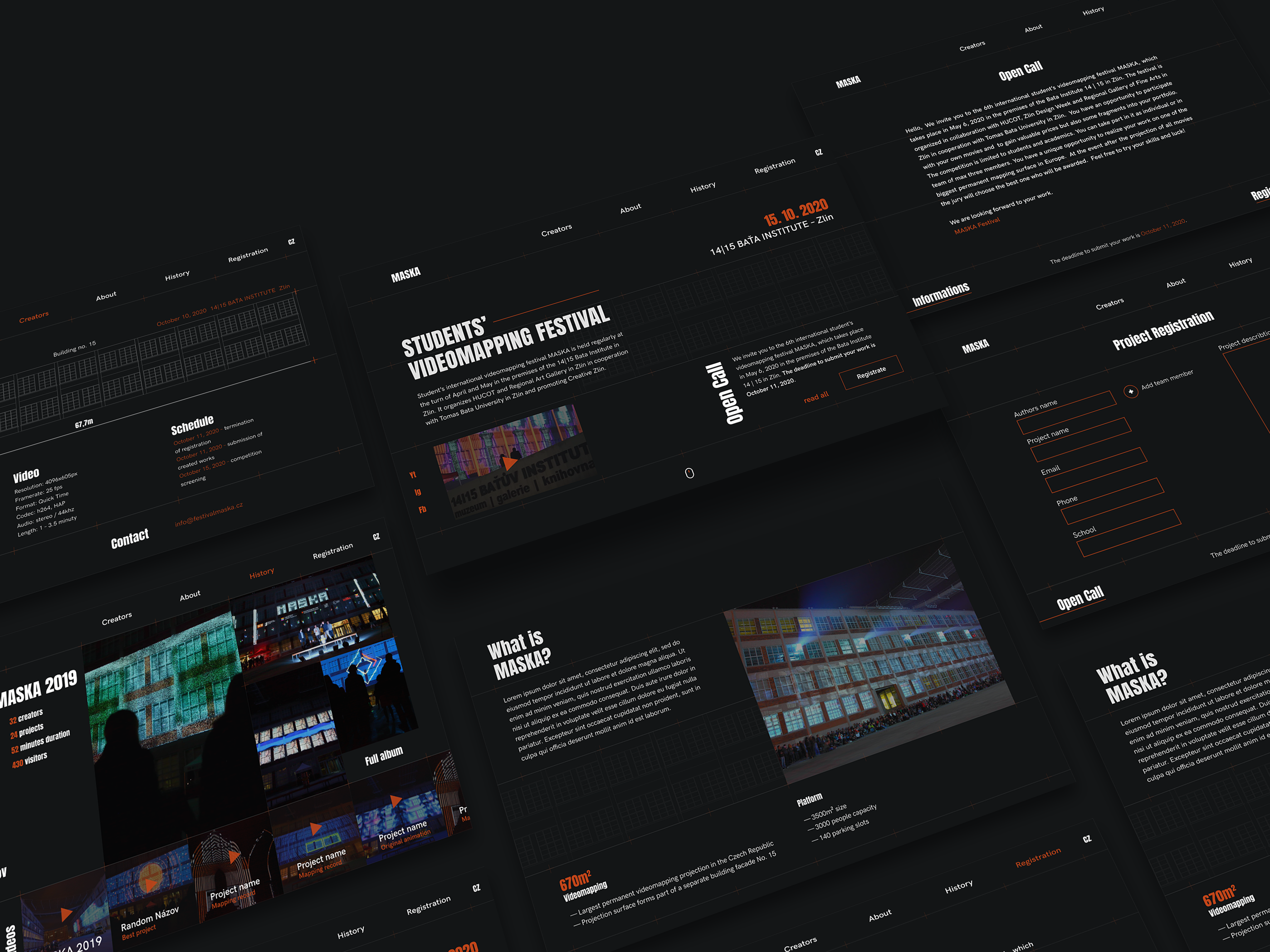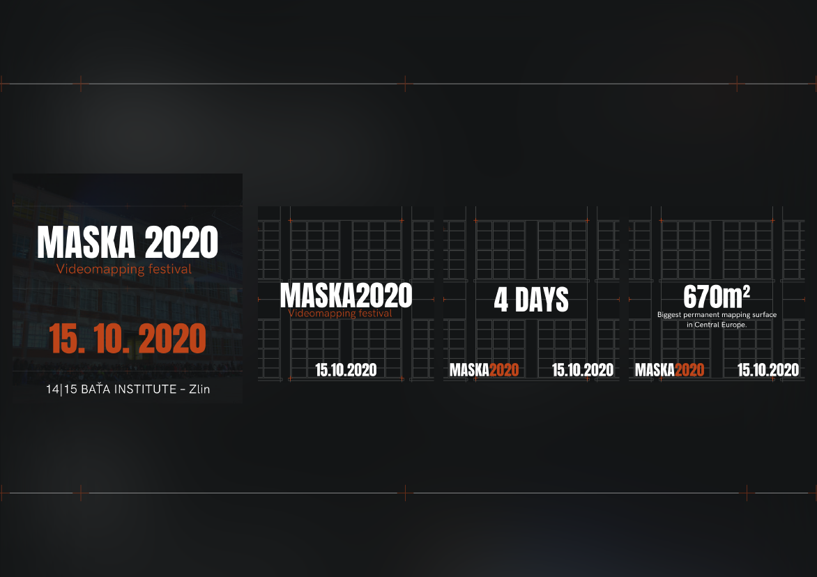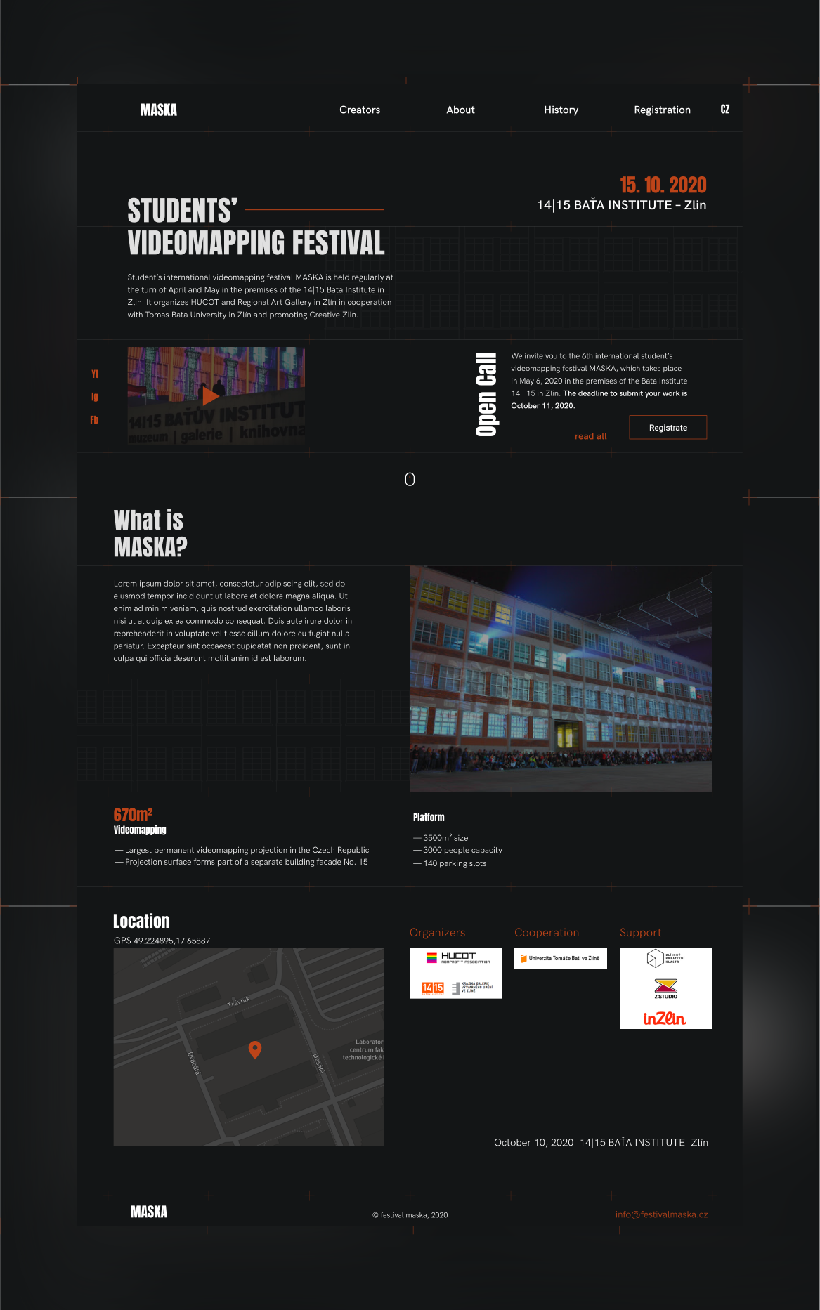 Návrh nového vebu mappingového festivalu som ladil do tmavých farieb v kombinácii so sýtou oranžovou, ktorá má poukazovať na zázemie festivalu a tehlovú fasádu Zlína a Baťovho inštitútu. Web je delený pomocou horizontálnych čiar a oranžových krížikov, ktoré odkazujú na pôvodný, horizontálne natiahnutý mapping. Web má byť jednoduchý, s použitím jemnej grafiky masky 15. budovy.