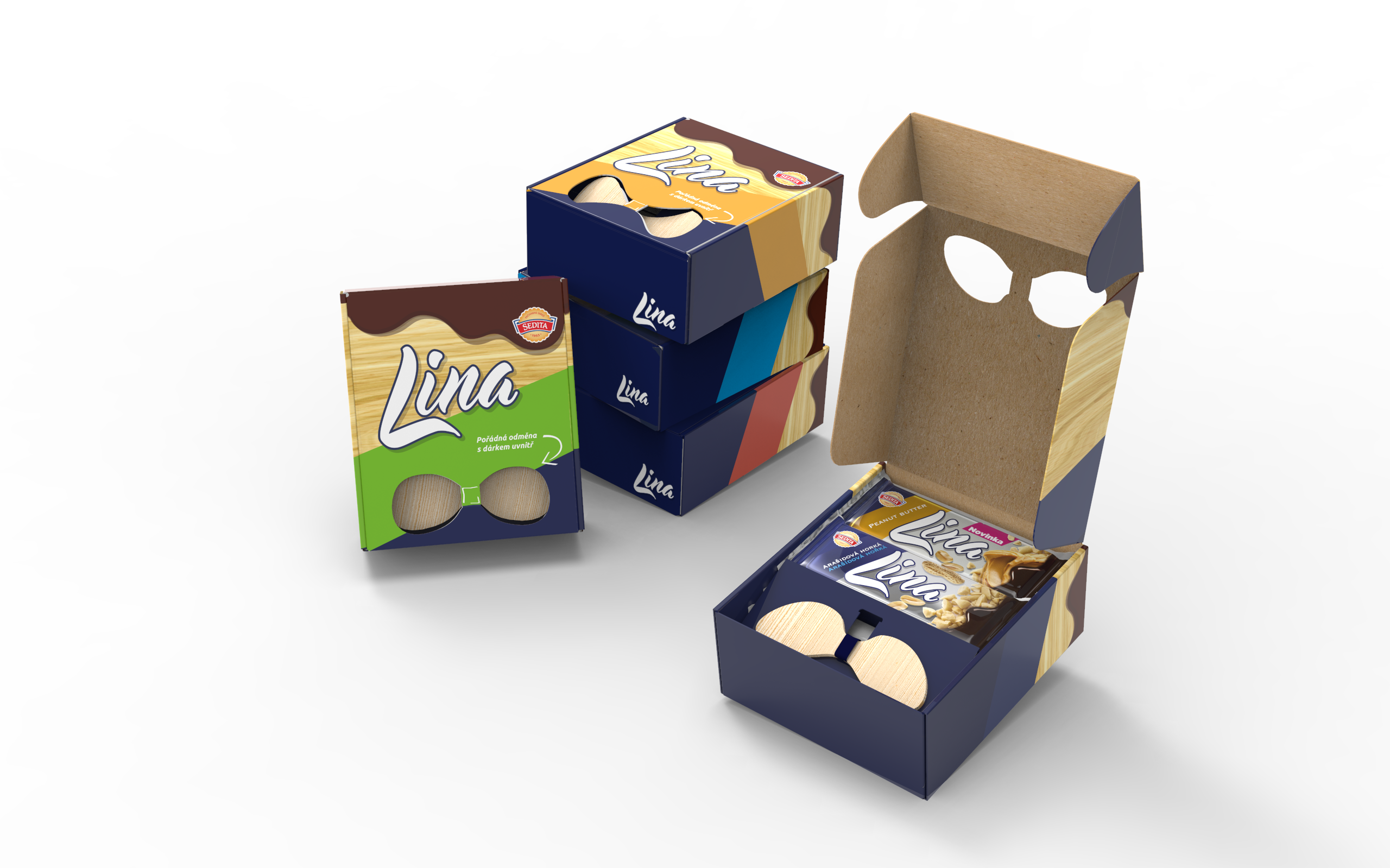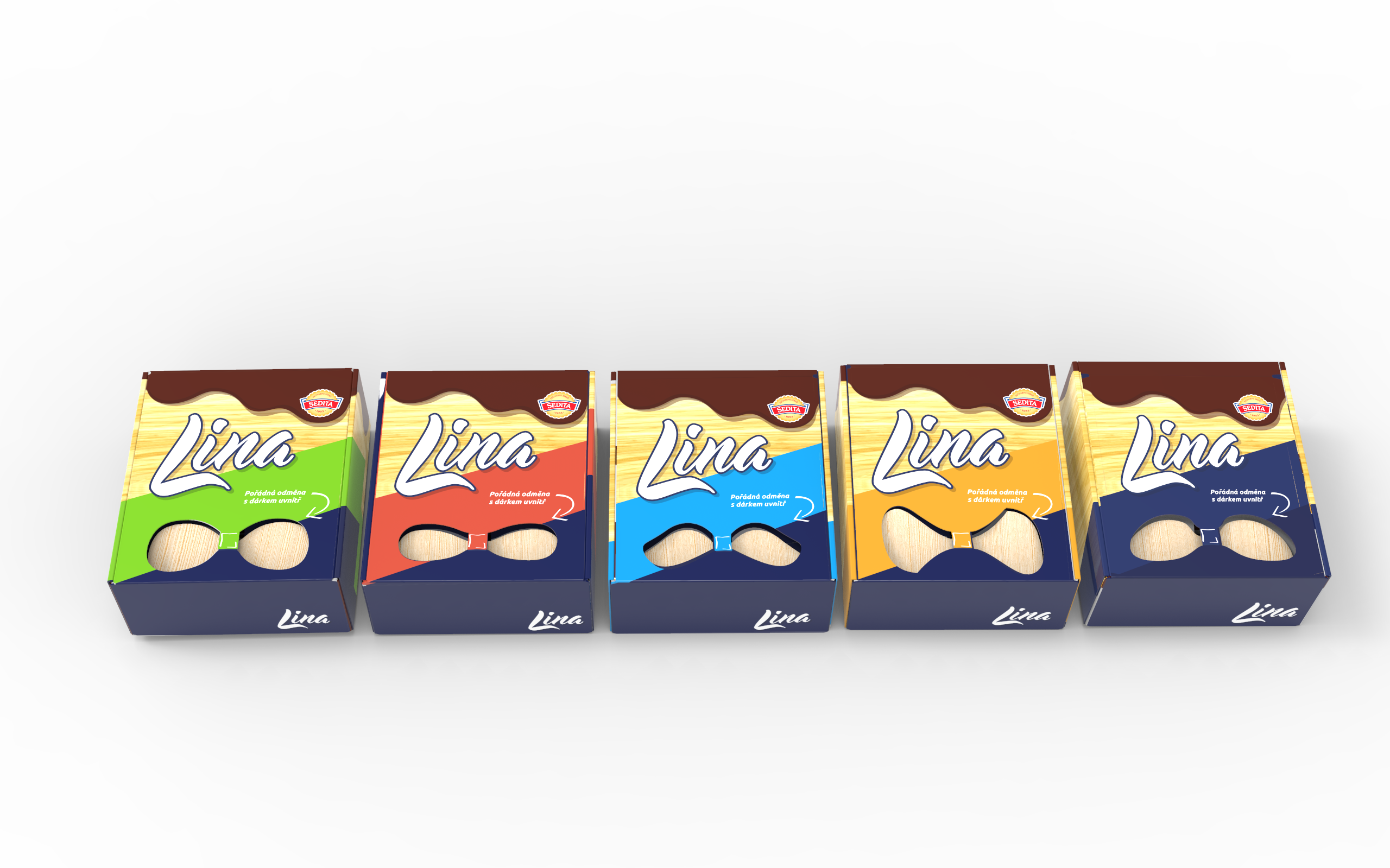 Zadáním bylo vytvořit prémiový obal na oplatky značky Lina s přidanou hodnotou. Tou je zde pánský dřevěný motýlek k obleku v pěti tvarových variantách stylizovaných ořechů. Každá z variant reaguje svým tvaroslovím a barevností na jednu z příchutí. Na krabicích se objevují stejné grafické prvky, mění se pouze barva a výřezy motýlků.