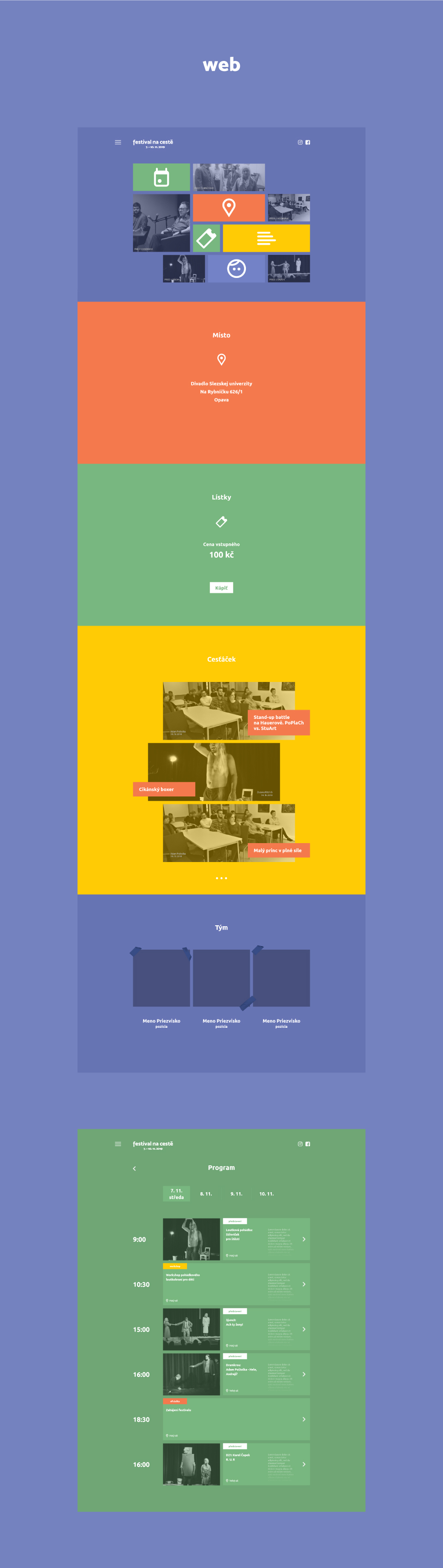 V rámci webu som sa zameral na jednoduchosť a obnoviteľnosť pre ďalšie roky, a to najmä minimalistickým spracovaním jednotlivých stránok tak, aby organizátori mali čo najmenej práce s prípravou webu. Užívateľ pri otvorení stránky uvidí farebné menu v štýle „metro“ s ikonami, odkiaľ sa môže dostať na jednotlivé podstránky. Toto menu je doplnené o feed z instagramu, takže sa stránka oživuje len samotným pridávaním príspevkov na sociálnych sieťach.