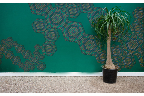 Ornament vznikl z dětské hry mozaika. Jejím následovným zpracováním jsem chtěla vytvořit novou možnost využití polepů na stěnu v interiéru.