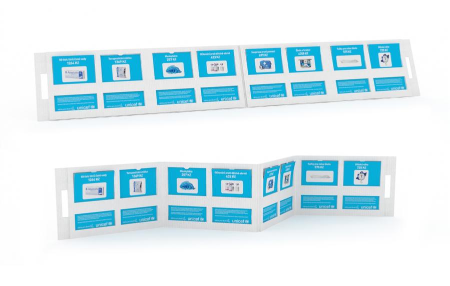 P. O. P. leporelo pro UNICEF je lehké, snadno přenositelné s kapacitou 160 certifikátů.