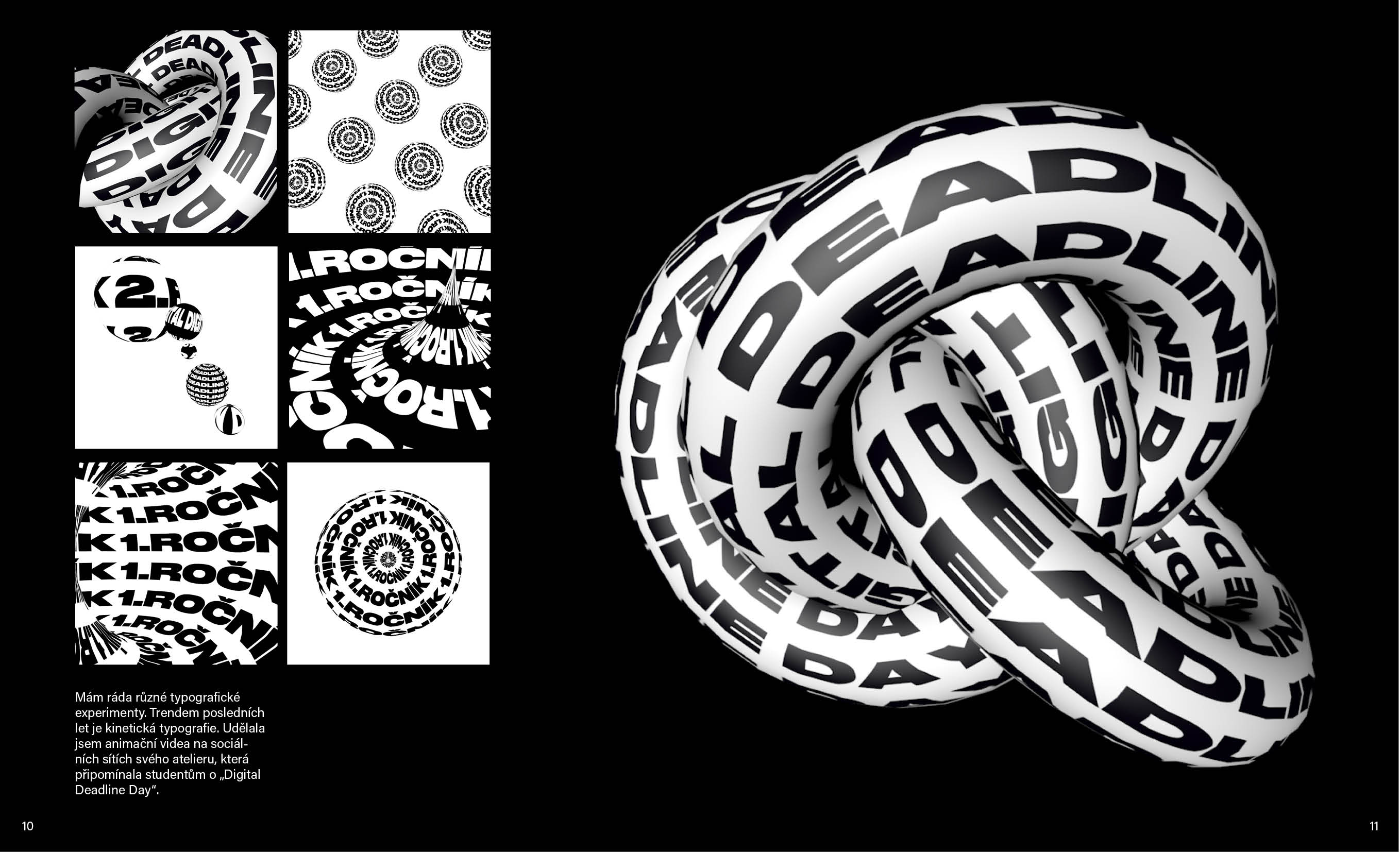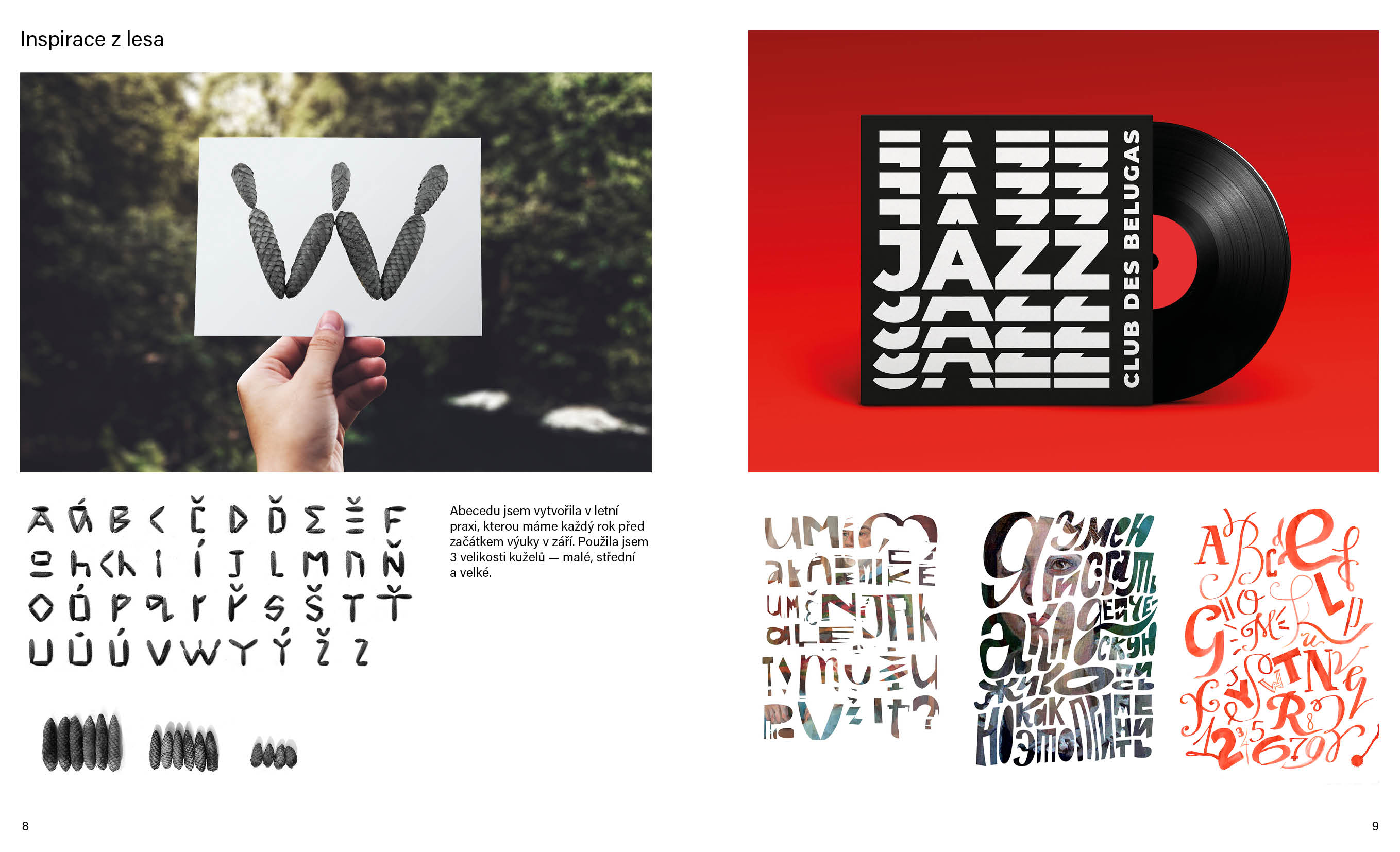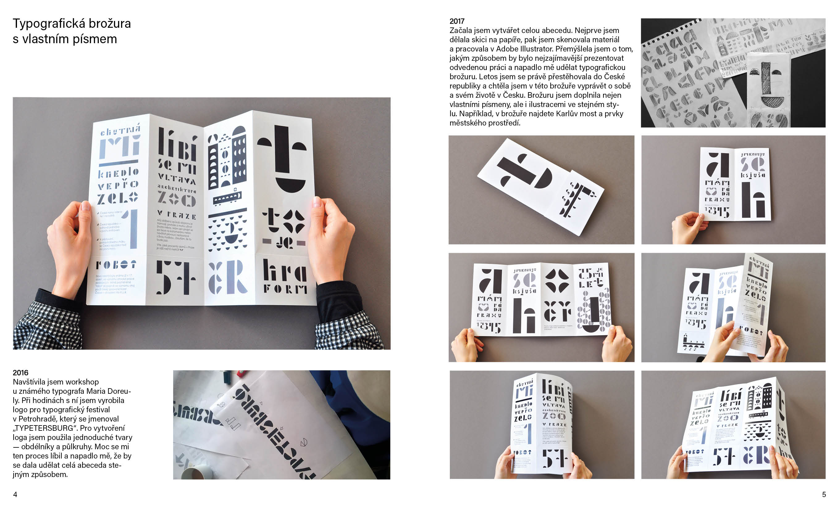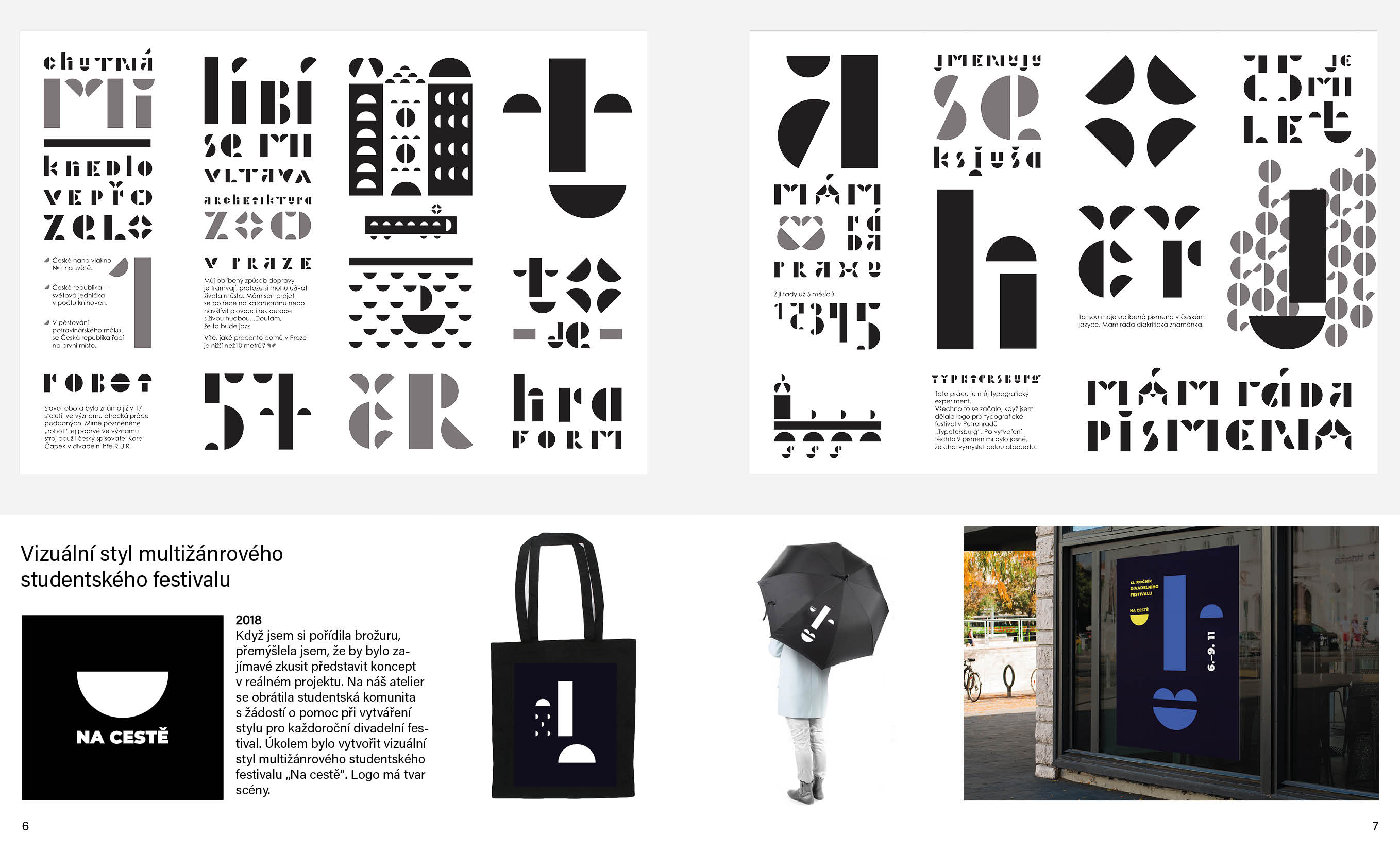 Cílem portfolia bylo, aby mě charakterizovalo jako kreativní designérku. Tady nejsou všechny mé práce, ale jen ty nejlepší. Do portfolia jsem zařadila náčrtky, typografické experimenty, popsala, jsem jak se projekty vyvíjely a jaké nástroje jsem použivala.